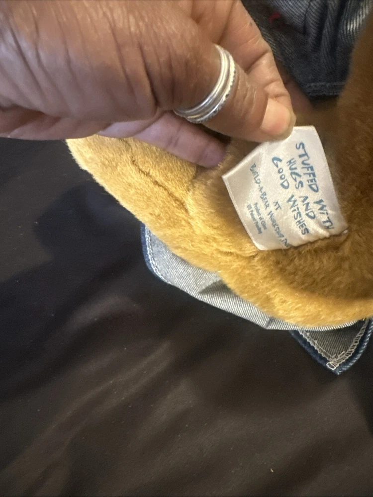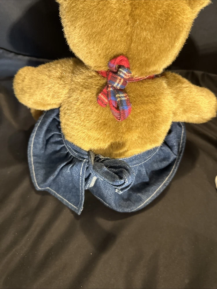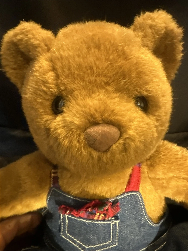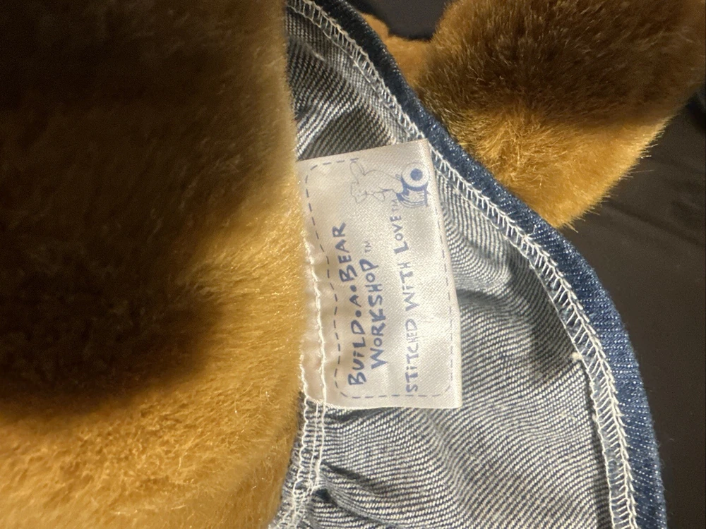 This vintage Build-A-Bear Workshop plush bear is a must-have for any collector or fan of the popular franchise. Measuring at 11-12 inches in height and made of soft, plush material, this bear is perfect for all occasions. It features a denim jumper, brown eye color, and a friendly expression that will melt anyone's heart. This licensed reproduction bear was manufactured in the United States in 1997, making it a true gem from the 1990s. It is a single unit, and unfortunately, it is not signed. But don't let that stop you from adding it to your collection! This rare and retired bear is perfect for display or cuddling.