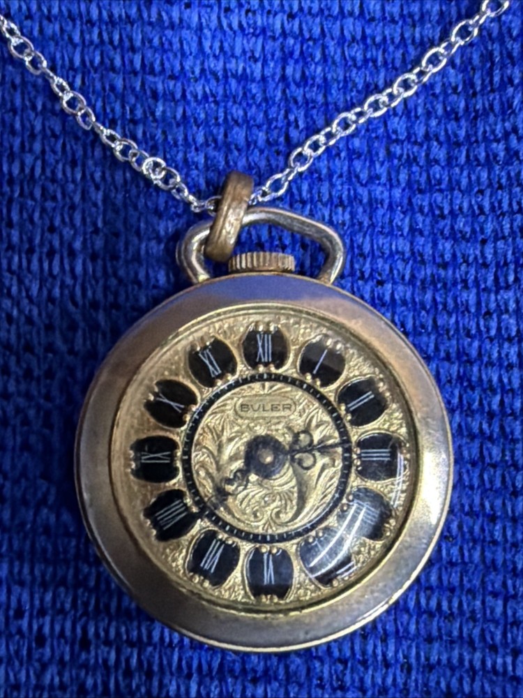 For sale is a beautiful, fully working vintage BULER ladies pendant watch from the late 1950s to early 1960s, now presented on a high-quality 925 sterling silver chain – ready to wear or gift. Brand: BULER (Swiss made) Movement: Manual wind, 15 jewels, keeps excellent time (recently tested – runs strong, winds smoothly) Case: Gold-plated bezel and highlights over base metal with gorgeous engine-turned floral engraving on the back Dial: Stunning original gilt dial with raised black enamel Roman numerals on oval cartouches, blued Breguet-style hands, sub-seconds at 6 Crystal: Original acrylic, light surface marks only Diameter: approx. 27 mm (not counting crown) Chain: Solid 925 sterling silver fine link chain, 18 inches (45 cm), stamped 925, polished and in excellent condition Total drop from top of bow to bottom of watch: about 9.5 inches Condition: Very attractive original vintage condition. Gold plating shows honest gentle wear on high points (mainly the bow and edges), but the engraving remains crisp and the dial is superb – no chips or cracks in the black enamel numerals. Hands and dial are original and untouched. The watch has been gently cleaned and is running beautifully. This is a complete and ready to wear as a necklace – no need to hunt for a chain! The combination of the ornate Art Deco-inspired watch with the classic sterling silver chain gives it a timeless, elegant look that works with both casual and dressy outfits. Ships quickly and securely packaged. 30-day return privilege for peace of mind. Thanks for looking and happy bidding!