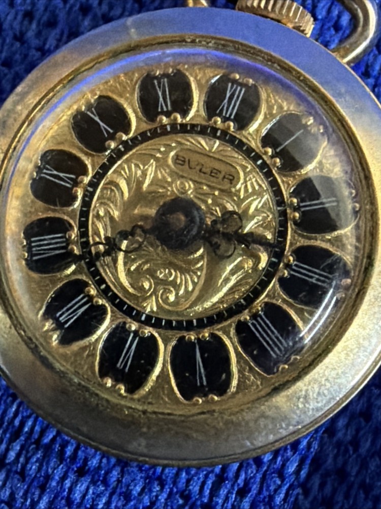 With Papers: No Water Resistance: Not Water Resistant With Original Box/Packaging: No Indices: Roman Numerals Features: 12-Hour Dial, Sub Seconds, Roman Numeral Year Manufactured: 1950-1959 Department: Women Case Material: Silver Dial Color: Yellow Gold Type: Pocket Watch Movement: Mechanical (Manual) Pocket Watch Size: 6/0 Display: Analog Case Color: Yellow Gold Style: Dress/Formal Brand: Buler