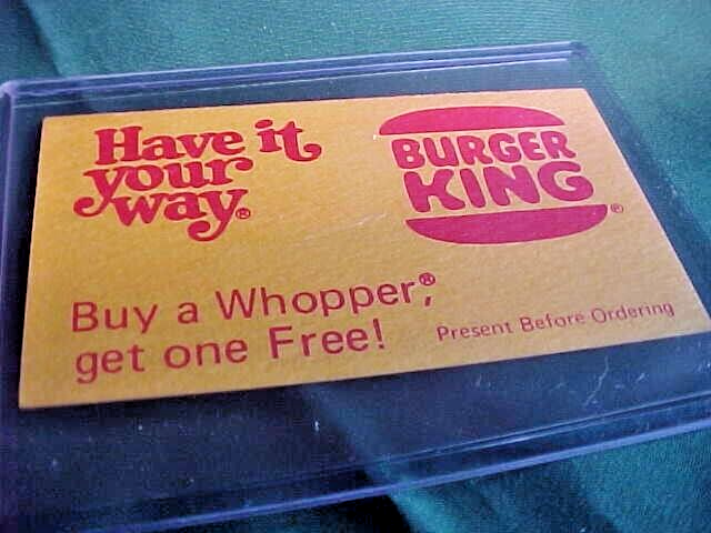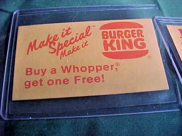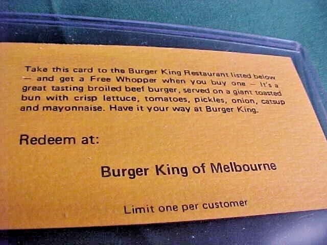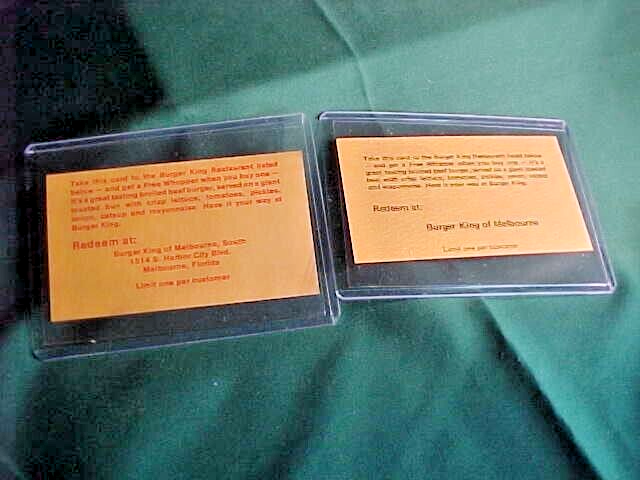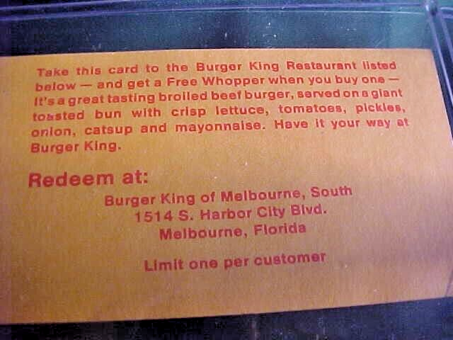 This listing is for two Burger King Whopper coupons from Melbourne, Florida. One is from the 1970's the other from the 1980's. They measure 3 1/2" by 2". They are originals not reproductions. Great collectibles. See photos for more details and conditon.