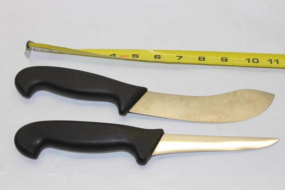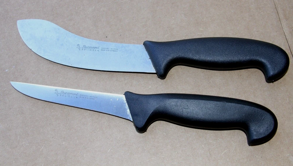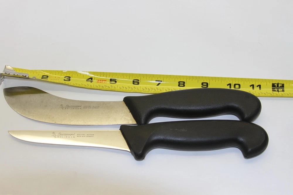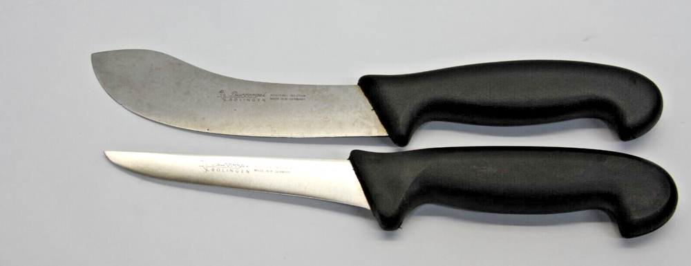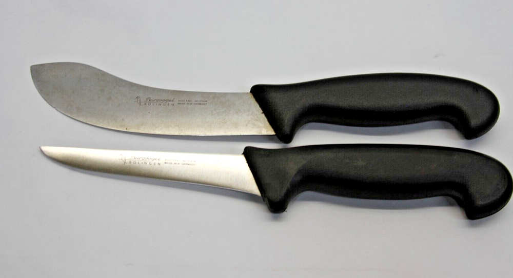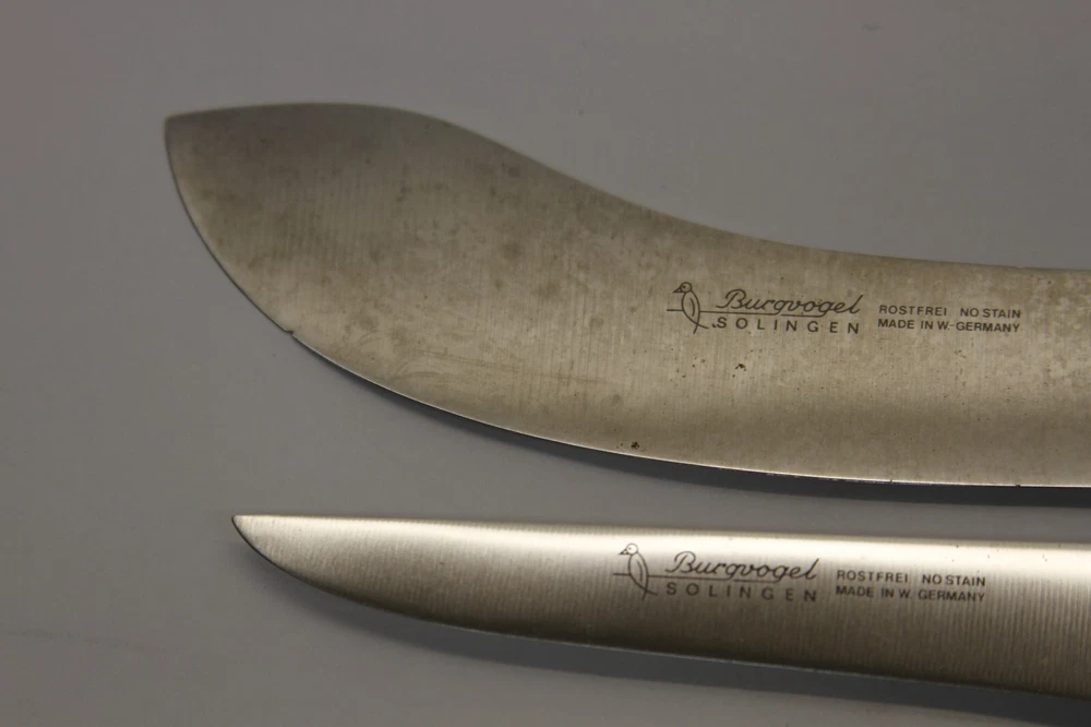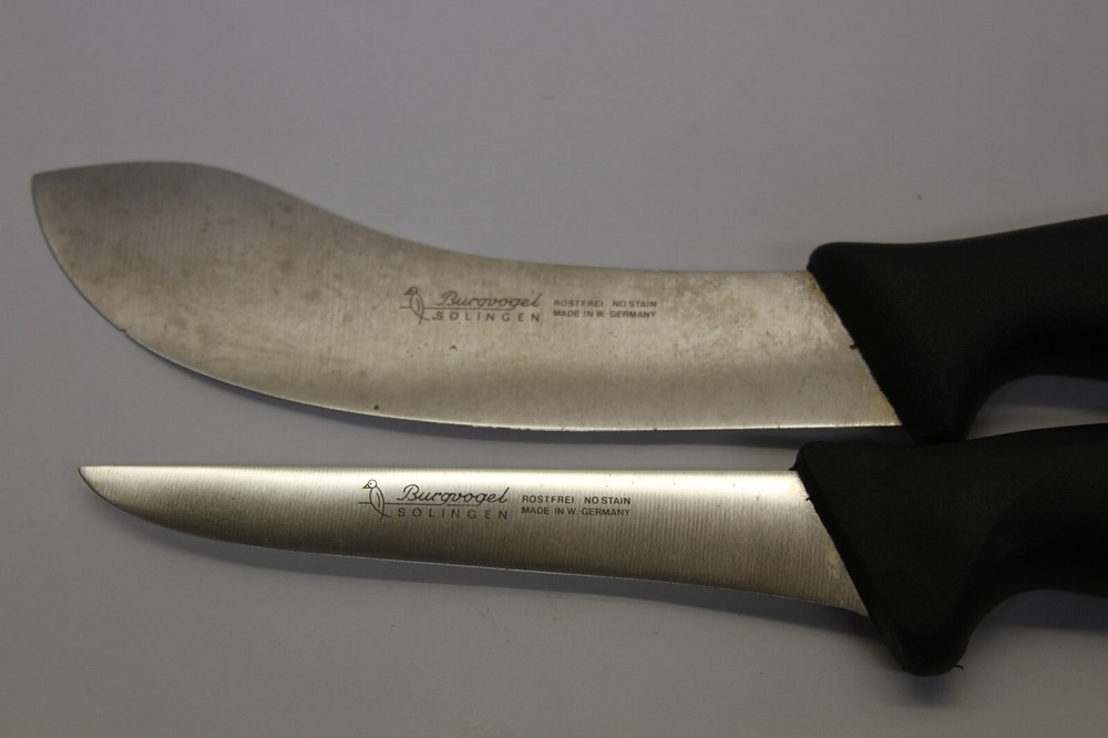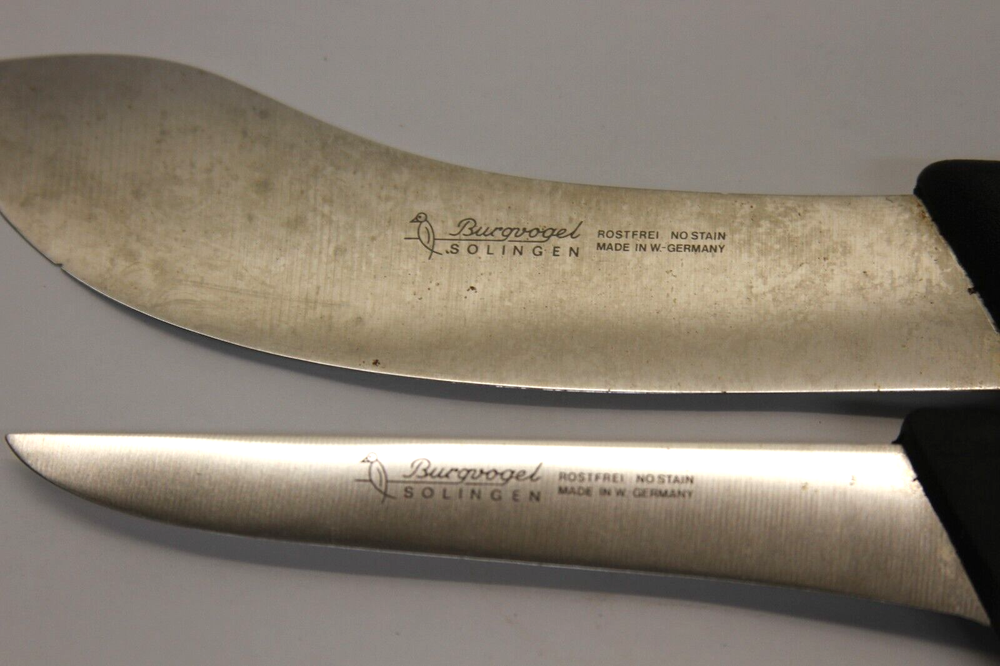 S/2 Vintage Burgvogel Solingen Rostfrei Knives - W Germany Set includes: Fillet Knife w/5" Blade Skinning Knife w/5-1/2" Blade Made in WEST GERMANY Condition: Filet - Very Good Used - sharp edge - a little discolored but should clean up with some extra care Skinning - Good Used - discolored, dull edge and tiny chip on edge but should be able to work it out and clean up with extra care -see all pictures for details SEE DESCRIPTION AND ALL PHOTOS FOR DETAILS AS - SEEN - you will receive the item in the pictures THIS IS AN AS-IS - NO RETURNS - NO REFUNDS SALE - ALL SALES ARE FINAL