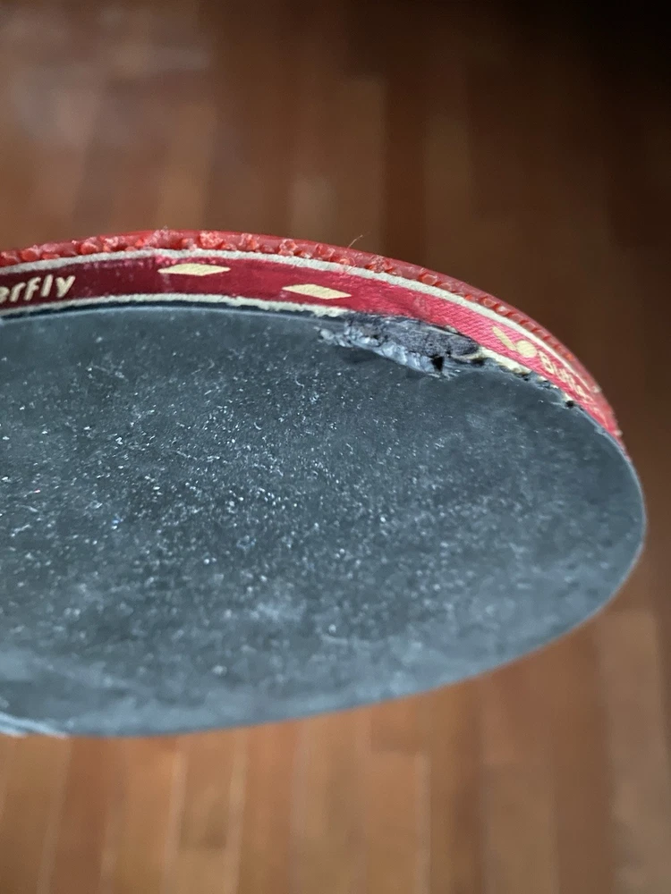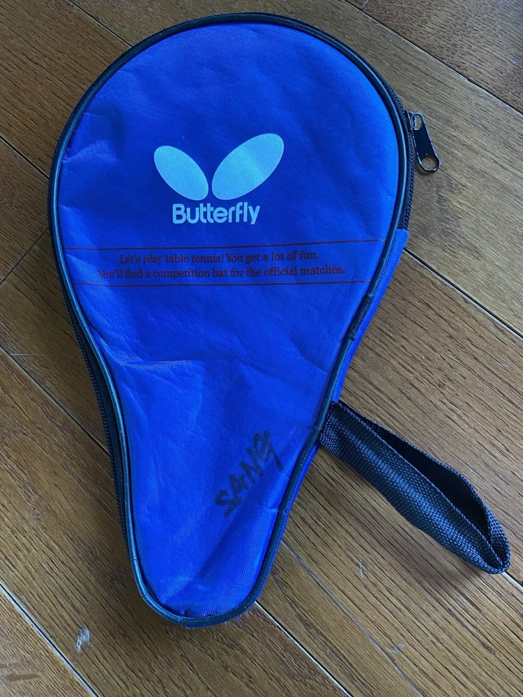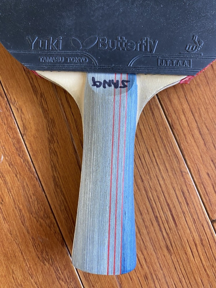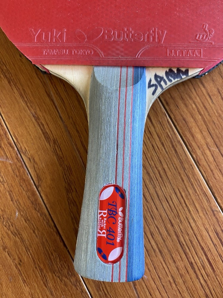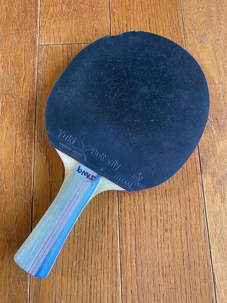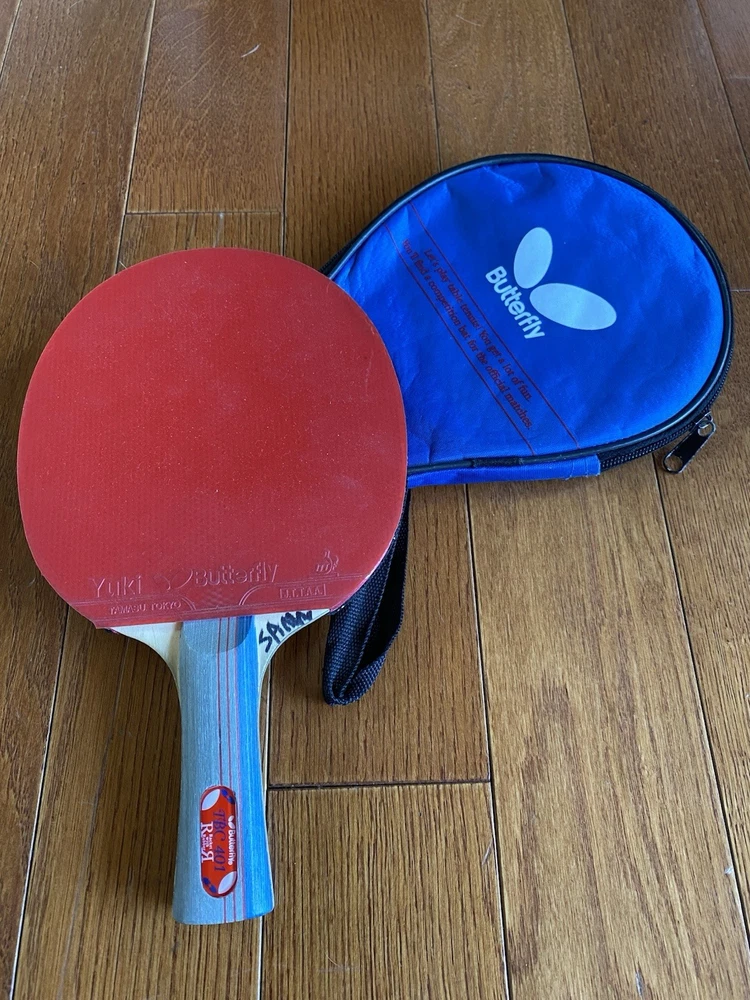 Vintage “Butterfly” Table Tennis Paddle. Yuki “TBC 401”. Tamasu Tokyo. Used. Comes with “Butterfly “ protective case. Case does have writing on it as well as a stain on the back, but the zip is in good working order. Paddle is in great condition! Just a small portion on the edge of the black rubber side of the paddle is missing. The red rubber side of the paddle is in perfect condition! The handle is in good condition also. There is, however, writing on it.