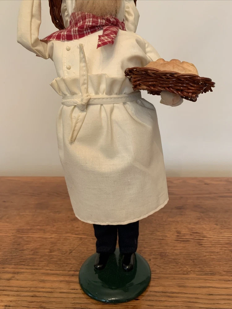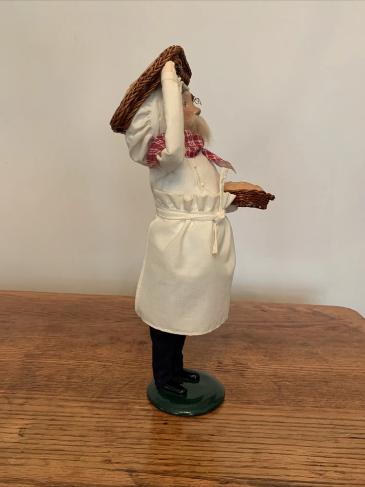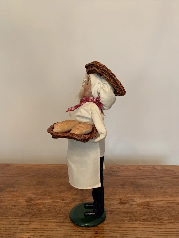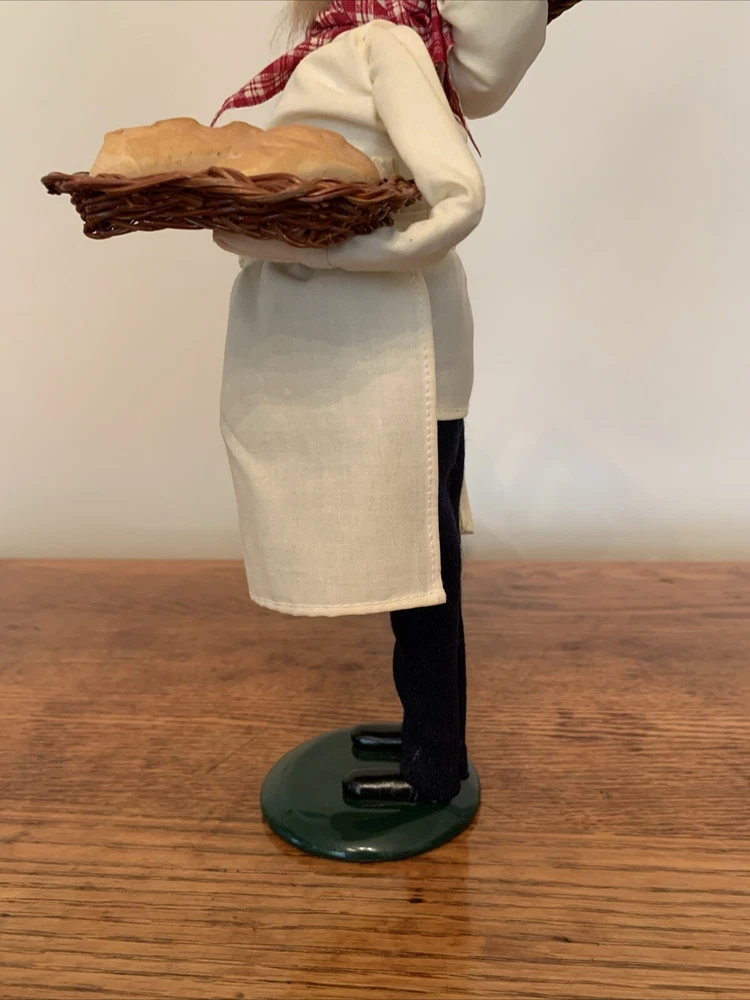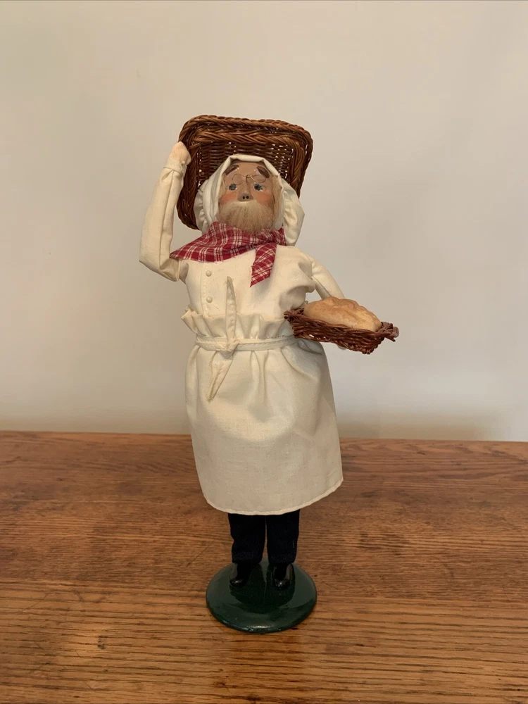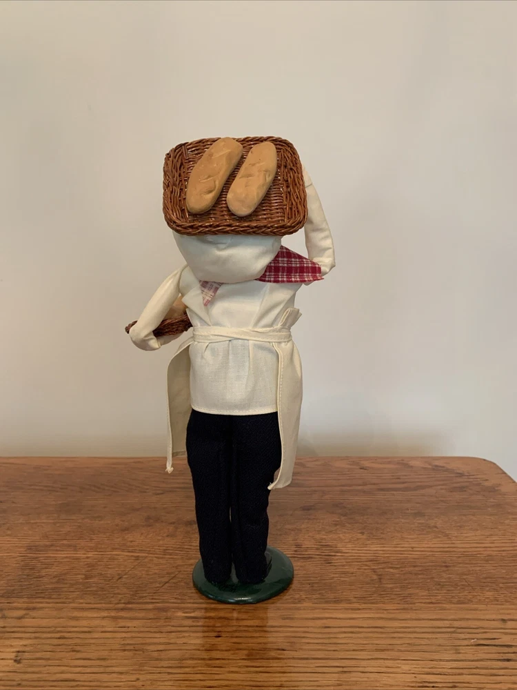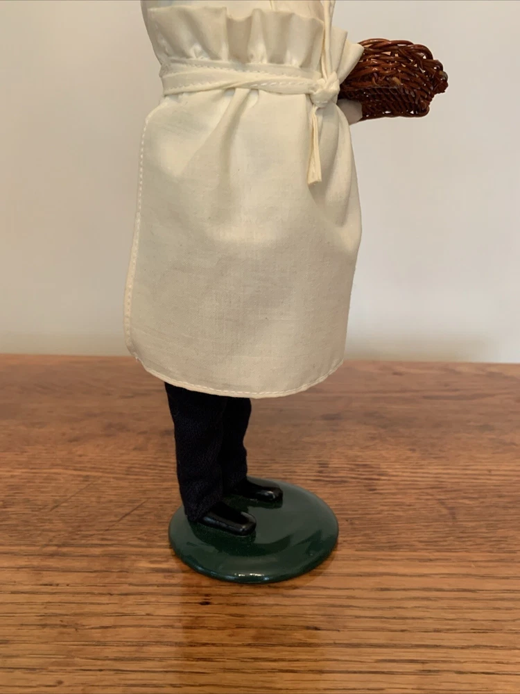 Vintage Byers’ Choice baker is in good used condition. He carries a basket of bread on his head and side. Please note there is some wear on the base. There are also a few imperfections on the top of the base. See photos.