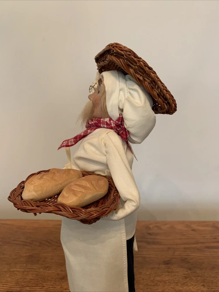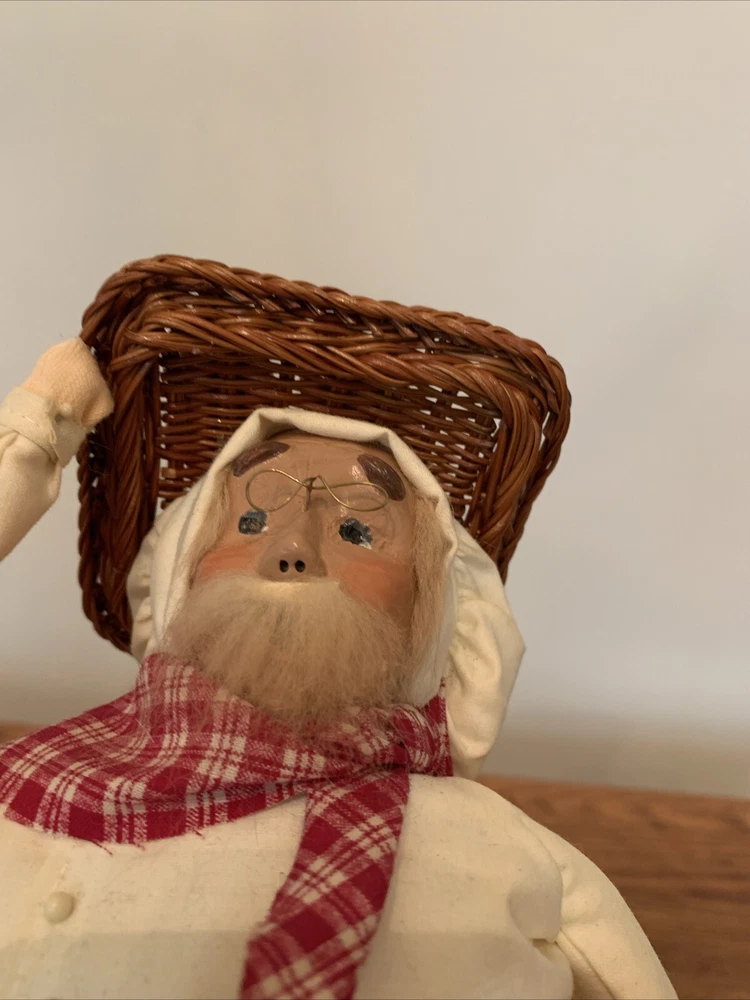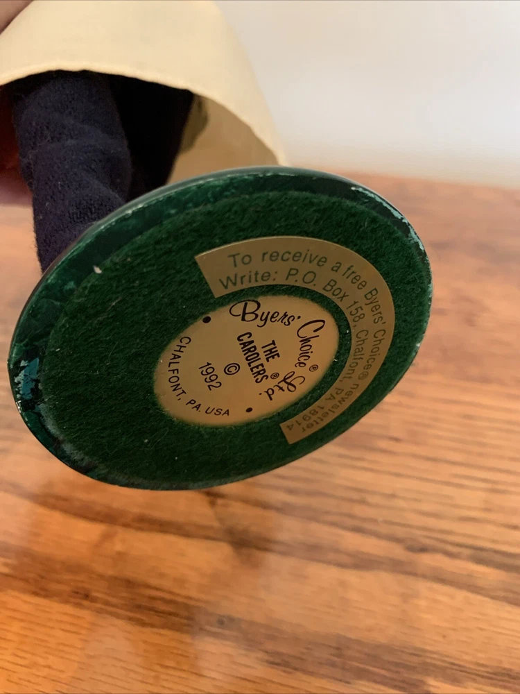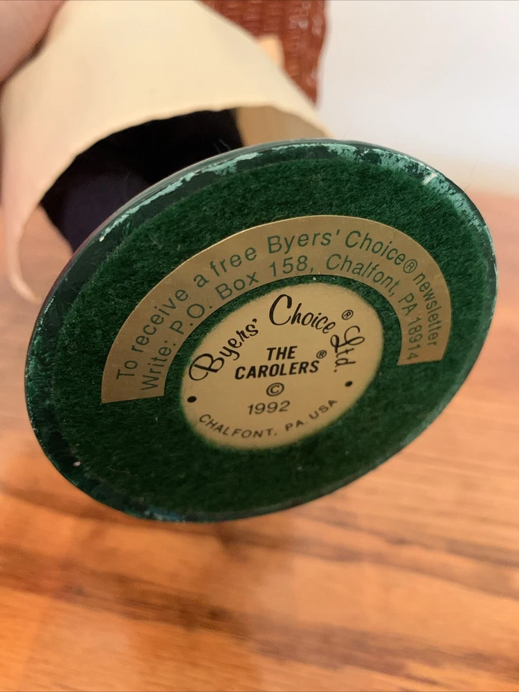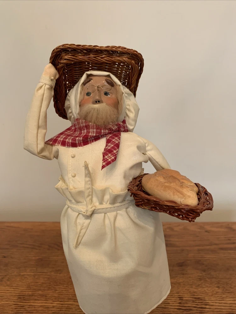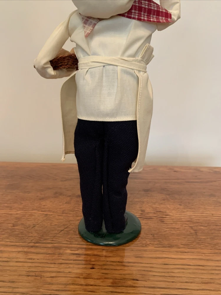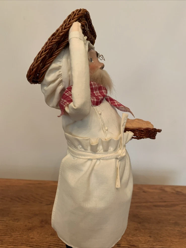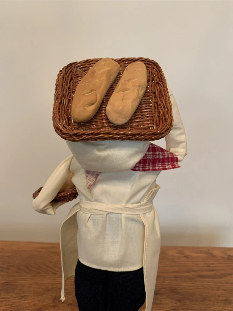 Vintage Byers’ Choice baker is in good used condition. He carries a basket of bread on his head and side. Please note there is some wear on the base. There are also a few imperfections on the top of the base. See photos.