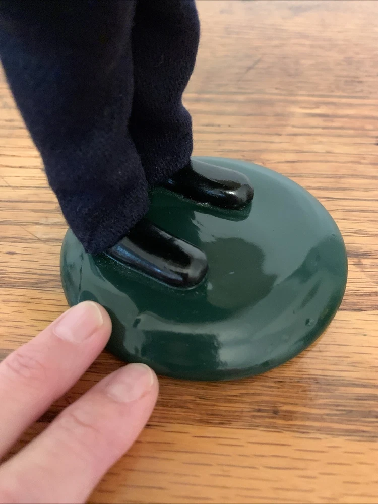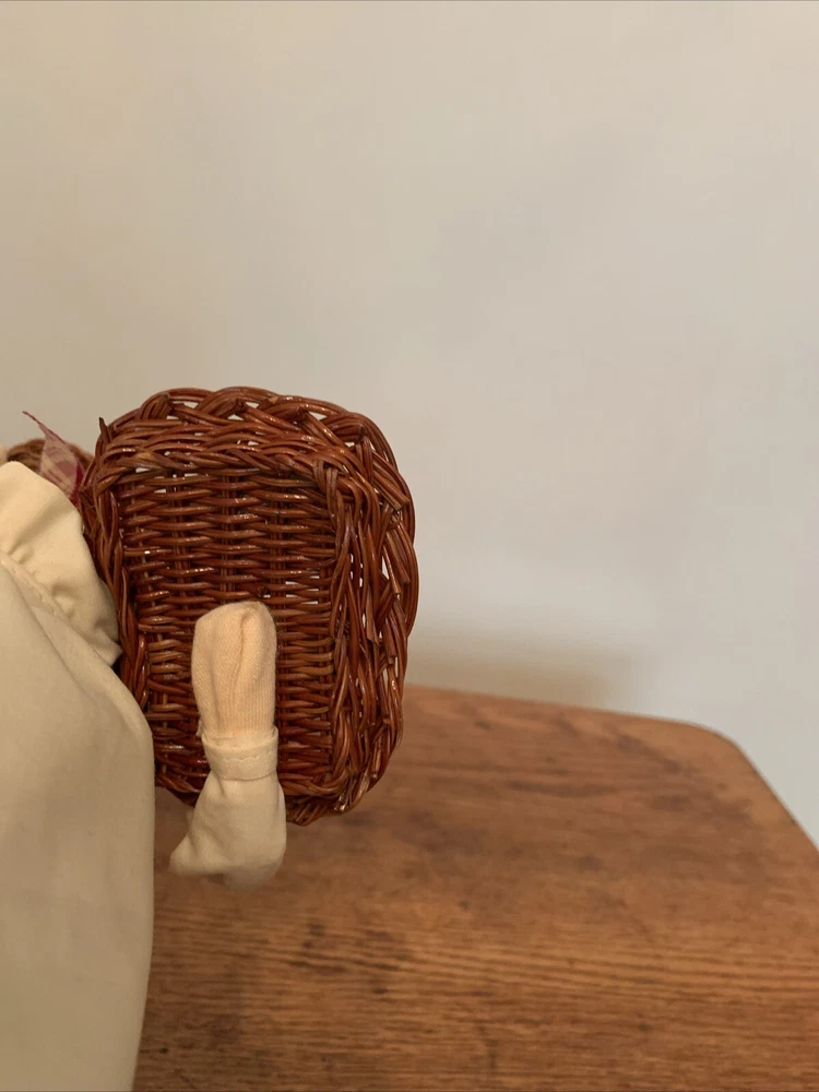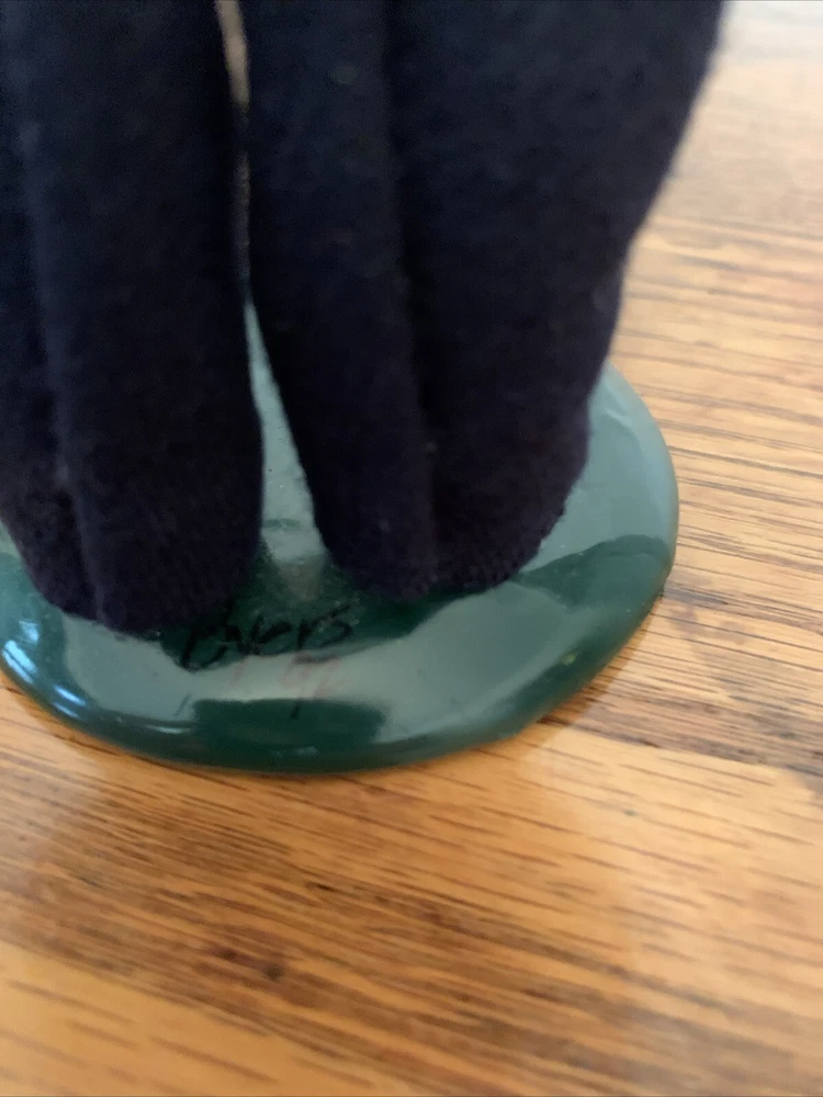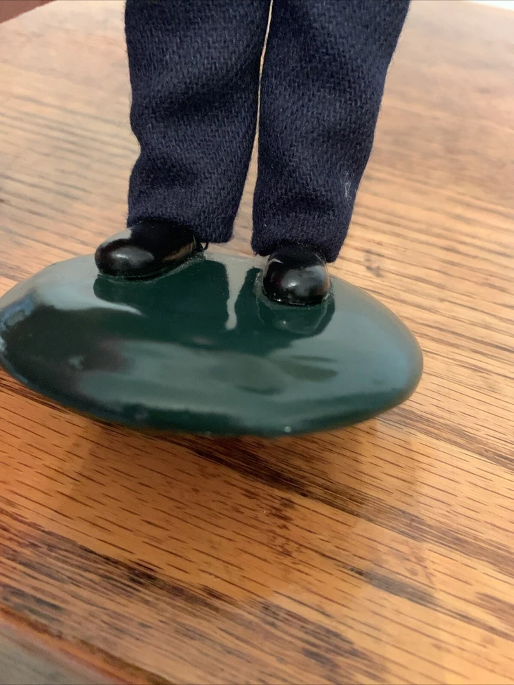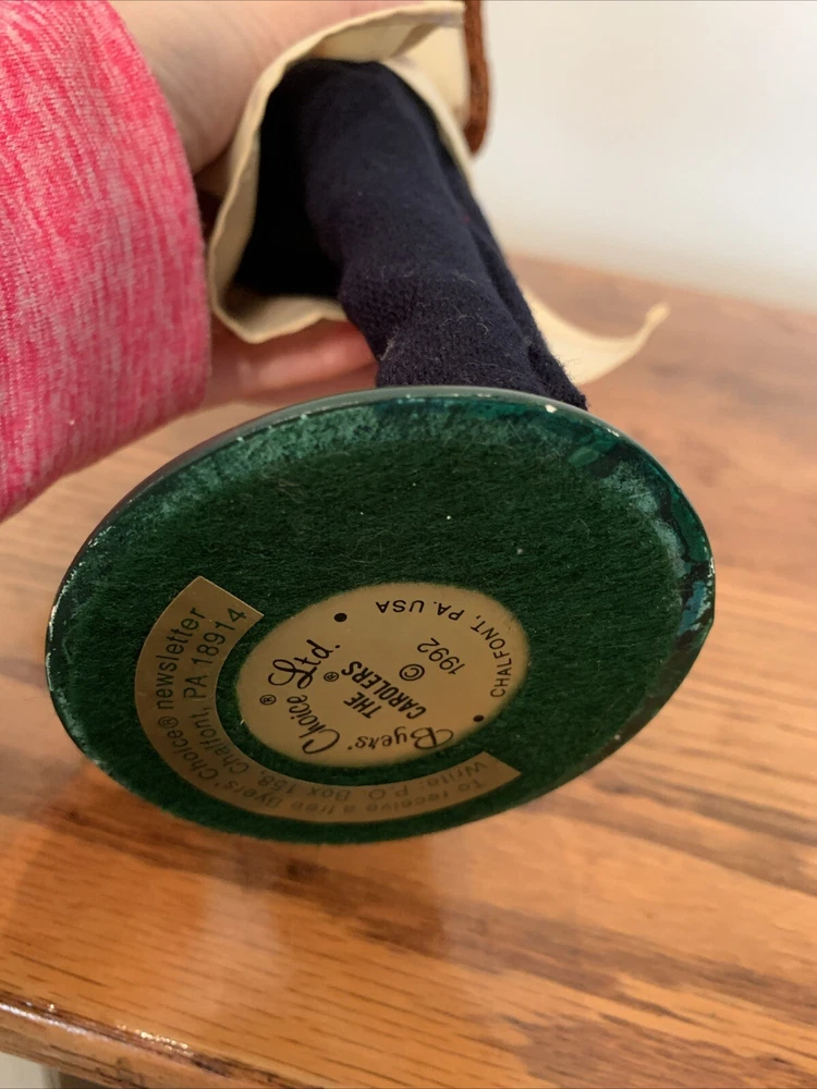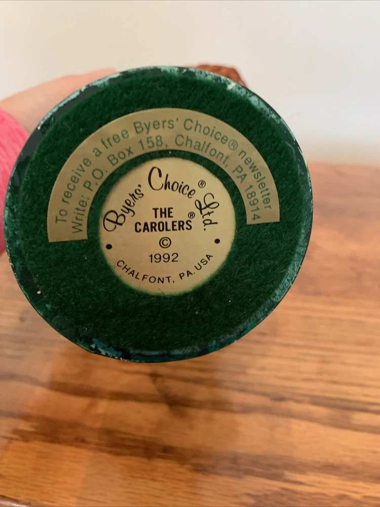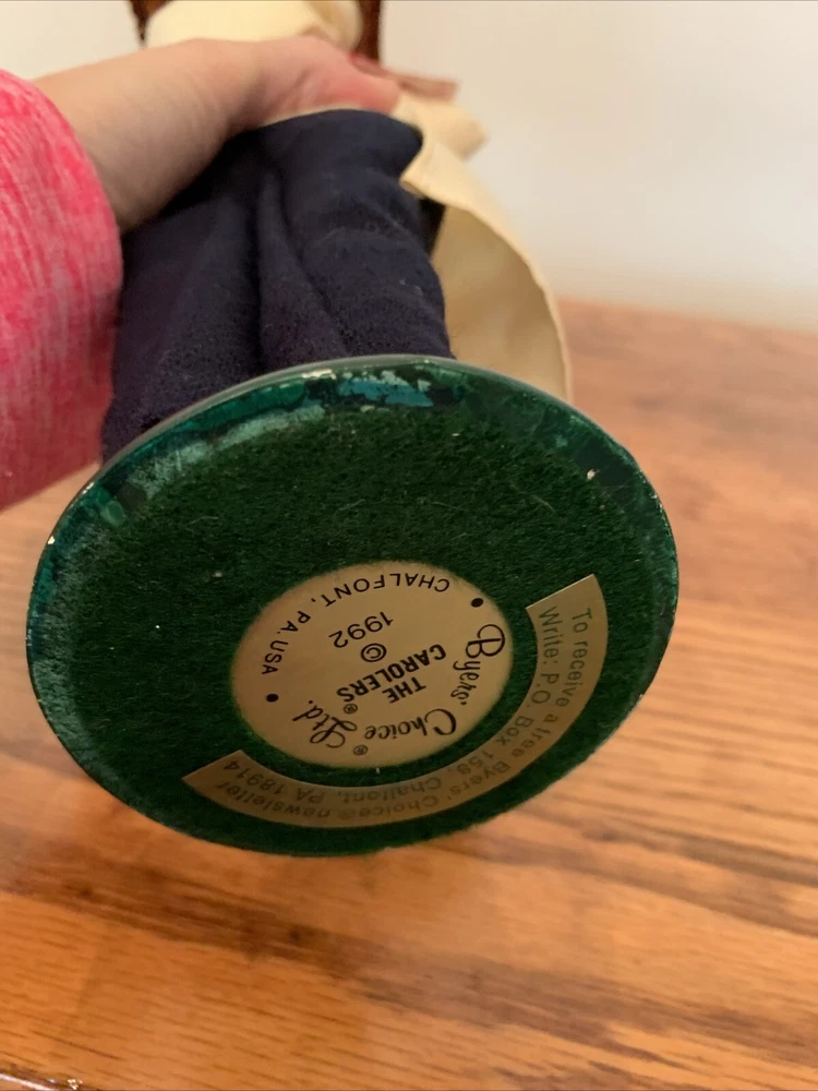 Vintage Byers’ Choice baker is in good used condition. He carries a basket of bread on his head and side. Please note there is some wear on the base. There are also a few imperfections on the top of the base. See photos.