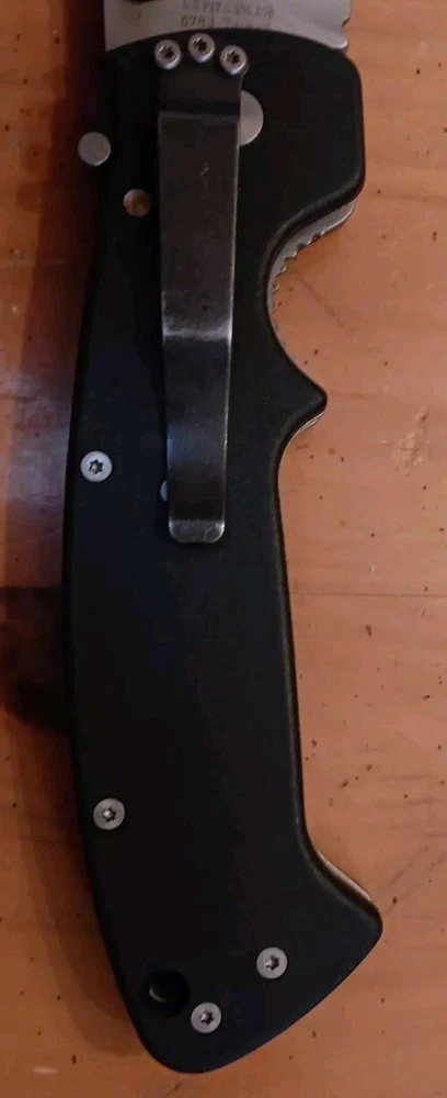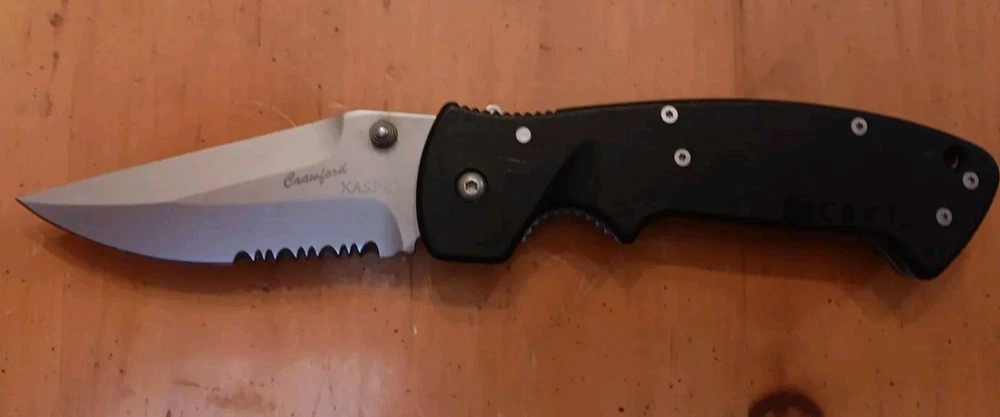 VTG TAIWAN COLUMBIA RIVER CRKT CRAWFORD KASPER LARGE FOLDING POCKET KNIFE. This is the large version 6783 that was made in Taiwan. This feature packed tactical knife, designed by writer and knife use instructor Bob Kasper and knife maker Pat Crawford, is a serious self-defense folder built to satisfy under the most serious situations. Thick stainless liners covered with black Zytel® scales give this knife a very hefty feel. A thumb scallop on each side leads to the thumb stud for easier opening and more secure grip. An integral part of this tactical folder is the patented Lake & Walker Safety (LAWKS). Located at the top front of the knife, the LAWKS mechanism insures that the blade will remain locked under heavy cross stress. The lock is a Walker-Lock secured by the LAWKS safety.