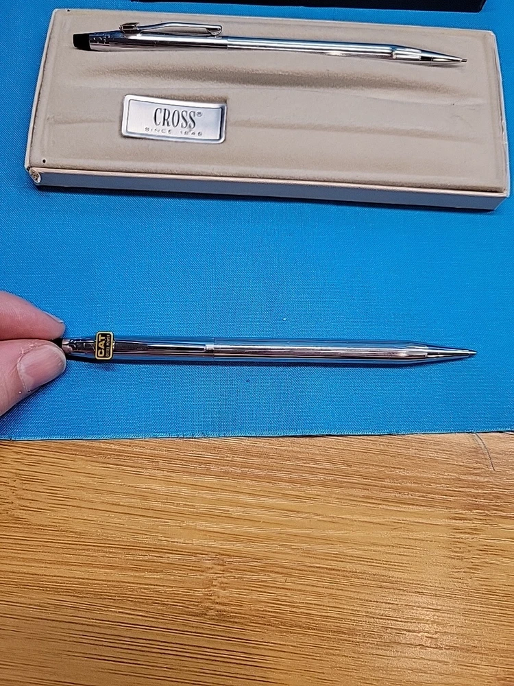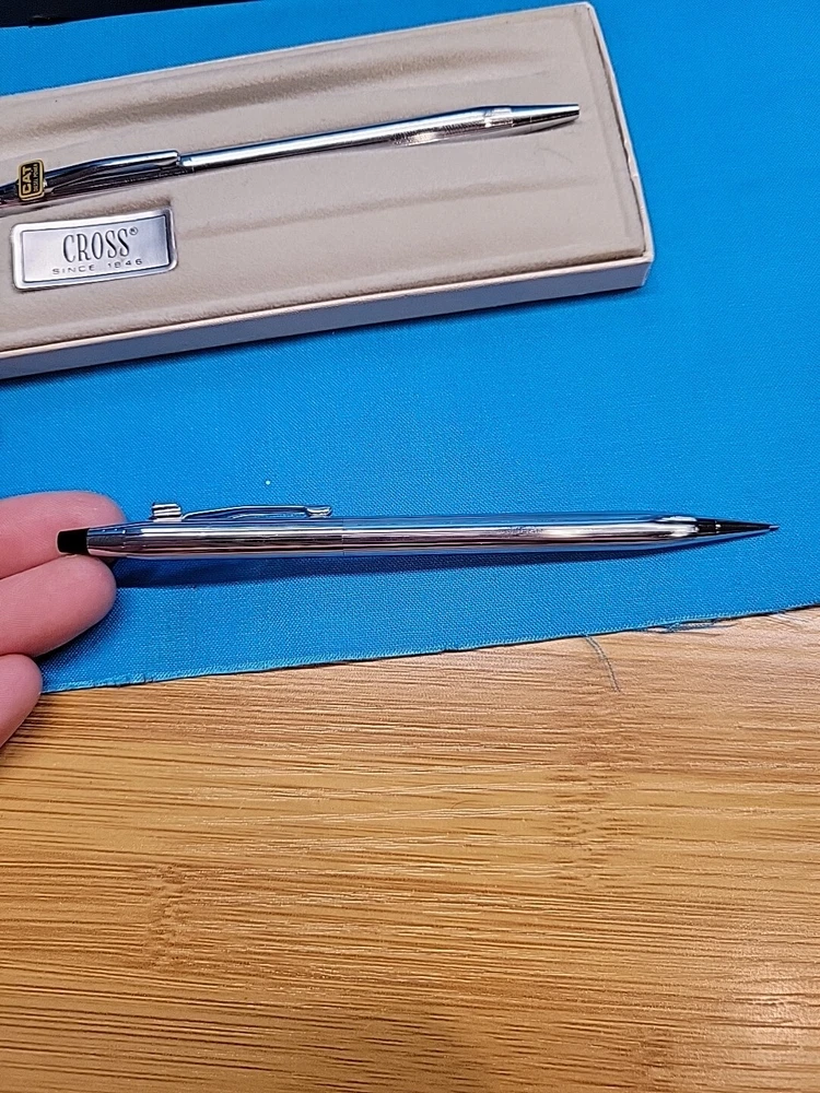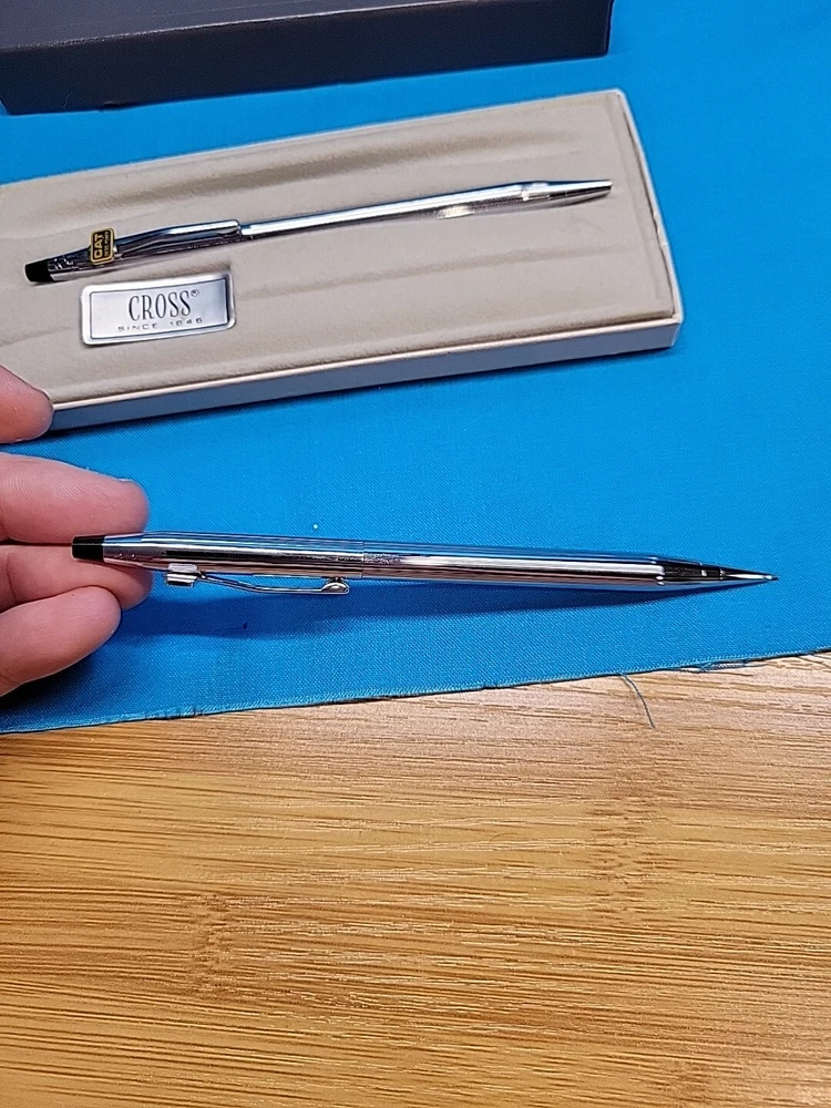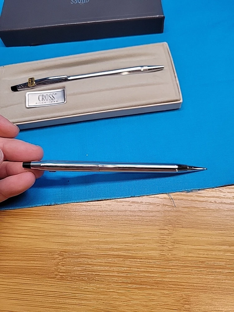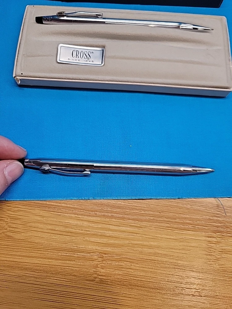 This vintage CROSS Chrome 3501 Pen Pencil Set features a classic design with a sleek black finish. The set includes a pen and pencil, both of which are crafted with high-quality materials. The brand name "Cross" is synonymous with quality, and this set is no exception. The set is perfect for collectors or anyone who appreciates a classic design. It's also a great gift for anyone who loves writing or art. With its timeless design, this set is sure to become a staple in any collection. I believe these are new in box, but since I'm not sure, I listed as used! Please see images for condition details!