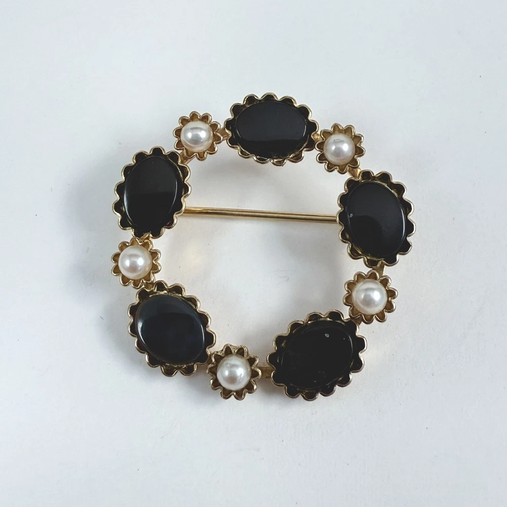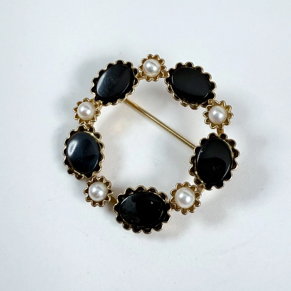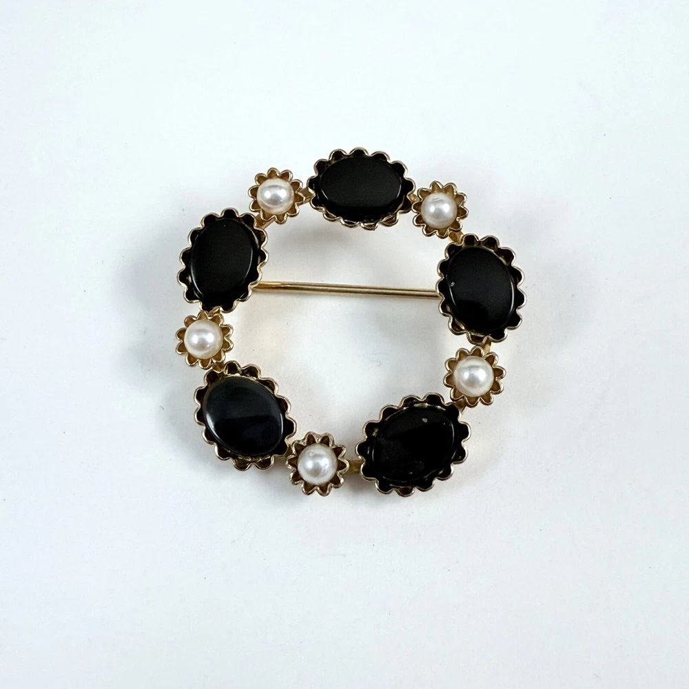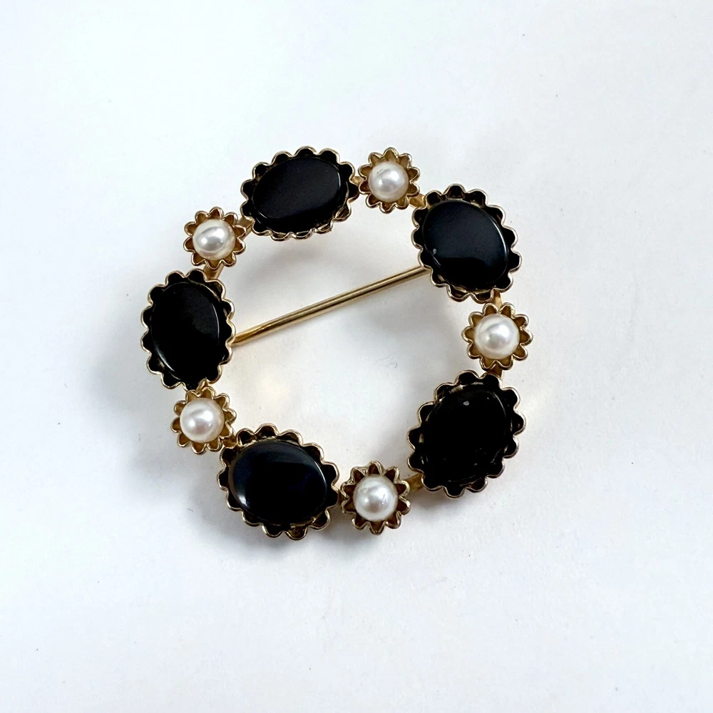 Vintage CURTIS JEWELRY DEC Black Onyx & Faux Pearl 1/20th 14K Gold Filled Brooch. Pre-Owned Estate Jewelry in Very Good Condition. Ready to wear, give as gift or add to a collection. Our Vintage items are mostly from estate sales and vary in age from 100+ years old to more modern pieces. Please use your judgement. Items are photographed on a measuring matte with one-inch squares to give you an idea of size. Any photography props / holders you see are not included.