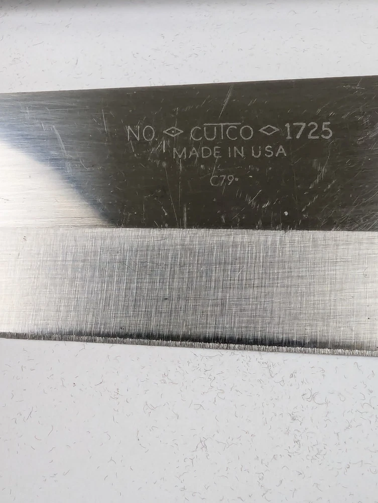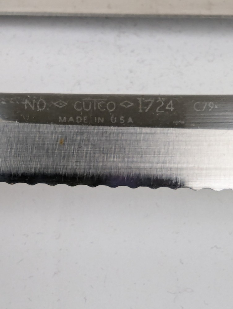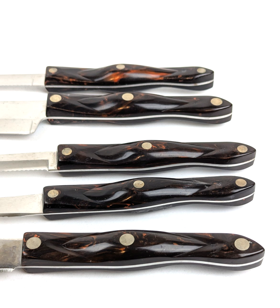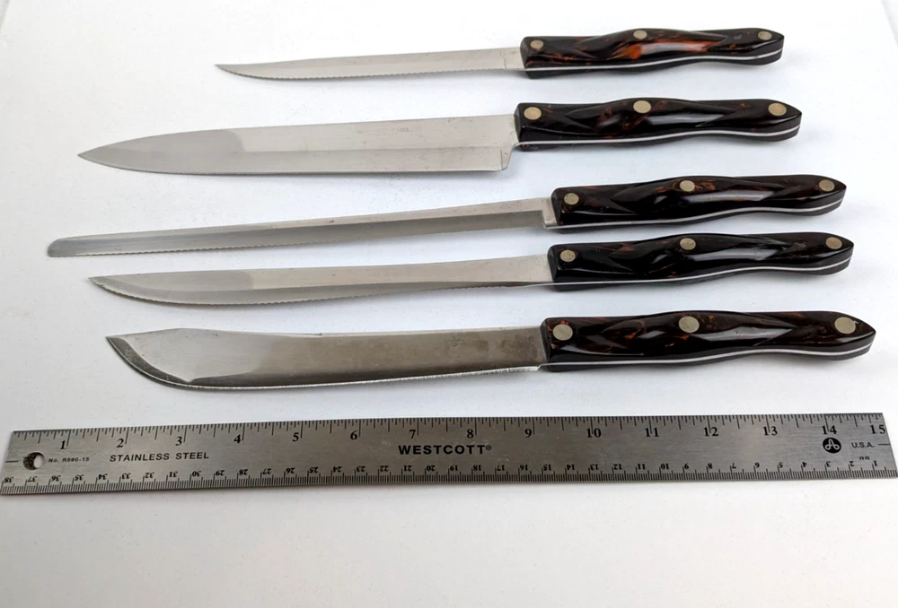 Set of FIVE Vintage CUTCO Knives with the brown and orange swirl handles. Made in USA with a Forever Guarantee from CUTCO Handles are embossed with TL signature initial for Thomas Lamb and the patent number for the classic handles 3122774 Set includes: 1722 Butcher Knife 1723 Carver 1724 Slicer 1725 French Chef Knife 1729 Small Carver All in good used condition. SEE PHOTOS