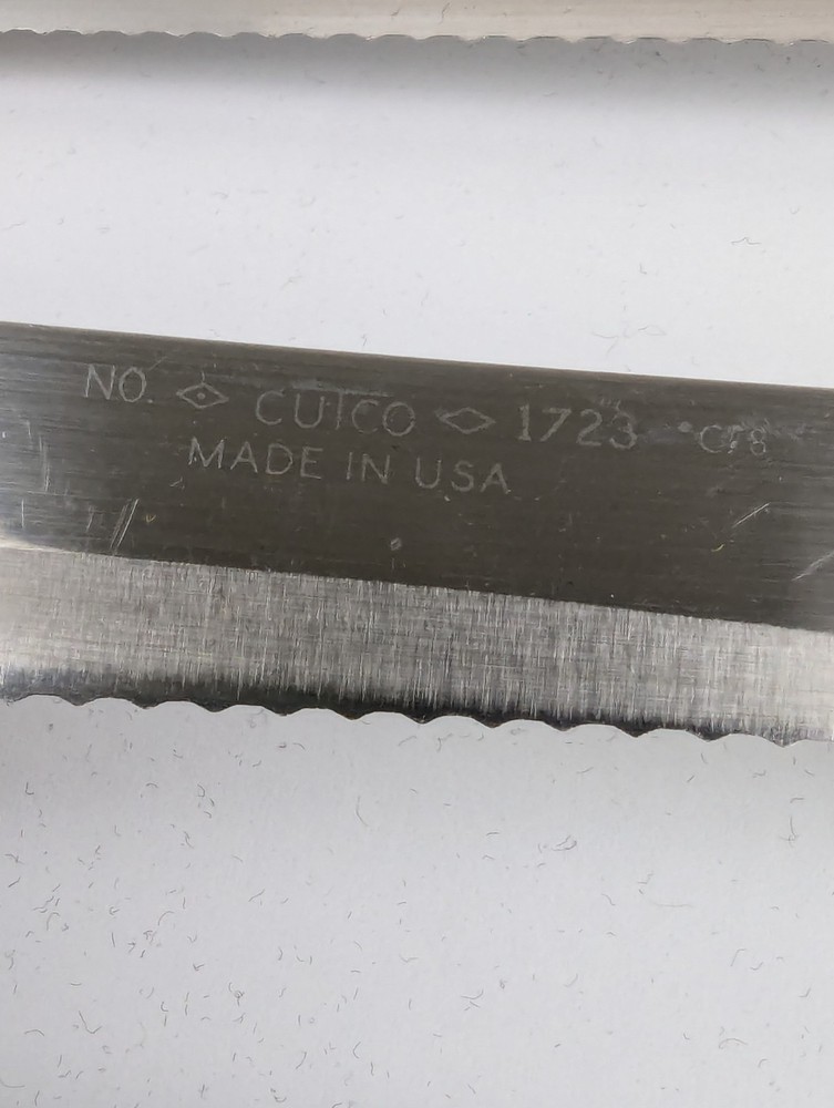 Set Includes: Boning Knife, Bread Knife, Butcher Knife, Cake Knife, Carving & Slicing Knives, Chef's Knife, Knife Set Brand: Cutco Color: Brown and Orange Marble Country/Region of Manufacture: United States Type: Knife Set MPN: 1722 1723 1724 1725 1729 Number of Items in Set: 5 Seller Notes: “Good Used Condition with T. Lamb Signature Swirl Handles with Patent Number” Material: Marble