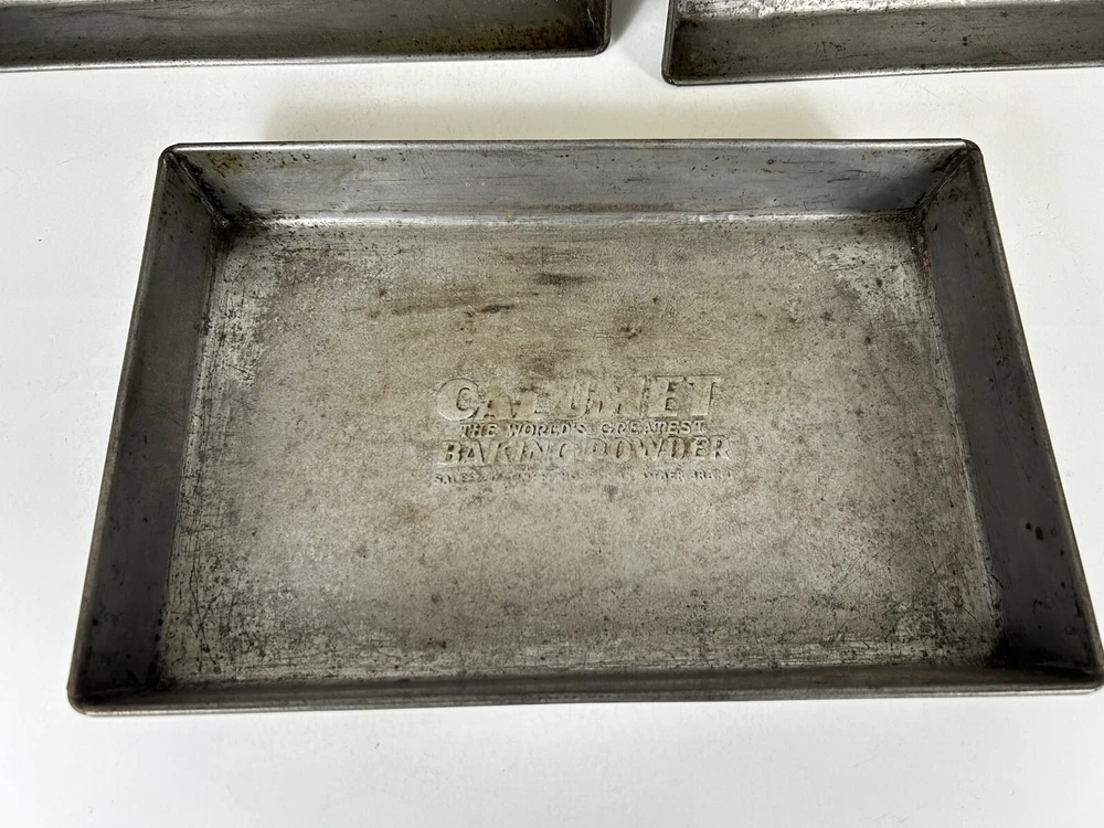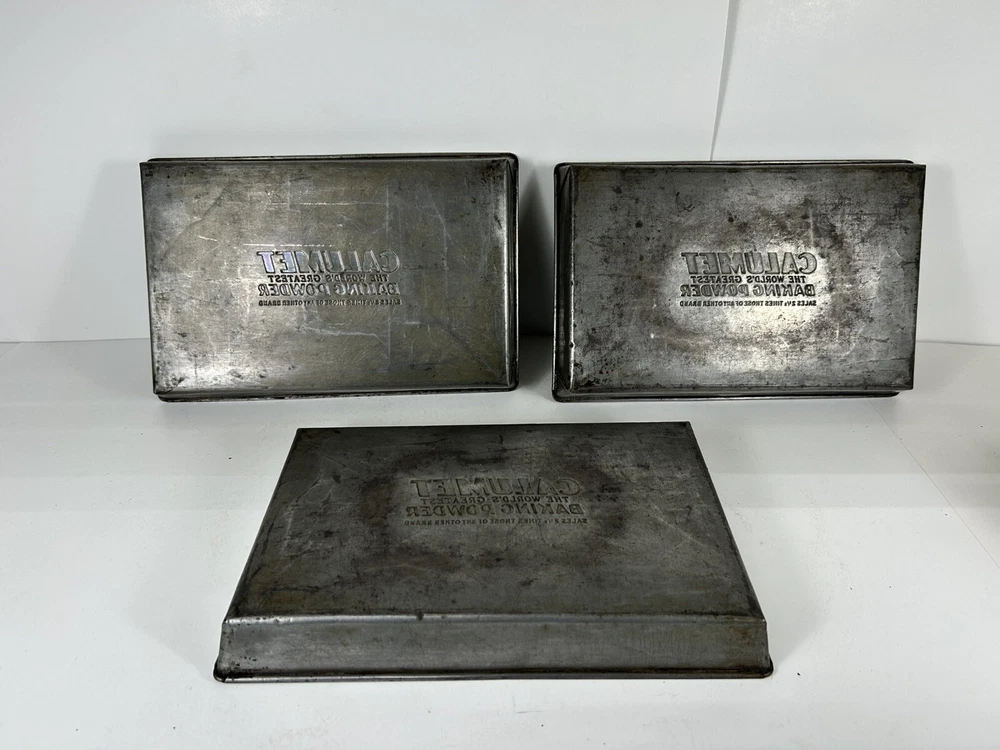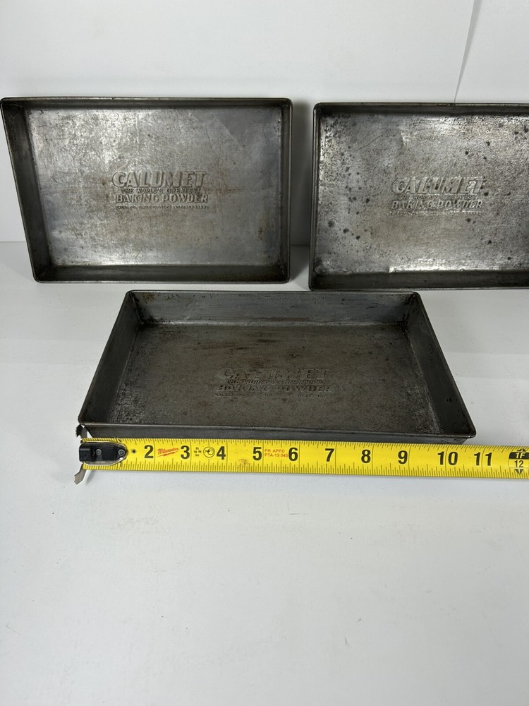 The product is a lot of three Calumet Baking Powder Tin Pan Cookie Sheets, each measuring 11x7 inches. These cookie sheets are used for baking and are adorned with advertising for Calumet Baking Powder. They are collectible items that reflect the theme of Bakery & Baking, making them a unique and nostalgic addition to any collection related to baking or vintage advertising. U2-S3-1-25