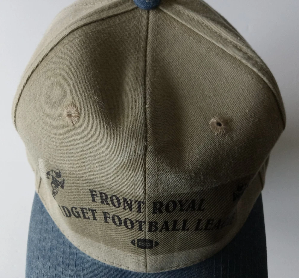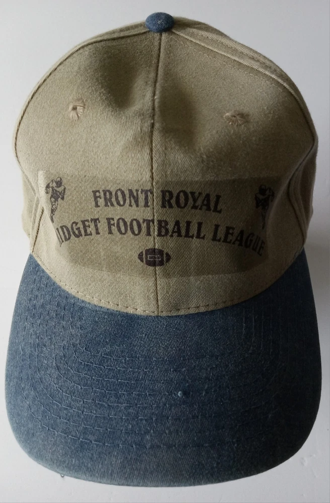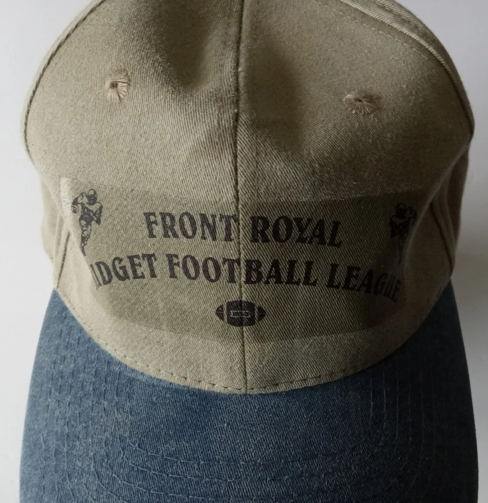 Vintage Strap Back Adjustable Hat with Clip. The hat is canvas hat, blue and tan with Font Royal Midget Football League Logo on front of hat. The hat is in good condition with no major marks, stains, scratches, torn or missing parts. Additional photos upon request. Hat will be shipped in safe and secure packaging.