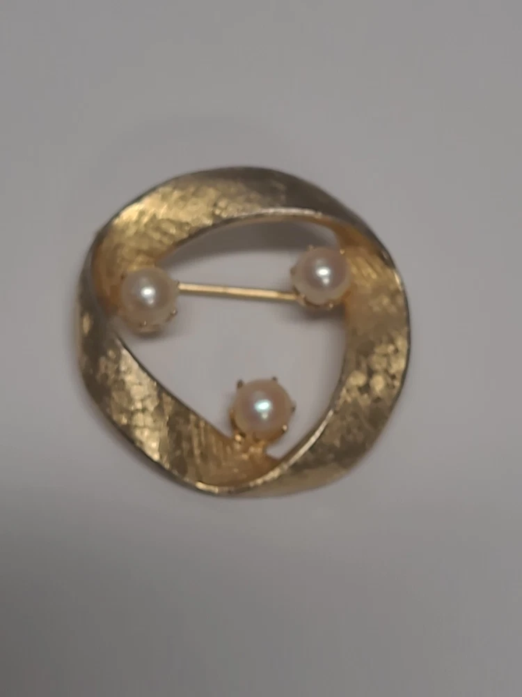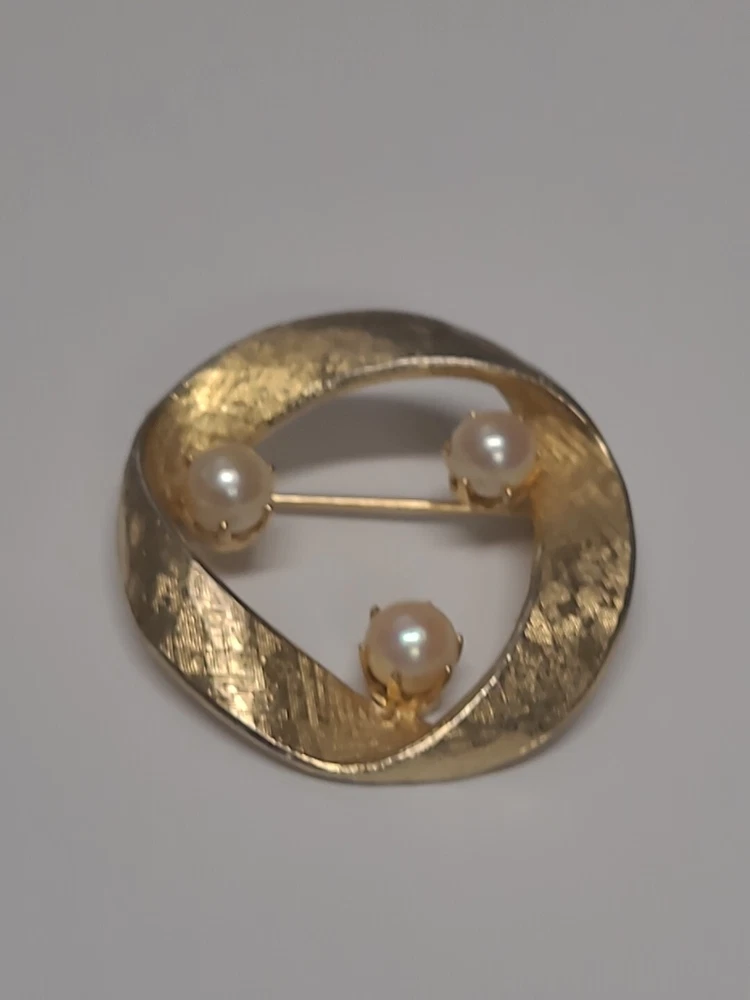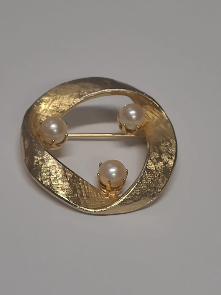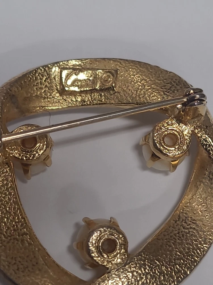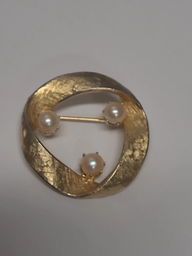 Add a touch of vintage glamour to your outfit with this stunning Capri Brooch Pin. The beautiful Goldtone twisted circle design is complemented by faux pearls, making it the perfect accessory for any occasion. This brooch is signed by the brand, ensuring its authenticity. With its elegant design and classic look, this brooch is ideal for Christmas, anniversaries, birthdays, or any special event. The vintage feel will add a unique charm to any outfit, making it a must-have for any jewelry collection.