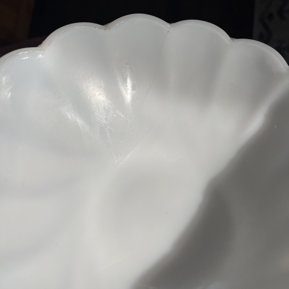 This vintage serving bowl from Hazel-Atlas is a beautiful addition to any collection. The Capri Swirl pattern, made of milk glass, is sure to impress. Measuring 9 inches in diameter, it's the perfect size for serving your favorite beverages or dishes. One some crack, see photos