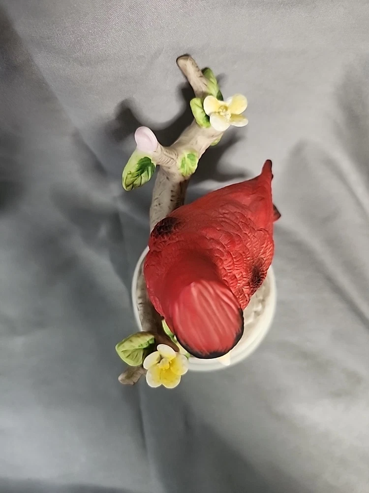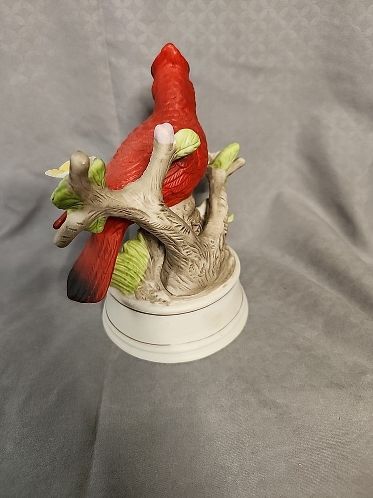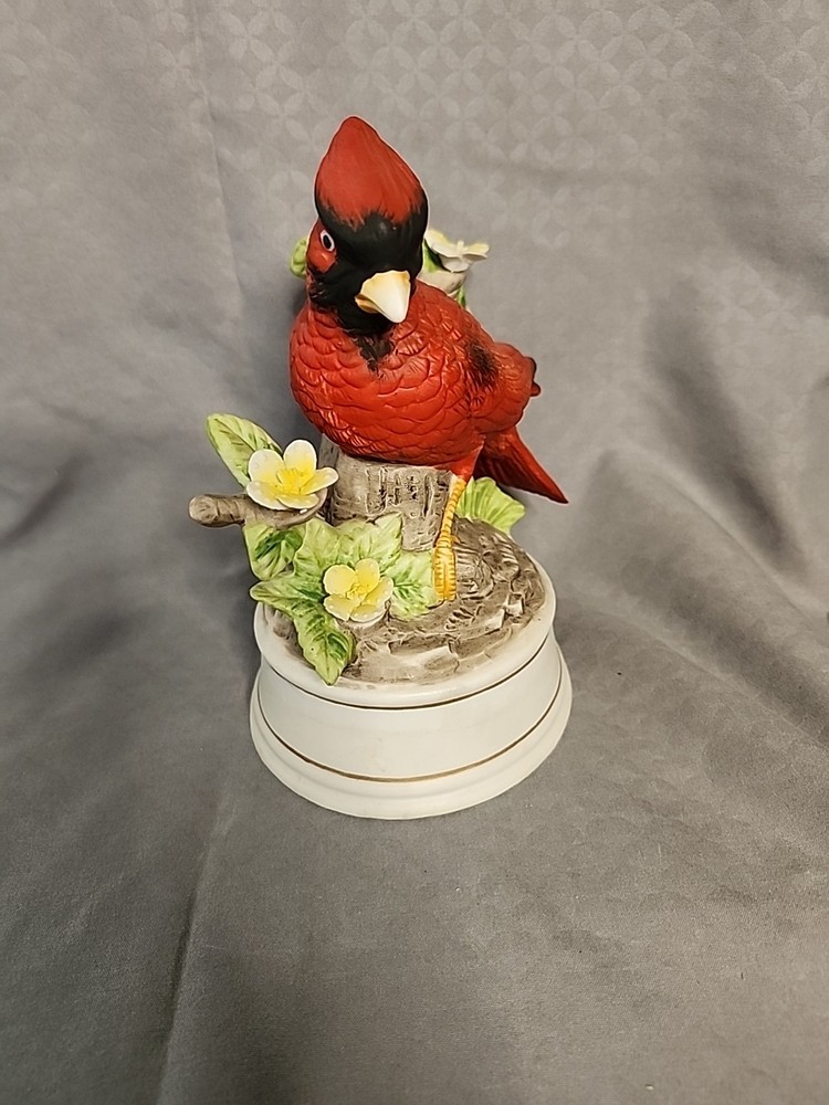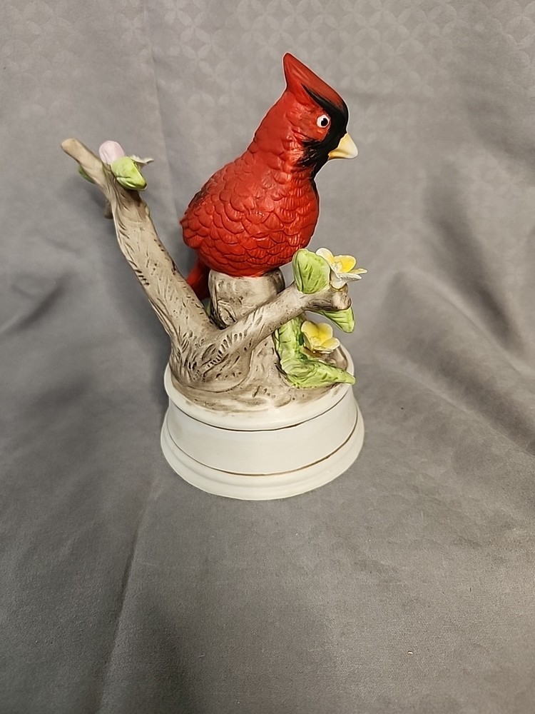 This product is a vintage Cardinal Red Bird statue music box made in Taiwan. It features a charming design of a cardinal bird playing a music box, making it a delightful decorative collectible for any vintage or bird enthusiast's collection. The craftsmanship and attention to detail in the design showcase the quality and uniqueness of this piece, adding a touch of nostalgia and charm to any space it is displayed in.