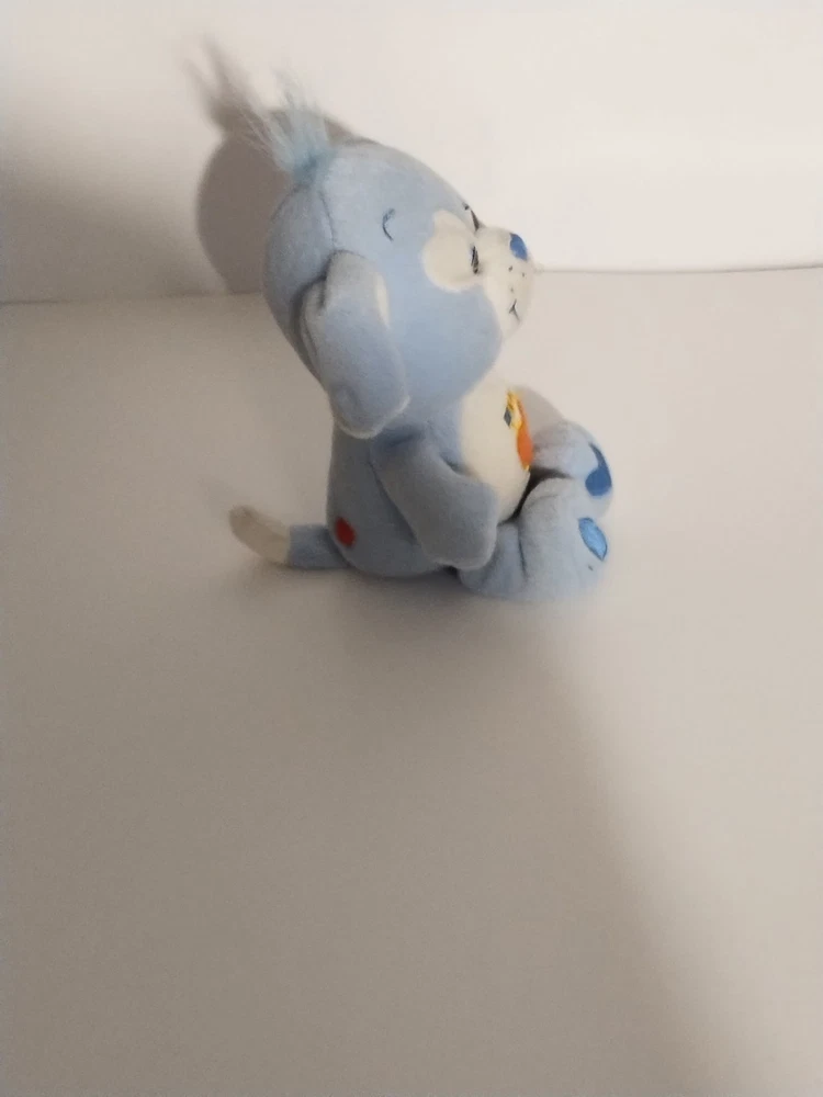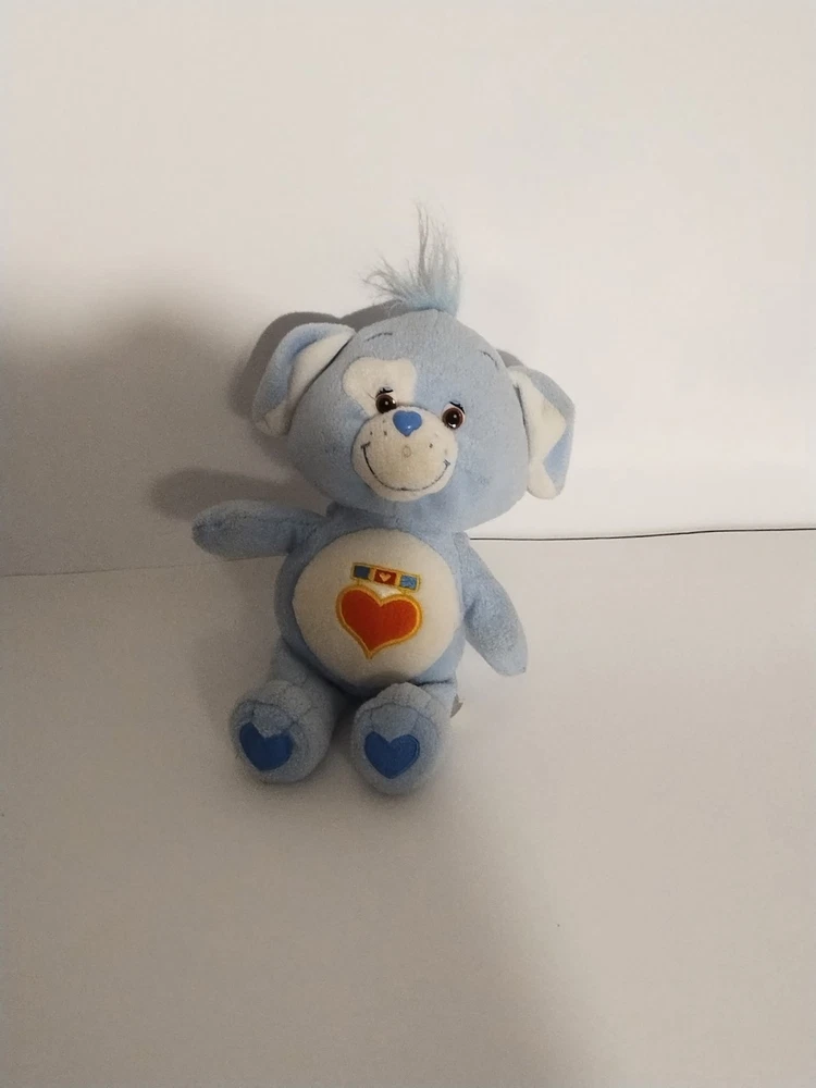 This vintage Care Bears Cousins plush is a 10" blue Loyal Heart Dog from 2004. Part of the Care Bears franchise, this original plush bear is a retired collectible featuring a loyal heart motif. The surface washable toy is in the form of a puppy and is part of the Care Bear Cousins collection, making it a charming addition for fans of the beloved characters.