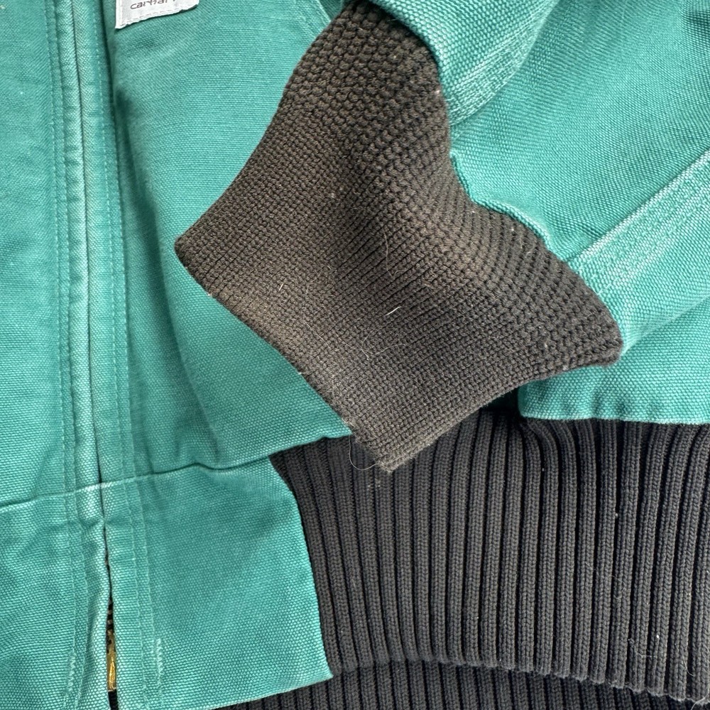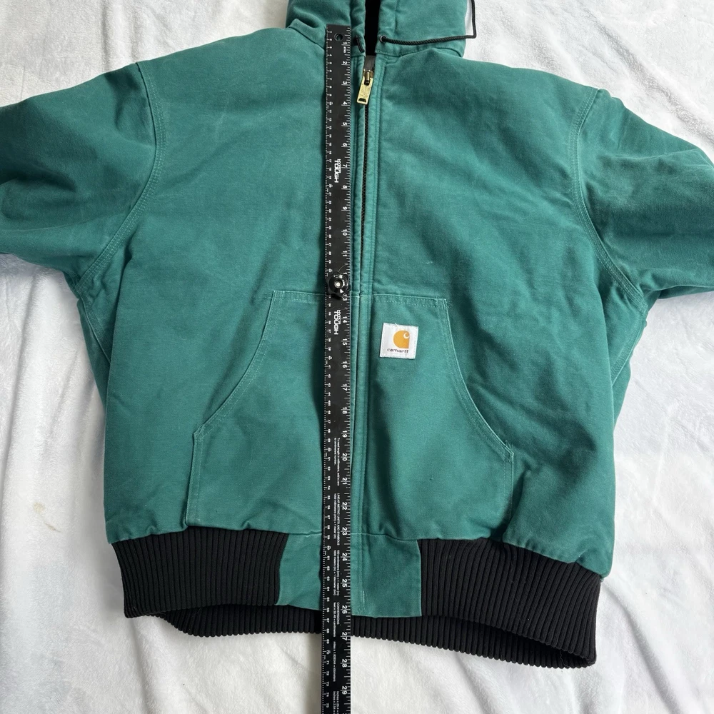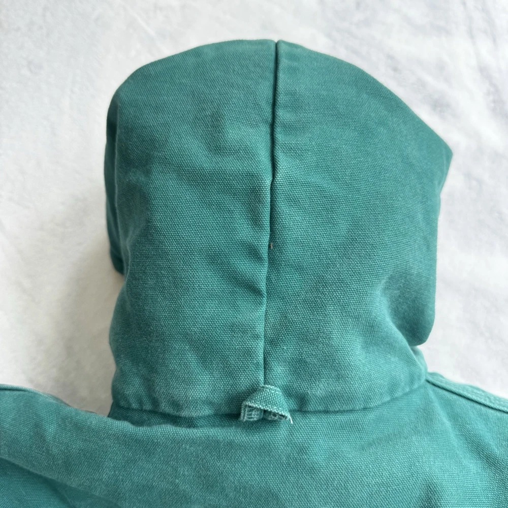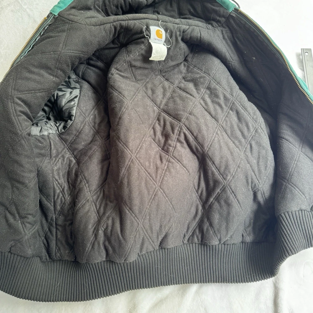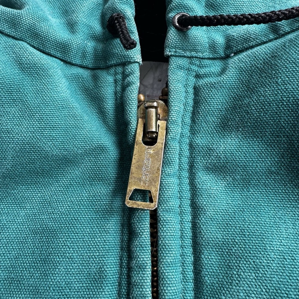 This vintage Carhartt jacket in size large features a classic bomber style with a hood, full zip closure, and quilt-lined insulation, making it perfect for outdoor activities in colder weather. The aqua teal color adds a unique pop of color to this piece, which is also adorned with the iconic Carhartt logo. Made with durable cotton canvas and lined with polyester, this jacket is a quality piece that can be machine washed for easy care. With a retro vibe that blends elements of hipster, western, and 90s style, this Carhartt jacket is a must-have for any fashion-forward individual looking for a durable and stylish outerwear option.