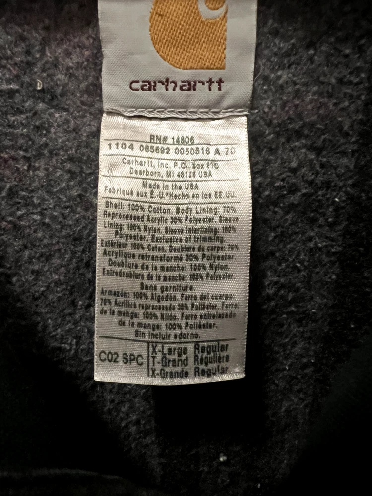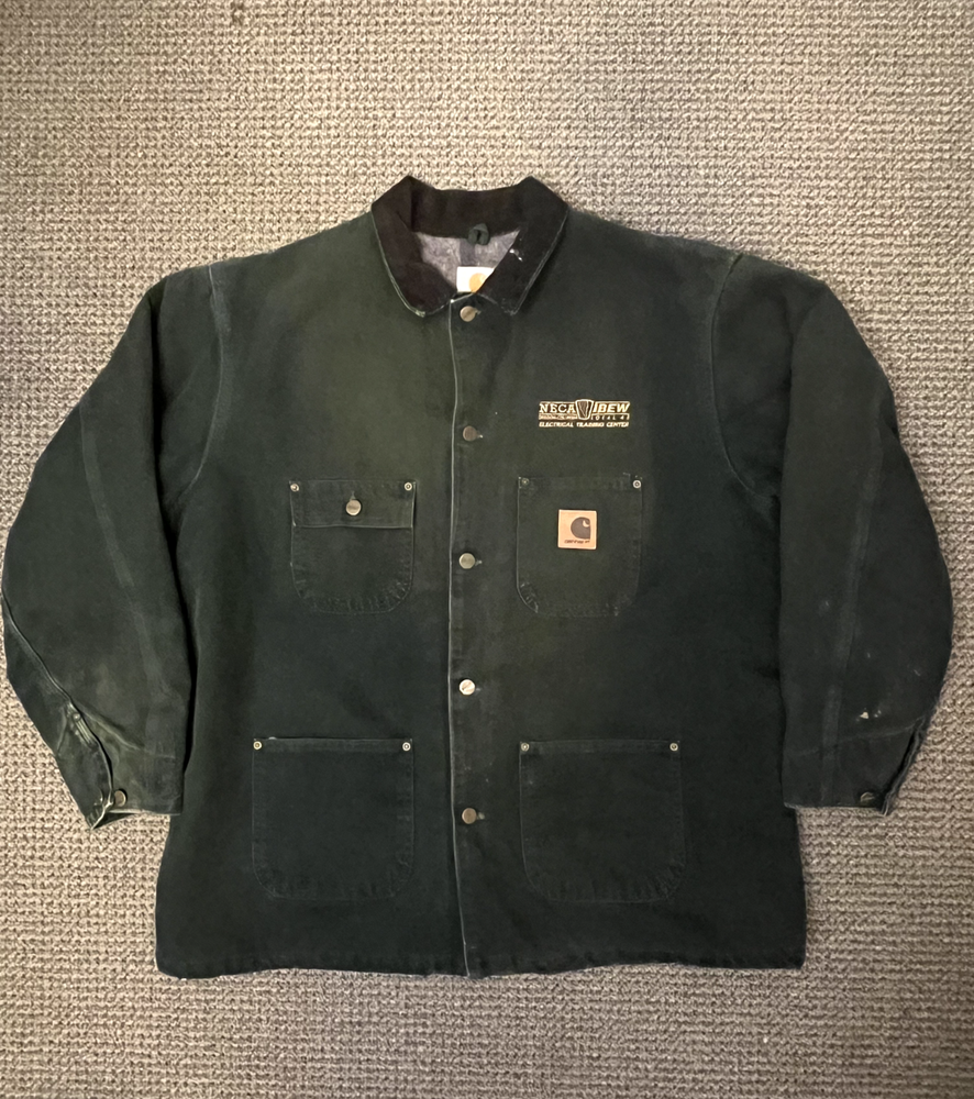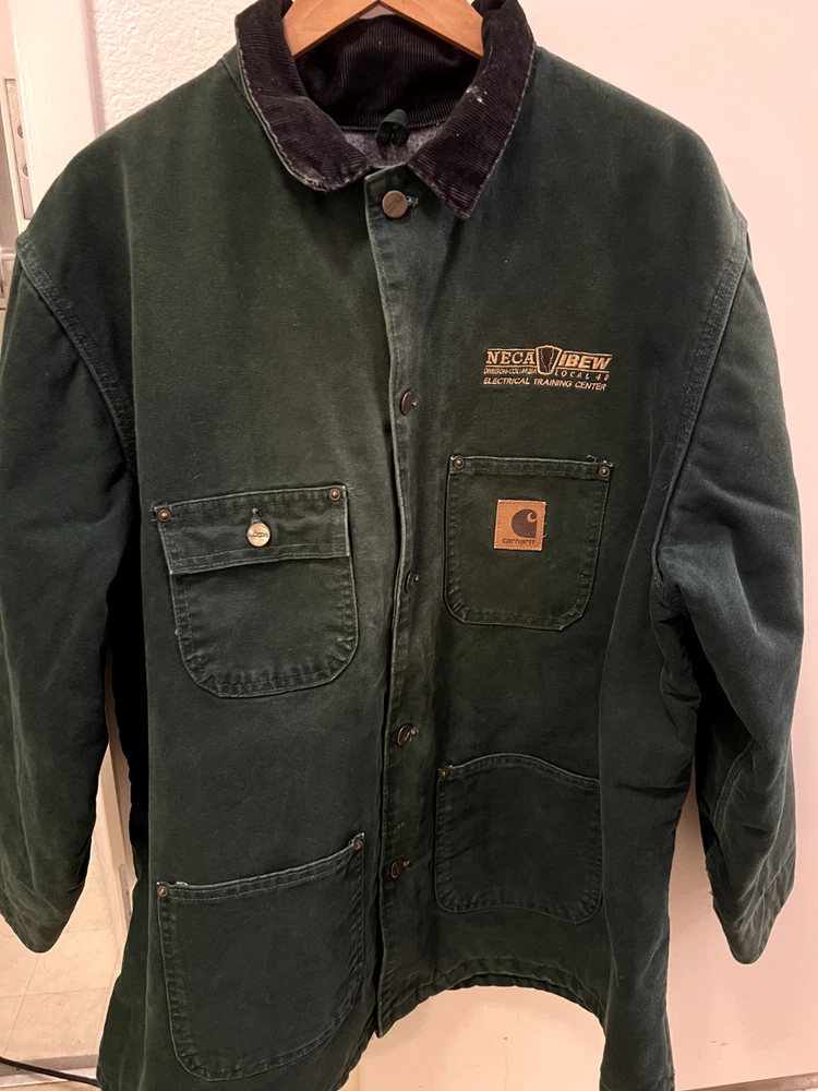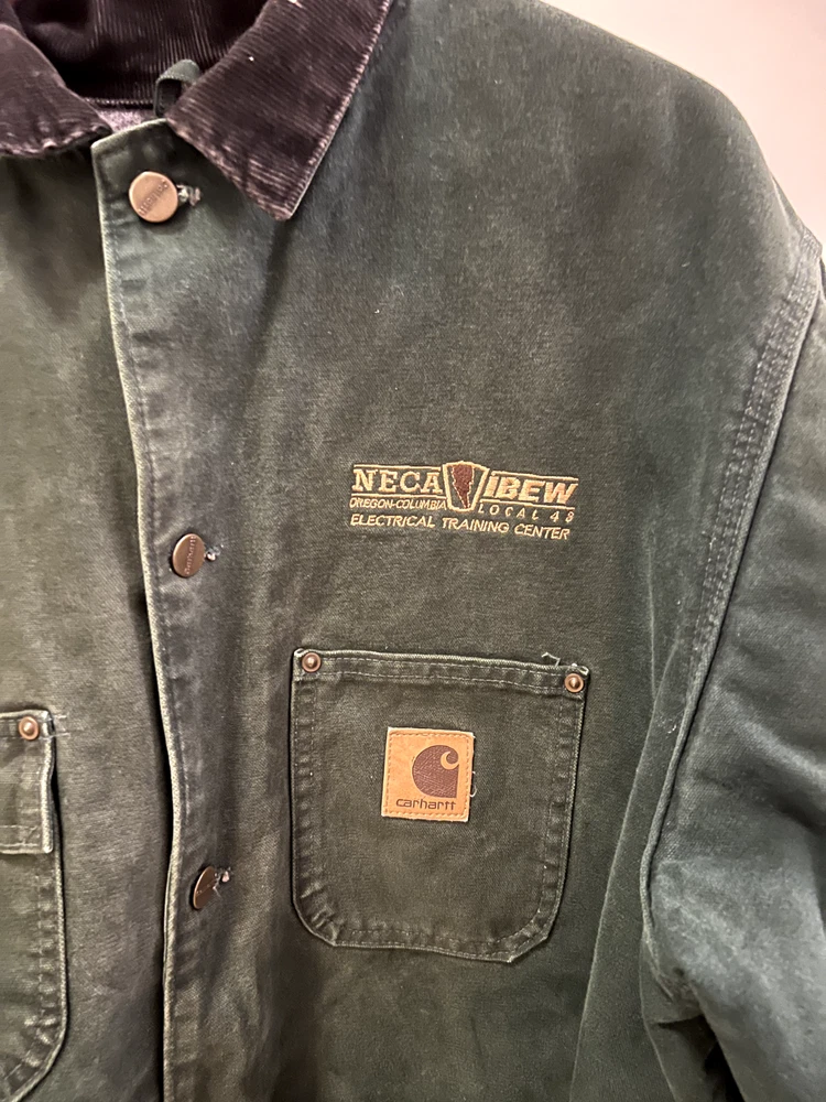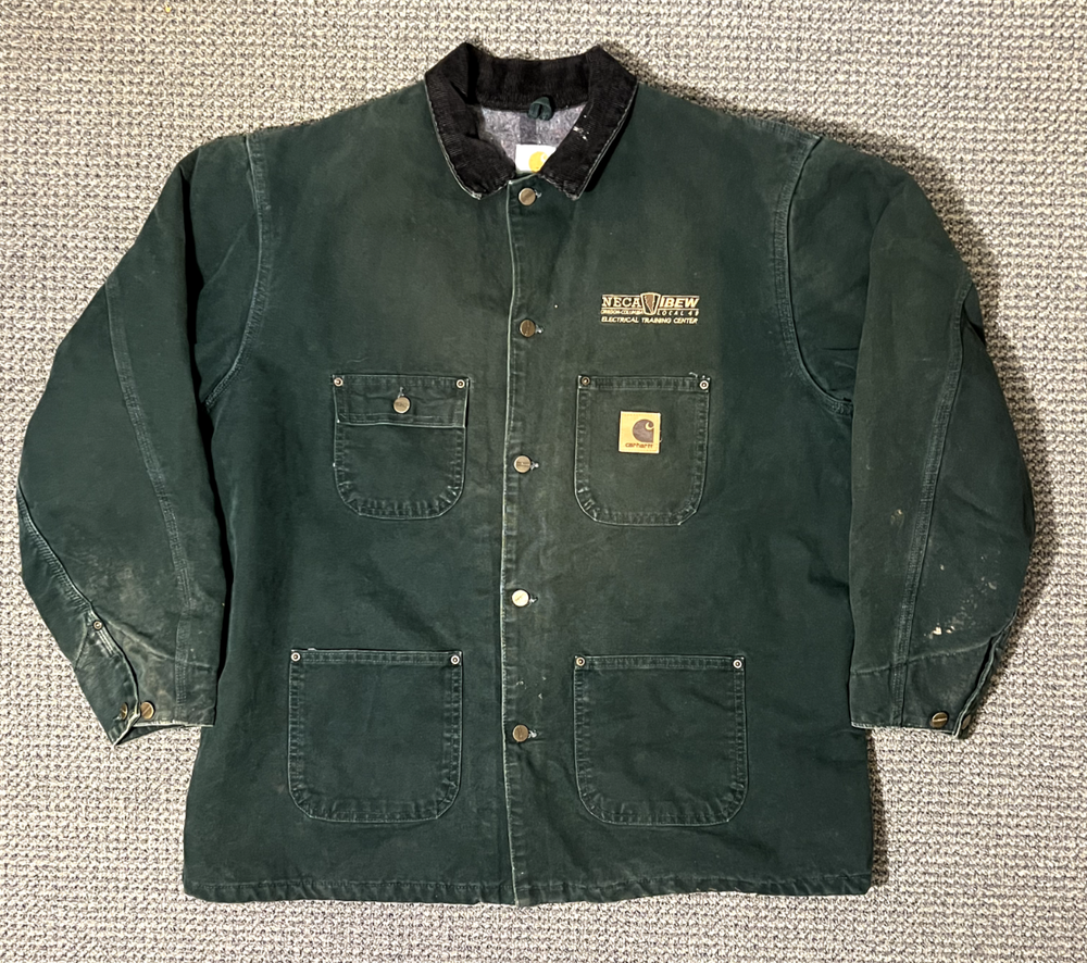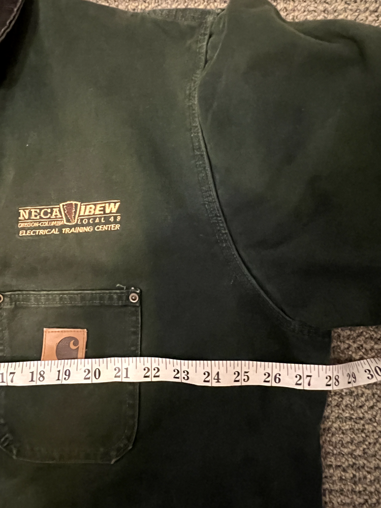 This is a Carhartt C02 chore coat in the rare and classic spruce green colorway. The photos don't do justice to how deep the green is. It was made in the US and features Carhartt’s heavyweight duck canvas. Excellent condition, blanket-lined, and tough and durable. I would have loved to keep it but it's slightly too large for me. I have the C01 version of this coat and these things last forever. Features embroidered NECA IBEW Local 48 union patch; this coat likely saw real use in the Pacific Northwest electrical trades. It shows some mild scuffing and surface markings, but nothing major. No tears or holes. The canvas still retains excellent structure. Interior blanket lining is clean and intact. Size: XL Pit to pit: 28" Length from the seam where the collar meets the shoulder down to the bottom hem: 32.5" Please let me know if you have any questions. Open to reasonable offers!