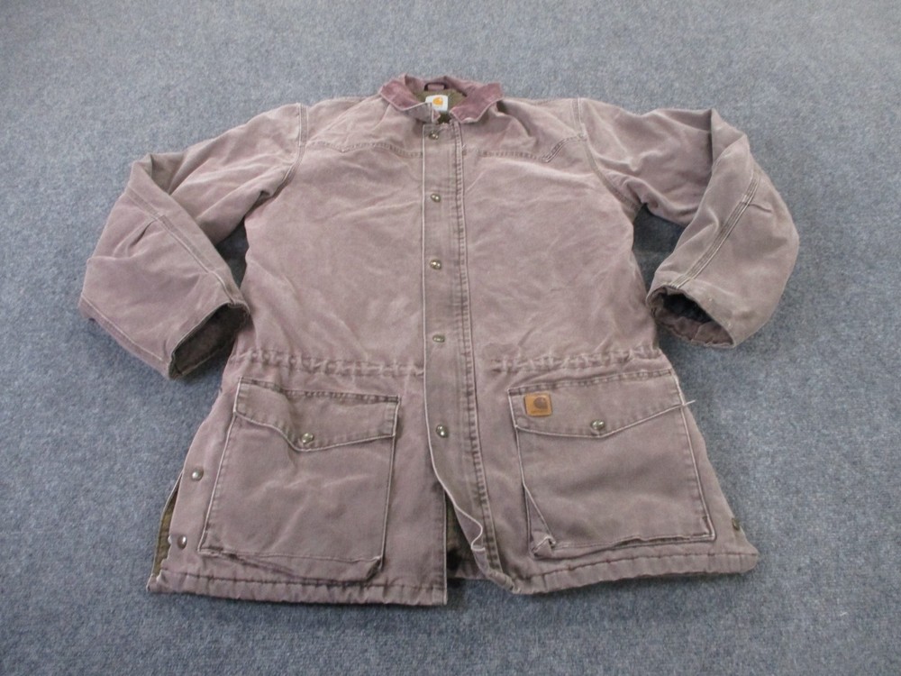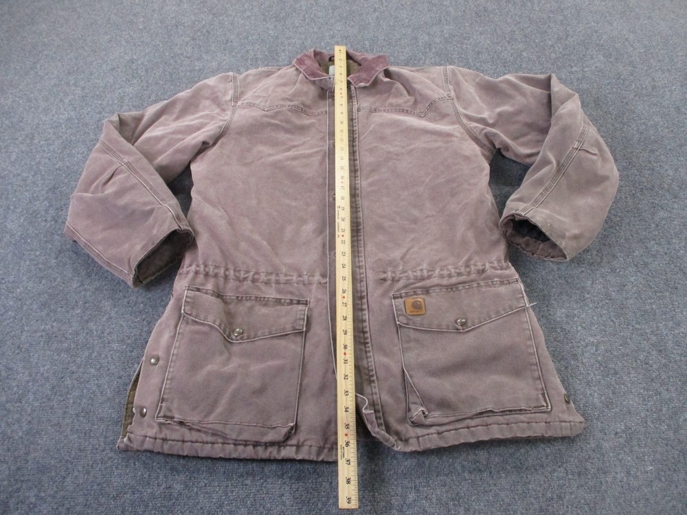 For sale is a used Carhartt Jacket Measurements: Please see above photos for all measurements. Compare to your favorite garments for best fit. No size tag, sized by measurements. Marks on sleeve cuffs. I ship items out EVERY DAY so EXPECT a QUICK delivery!