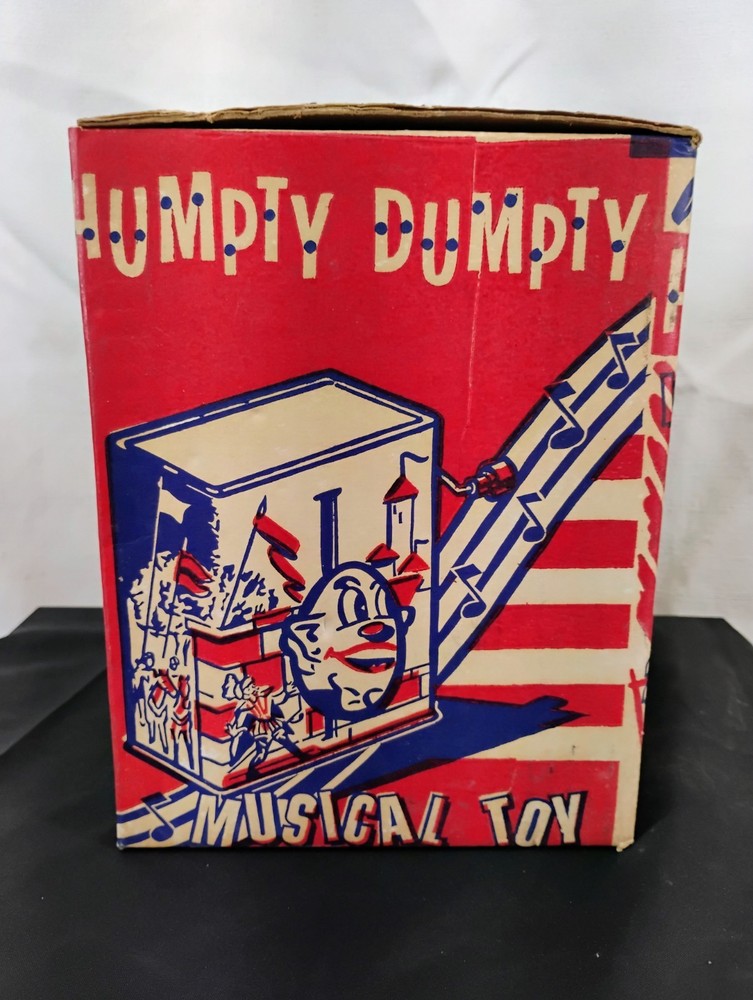 The Vintage Carnival Toy Musical Humpty Dumpty Toy Box is a nostalgic piece that would have once contained a toy meant to spin and play music based on the classic nursery rhyme. This collectible item is a perfect addition for collectors of vintage and antique toys, especially those interested in musical toys from carnivals or amusement parks. The box alone adds value to any collection and serves as a great reminder of simpler times and childhood memories. Thank you for visiting my listing today and thank you for your interest in this item! My goal is to have a pleasant transaction resulting in a satisfied customer. I hope any transaction between us leaves you with a feeling of confidence knowing you can trust me and the items I offer here. *Most if not all my listings are set to accept offers. Feel free to send an offer and I will be happy to consider it!! *Please contact me with any questions or concerns and I will be happy to help. *Always examine the photos carefully, and if in doubt, email me with any questions you may have. *Please note that condition statements are offered as a guide only. They will always be somewhat subjective and reflect our opinion, which may not necessarily agree with someone else's opinion. PLEASE READ: I aim to please and I want my buyers to have a positive transaction with me. If you have questions, concerns, or special requests related to any of my items I hope you will contact me so we can work them out to your satisfaction. I sell my items to give you a great item at a decent price while making a little profit at the same time. If you feel the item you are interested in is too pricey do not hesitate to send me a fair offer and I will consider it. My goal is to satisfy your needs and mine so both parties can benefit. SHIPPING: If you prefer a different shipping method or company please contact me and I will do all I can to make that happen. If you have concerns or requests about the packaging of your item contact me and I will do all I can to accommodate them. Shipping costs are based on location in each state or country, the costs always differ. After I have received your payment I will ship your item out within 3 business days or less excluding weekends and holidays. BEFORE PURCHASING & BIDDING: **Please see all the pictures. I do not have great photography skills but I try to get the most accurate photos I can. If you are unsure about something you see in a photo contact me so I can do what I am able to answer your concern about the item. **I cannot stress enough that if you have any questions or concerns please contact me before purchasing and bidding. Communication can solve so much. **As a customer myself, I understand the meaning of customer satisfaction and my goal is to have nothing but satisfied customers. If you are not unsatisfied with your purchase I ask that you please contact me so I can take care of your issue. My goal is for you to be 100% satisfied. INTERNATIONAL BUYERS WELCOMED - PLEASE NOTE: I welcome International buyers! Please be aware that any custom/duties/taxes that the parcel might incur once it is out of the USA are the responsibility of the buyer. Please check with your country's customs office to determine what these additional costs will be prior to bidding or buying. Please refer to the eBay Site Map for more information if needed.