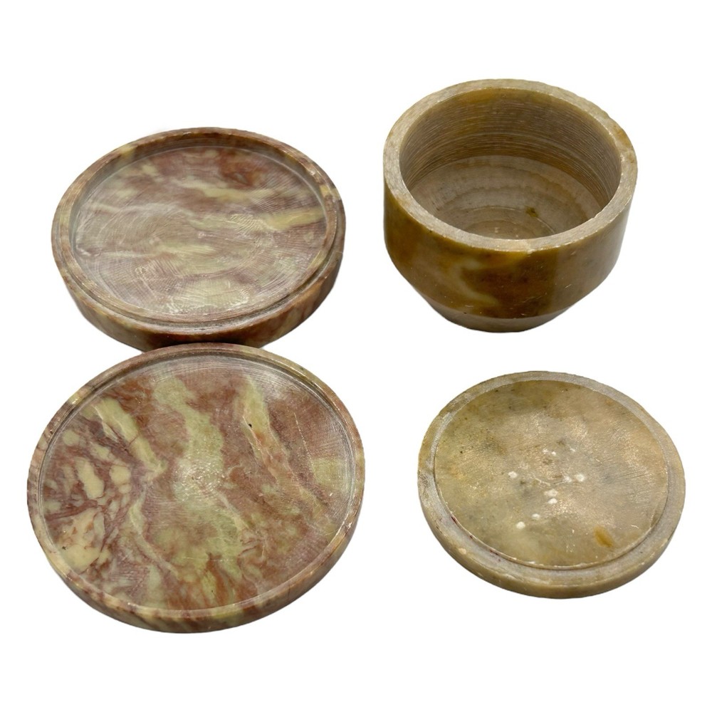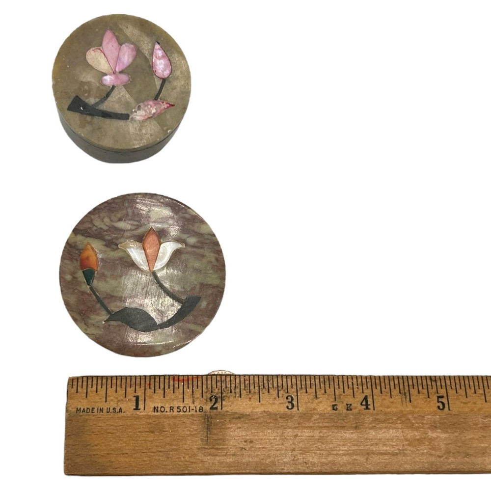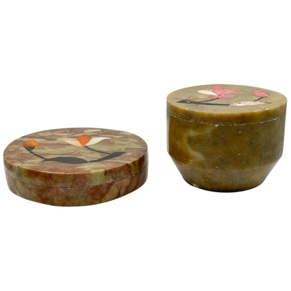 TWO TRINKET BOXES A terrific lot miniature soapstone trinket boxes made with intricate detail. Items show no observed damage. Expect age appropriate wear but nothing that takes away from their charm. Please see all images for further details. Be sure to see all our other items for possible bundle and shopping deals! Will pack with extra care and attention that vintage items require. Quick shipping guaranteed. Returns accepted at buyer’s expense. Display boxes and props not included unless otherwise noted. Own this lovely lot! We are a reputable seller! Check out our reviews to see what customers say about our products and service. You won’t regret trusting Fairfield for your online purchase.