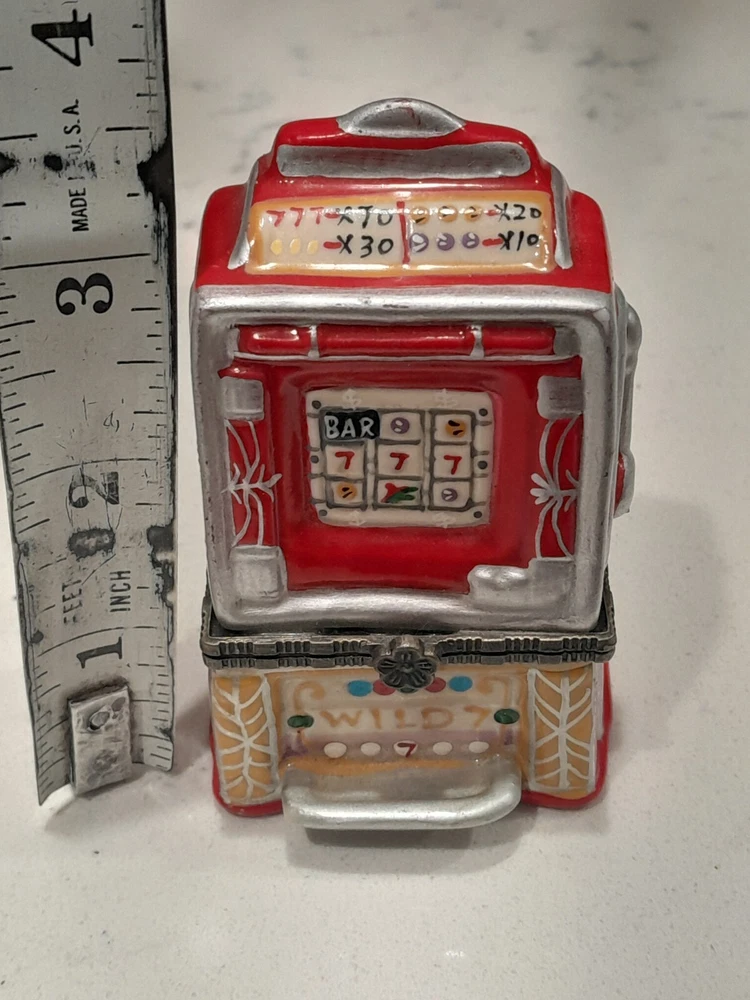 This vintage slot machine, featuring the popular Casino Wild 7 theme, is a must-have for any collector of casino memorabilia. The ceramic construction and hinged design make it a durable and convenient addition to your collection. Measuring 3.25" tall, this slot machine is perfect for display in any casino-themed room. The country/region of manufacture is unknown, adding to the intrigue and mystery of this unique item.