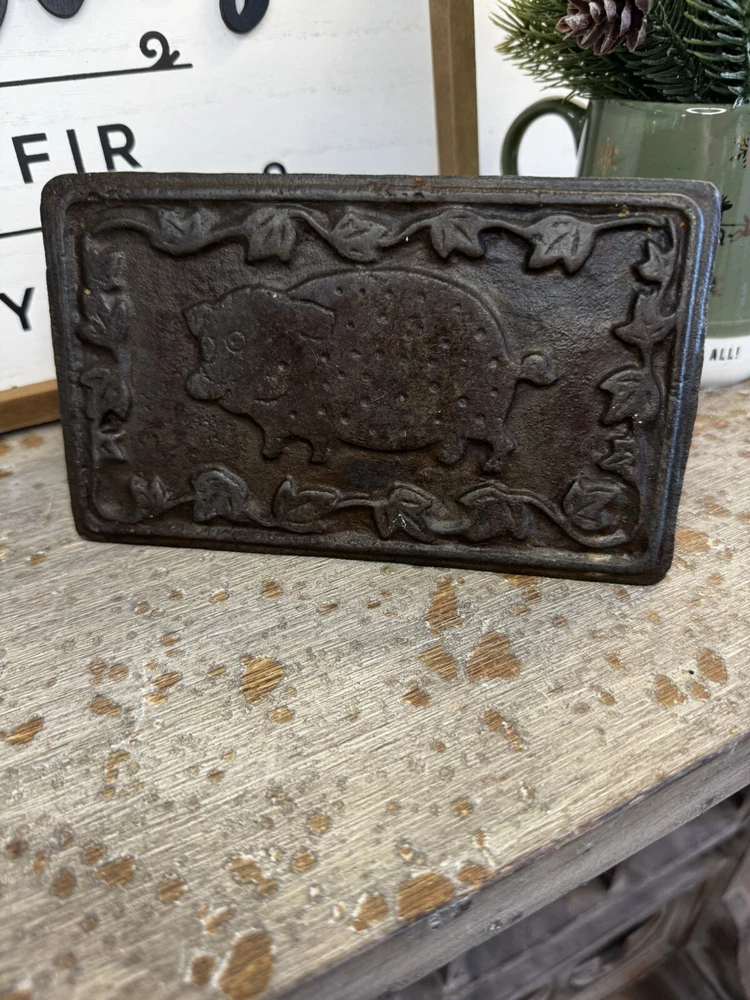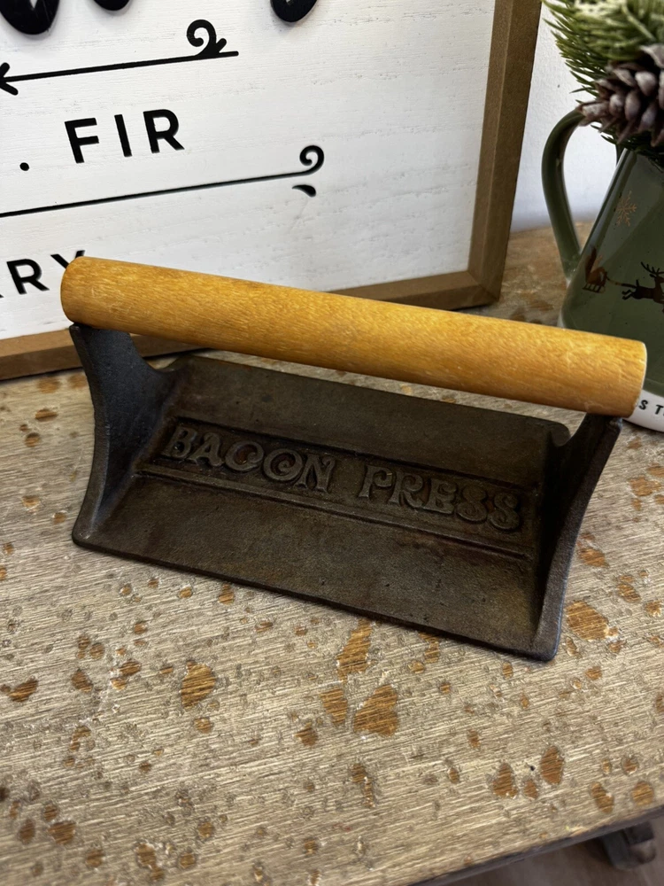 This vintage cast iron bacon press is a unique addition to any kitchen. With a rectangular shape and a 7" inch length, it is perfect for cooking bacon or other meats on the stovetop. The press is made from durable cast iron and features a wooden handle for easy grip. The bacon press is compatible with both electric and gas stoves and has a non-stick surface coating for easy food release. Its black color and pig design make it a great antique collectible. This skillet/griddle is perfect for any kitchen and is sure to impress any collector.