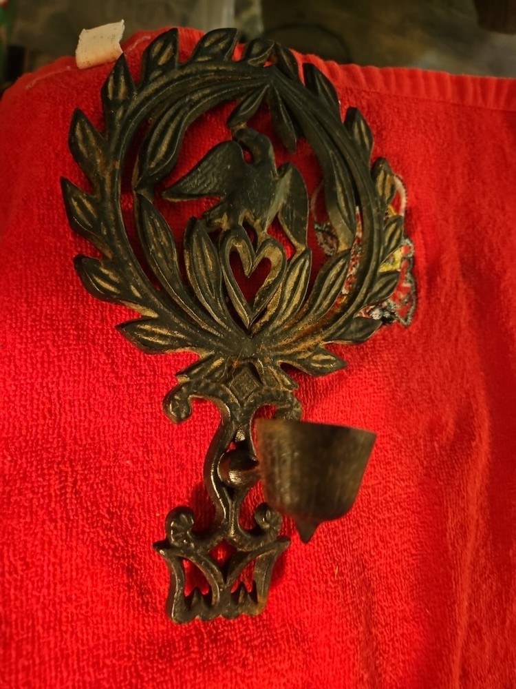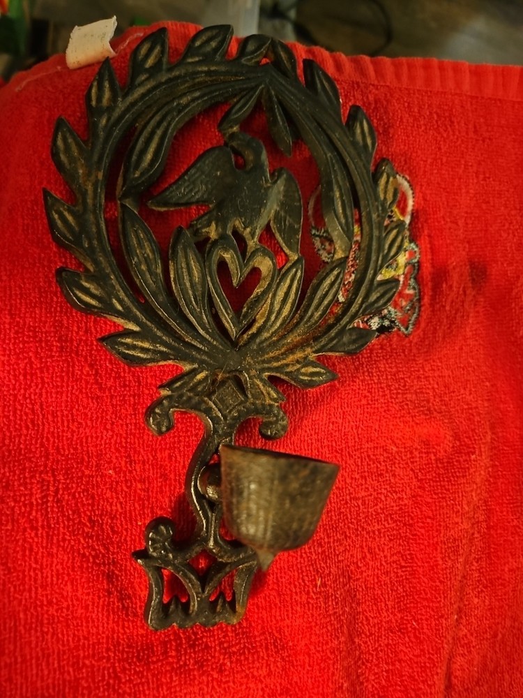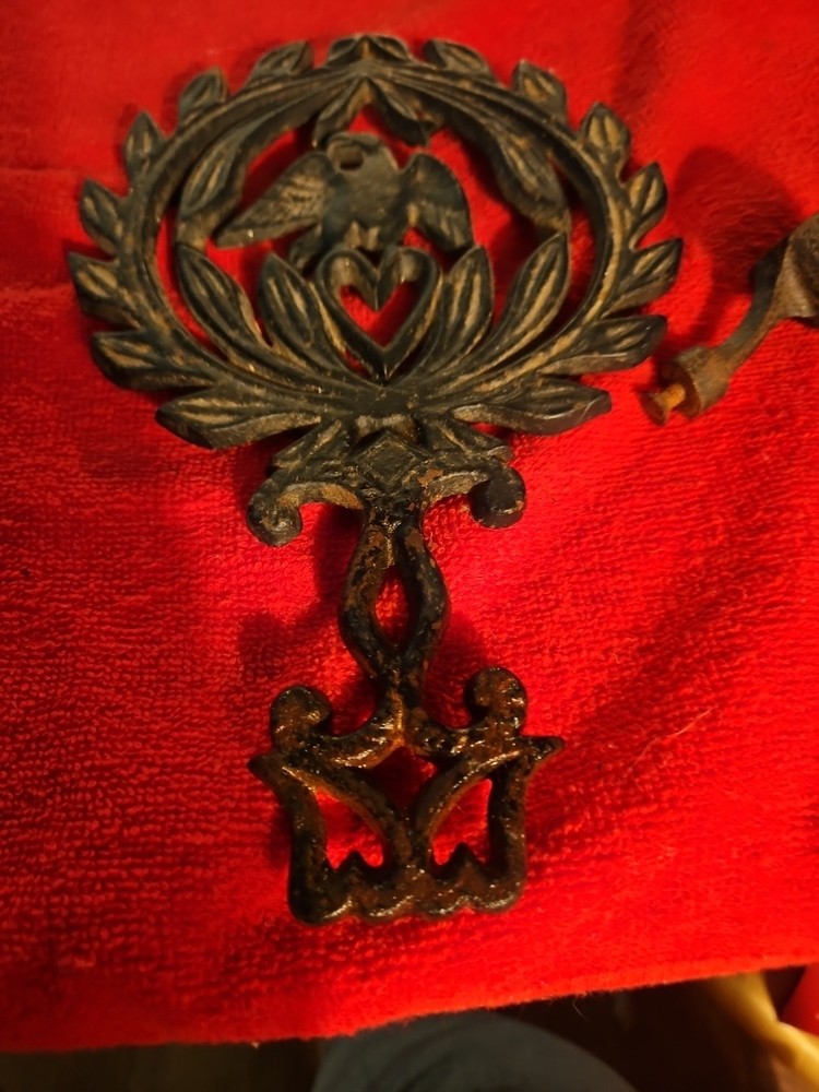 2 Vintage Cast Iron Eagle with Heart Laurel Wreath Vintage Candle Holder/trivet This great pair can be used as a trivet or add to candle piece to hang up. Picture is 1 set each way.