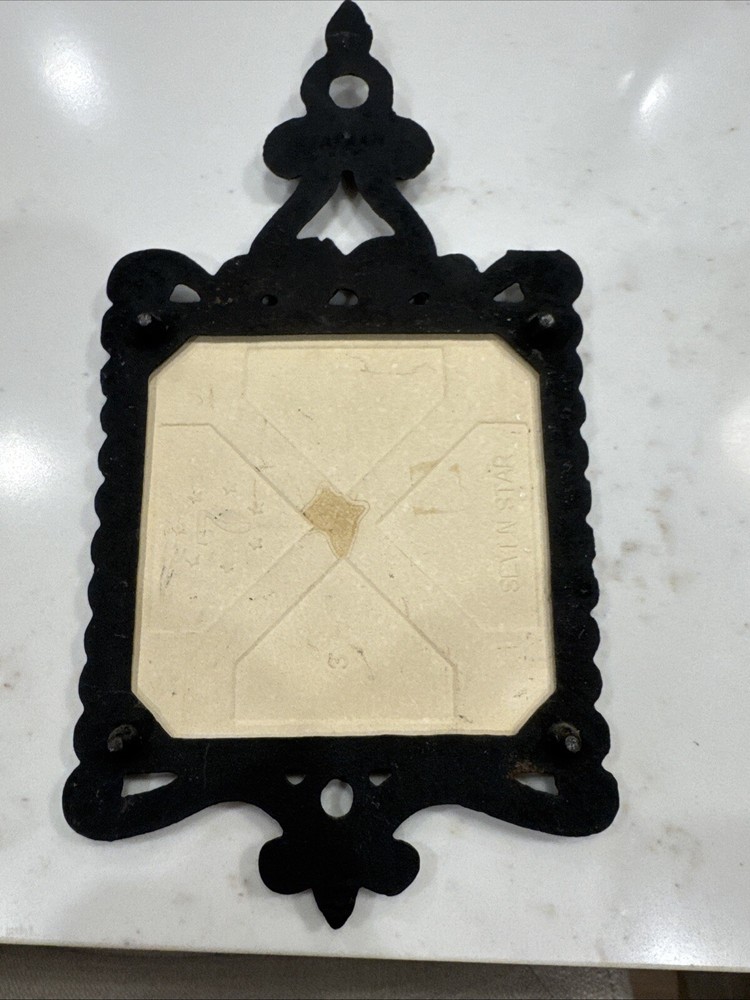 Add a touch of retro charm to your kitchen with this vintage tile and cast iron trivet. The multicolor design features a playful phrase "KITCHEN CLOSED SUNDAYS" that is sure to spark conversation. This original piece is perfect for collectors or anyone looking to add some vintage style to their home. Crafted from high-quality cast iron, this trivet is both durable and functional. The square shape and wall hanging design make it a unique addition to any kitchen. Whether you're using it to protect your countertops or simply displaying it as a decorative piece, this vintage trivet is sure to impress.