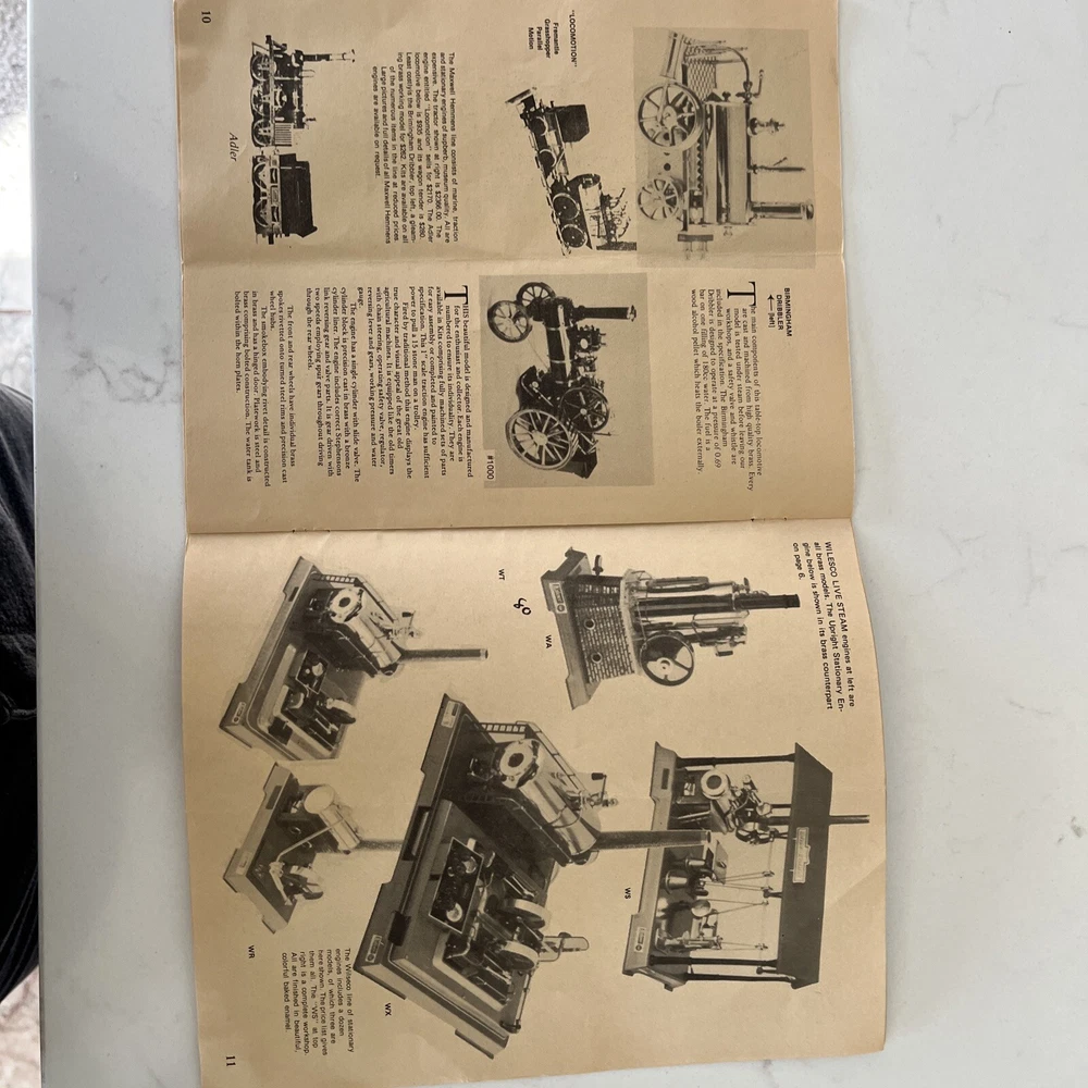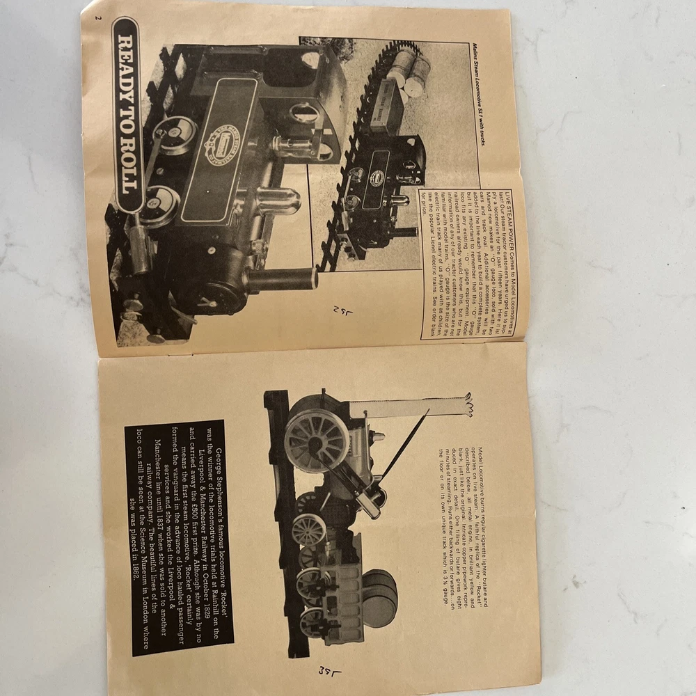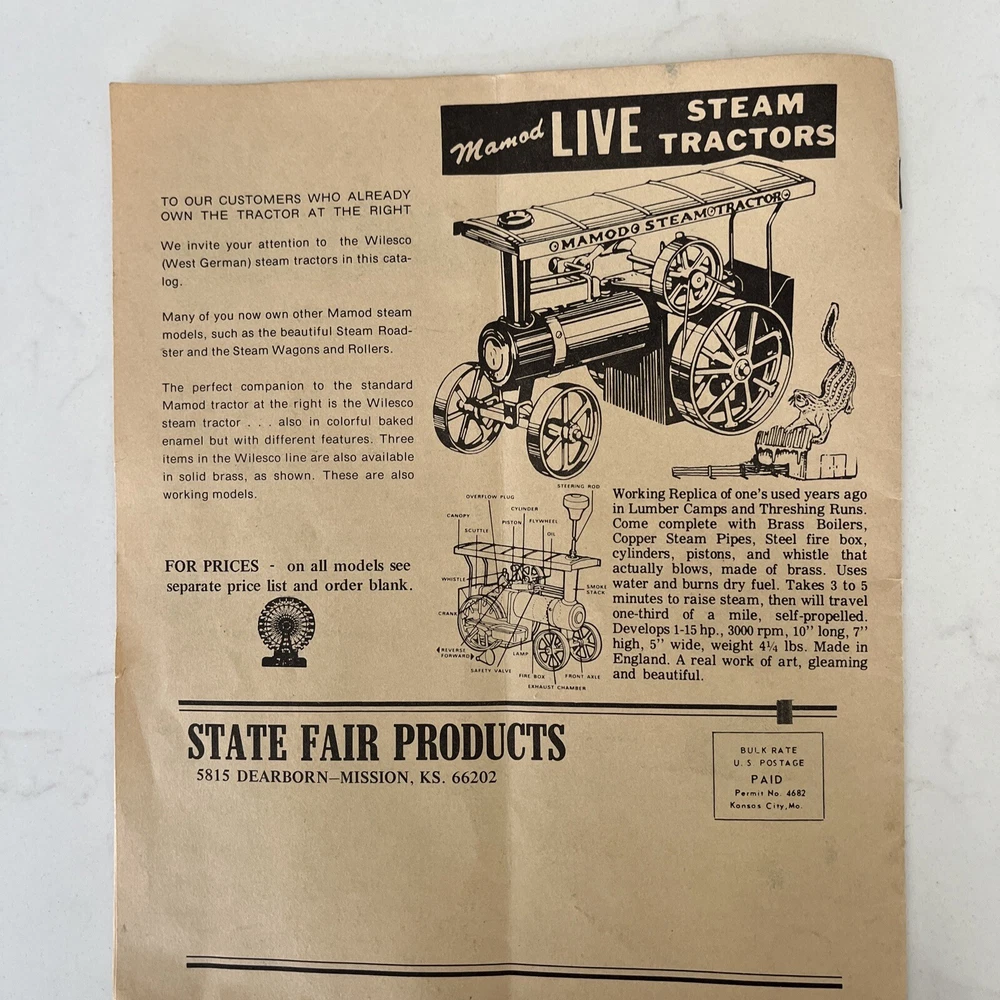 This really yellowed, aged, outdated, catalog from State Fair Products in Mission, Kansas is entitled “A Precision Steam Model Catalog Live”, talks about “Ready to Roll” steam engines from standing models to steam tractors and more. This catalog showcases precision steam models, perfect for hobbyists and collectors alike. It offers a detailed overview of the features and specifications, making it a valuable addition to your collection. The catalog covers various categories of steam engine models available back then. With its high-quality production, this catalog is a must-have for anyone looking to expand their collection or knowledge of precision steam models. The detailed information and beautiful imagery make it the perfect addition to any model train media collection. Get your hands on this fantastic catalog today! It is worthy of framing to put on display.
