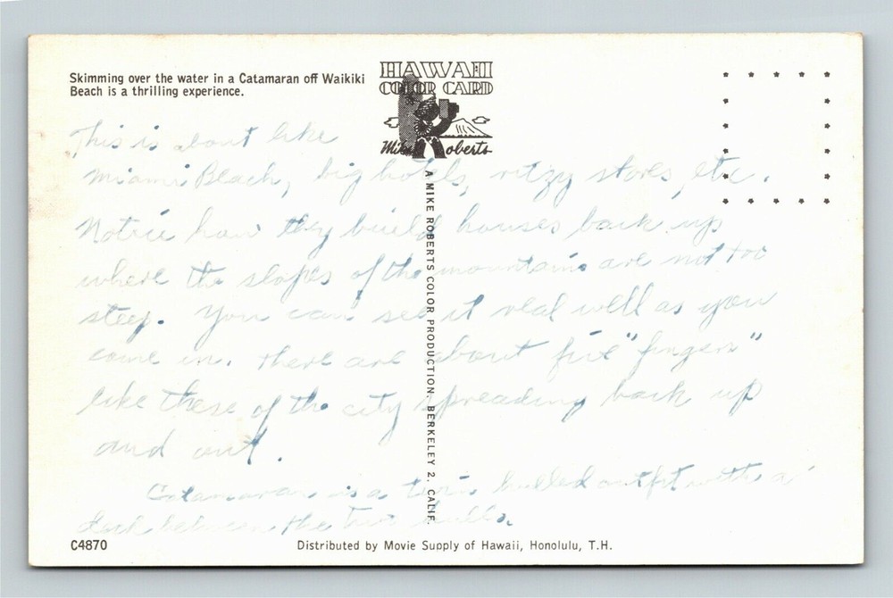 Vintage Catamaran Skims Waikiki Beach Hawaii Postcard
