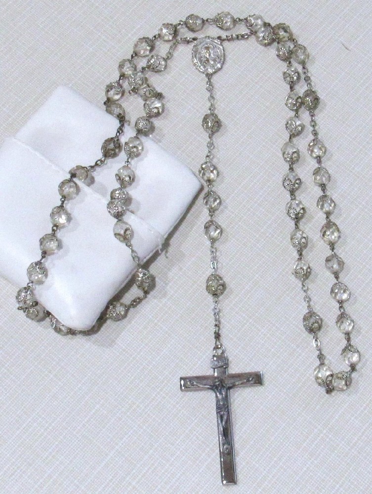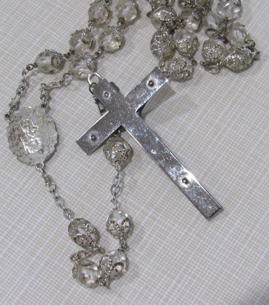 Vintage Catholic 40" Crystal Bead Silver Tone Filigree ROSARY Crucifix Necklace Vintage Catholic 40" Crystal Bead Silver Tone Filigree ROSARY Crucifix Necklace Beautiful Vintage Crystal Bead Rosary with Large Crucifix Unmarked Not Sterling - silverplate possibly Total length is 40" Crucifix measures 2-1/8" in length Comes in a small leatherette pouch PLEASE message me with any questions! Buyer pays $4.95 shipping via USPS package SAME or Next Day Shipping!!! Listing and template services provided by inkFrog