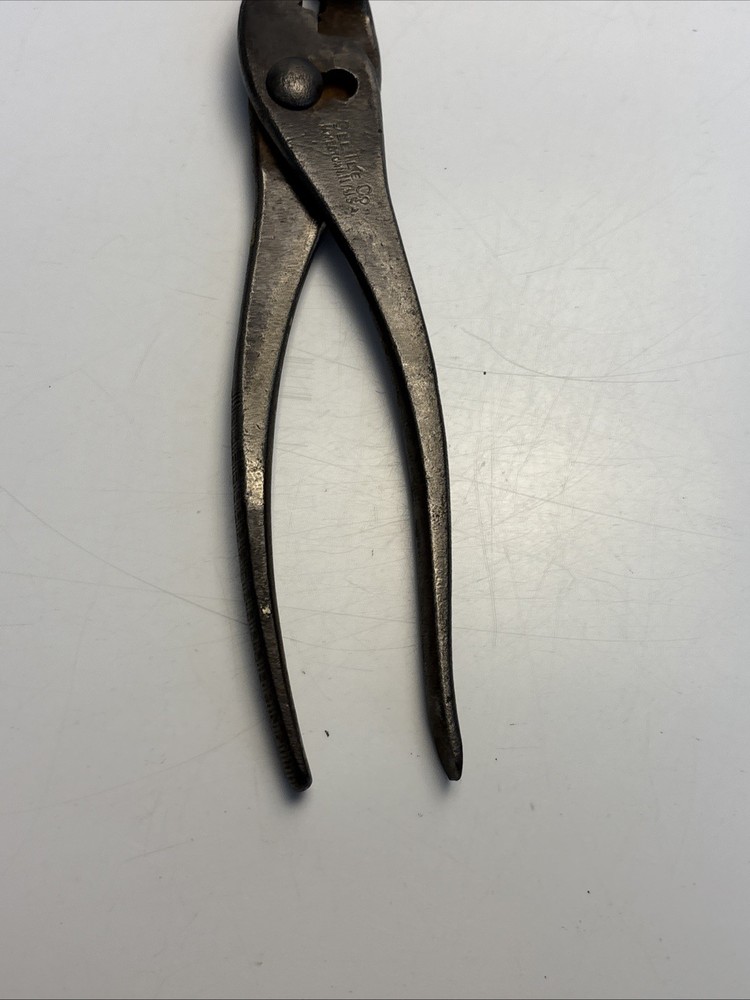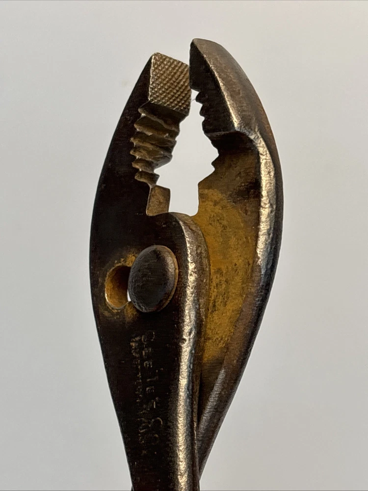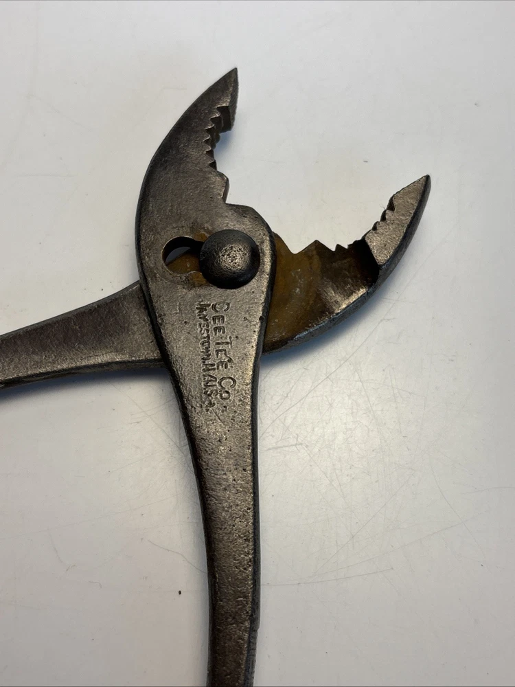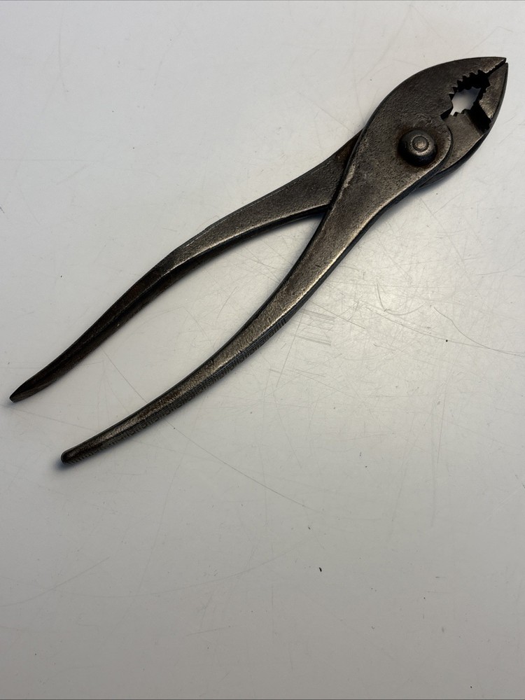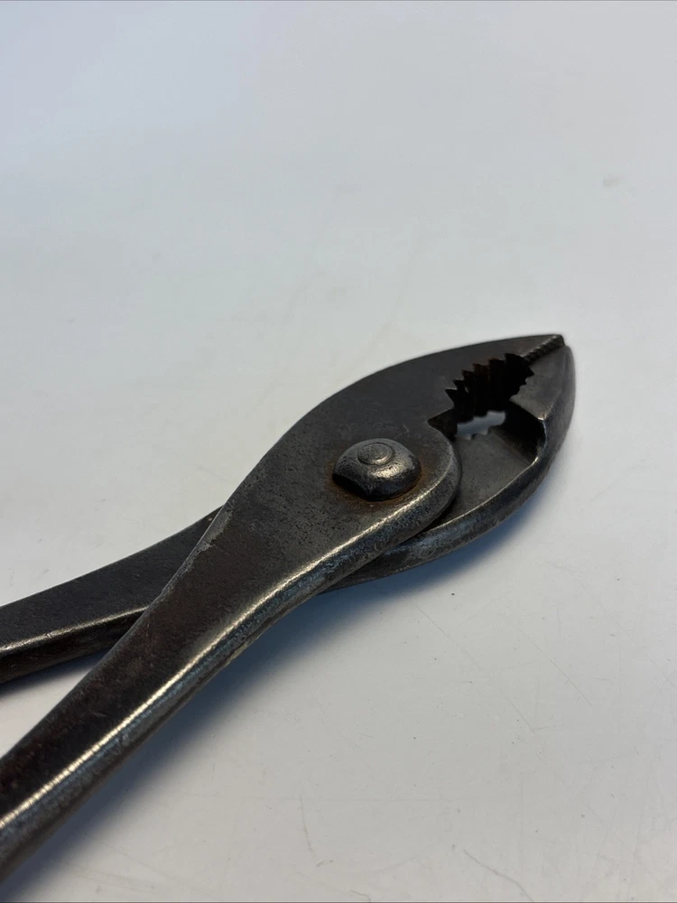 Vintage slip joint pliers marked Cee Tee Co., Jamestown NY, U.S.A. Forged steel construction with adjustable slip joint pivot and serrated jaws. Classic early American hand tool from a Jamestown, New York manufacturer known for quality forged tools. Dark aged patina from use and storage. Overall length is approximately 8 inches. Marking is clearly visible on the handle: “Cee Tee Co. Jamestown NY U.S.A.” See photos for full details of condition and markings. Condition: Used vintage condition with surface wear, oxidation, and patina consistent with age and use. Jaws and pivot operate normally.