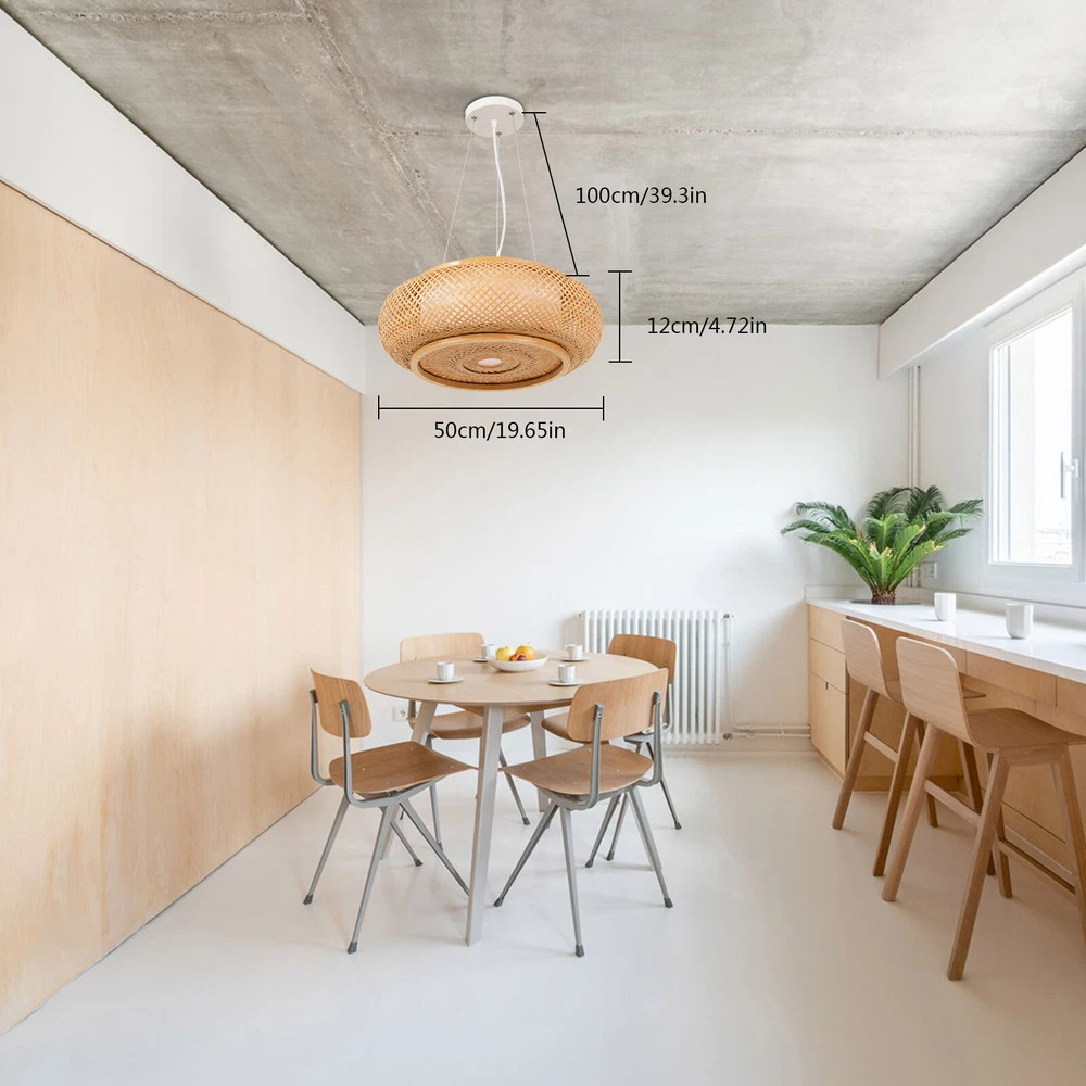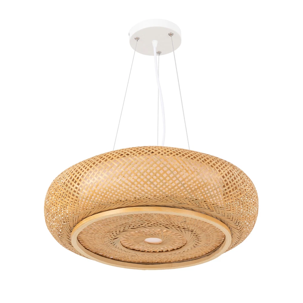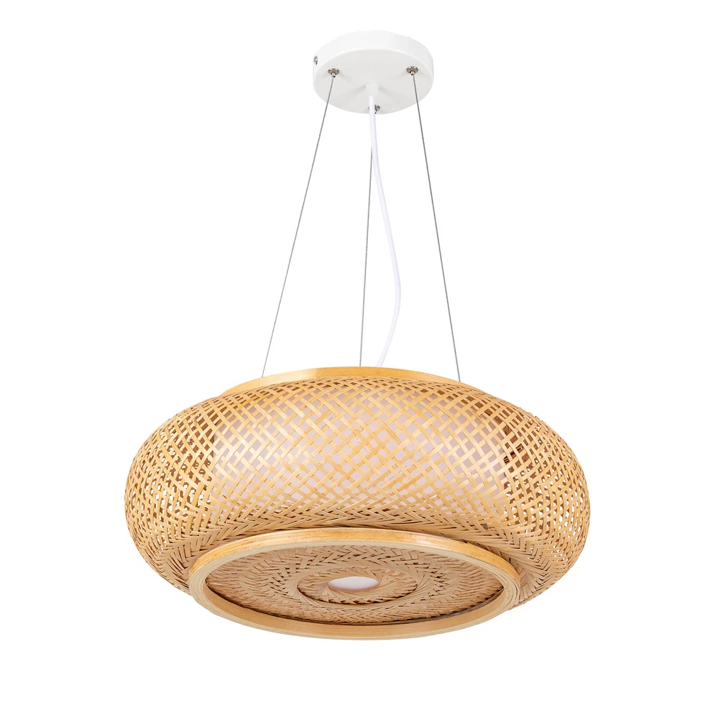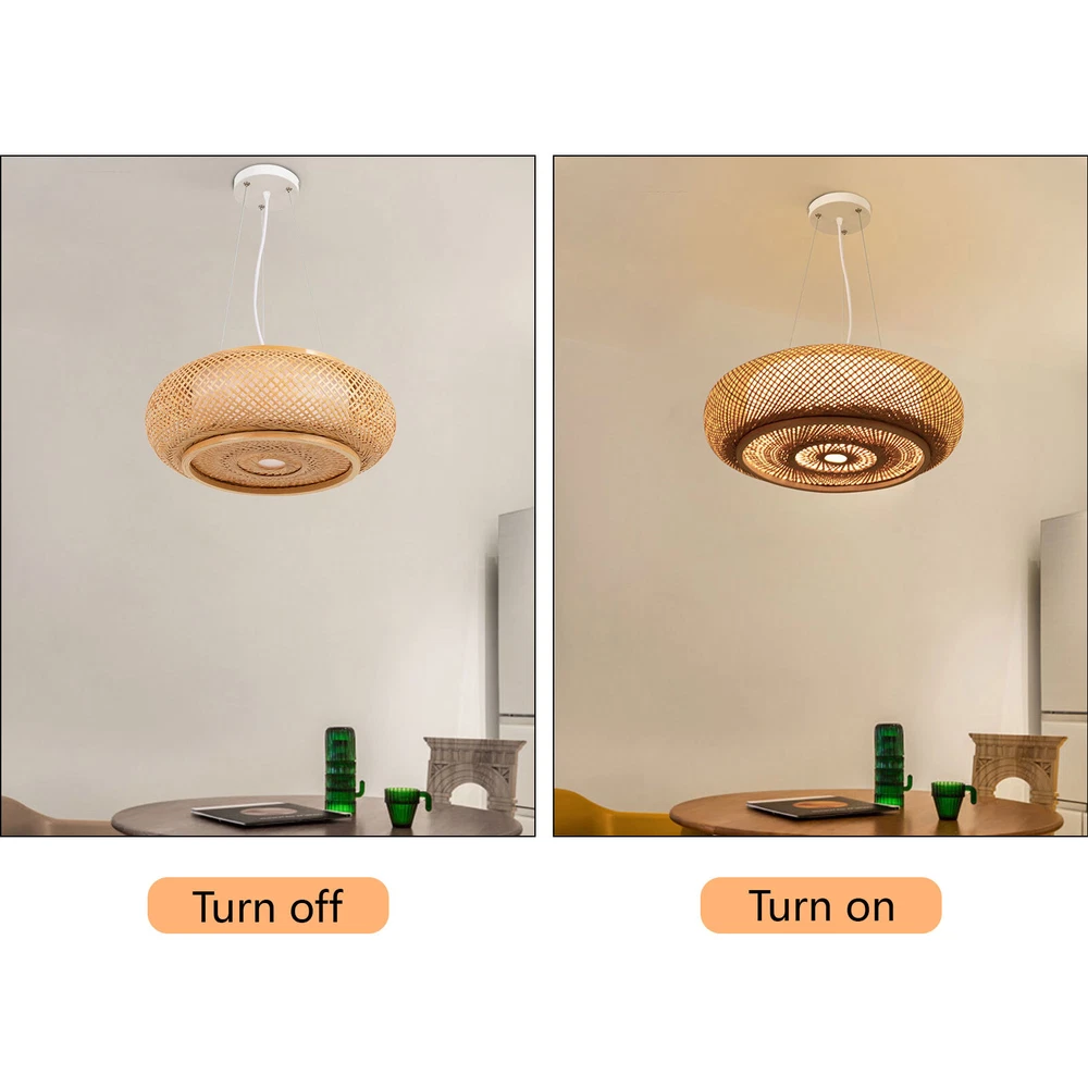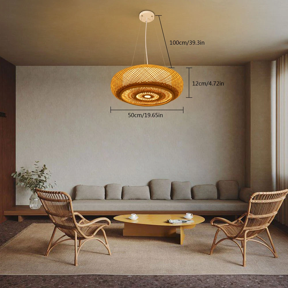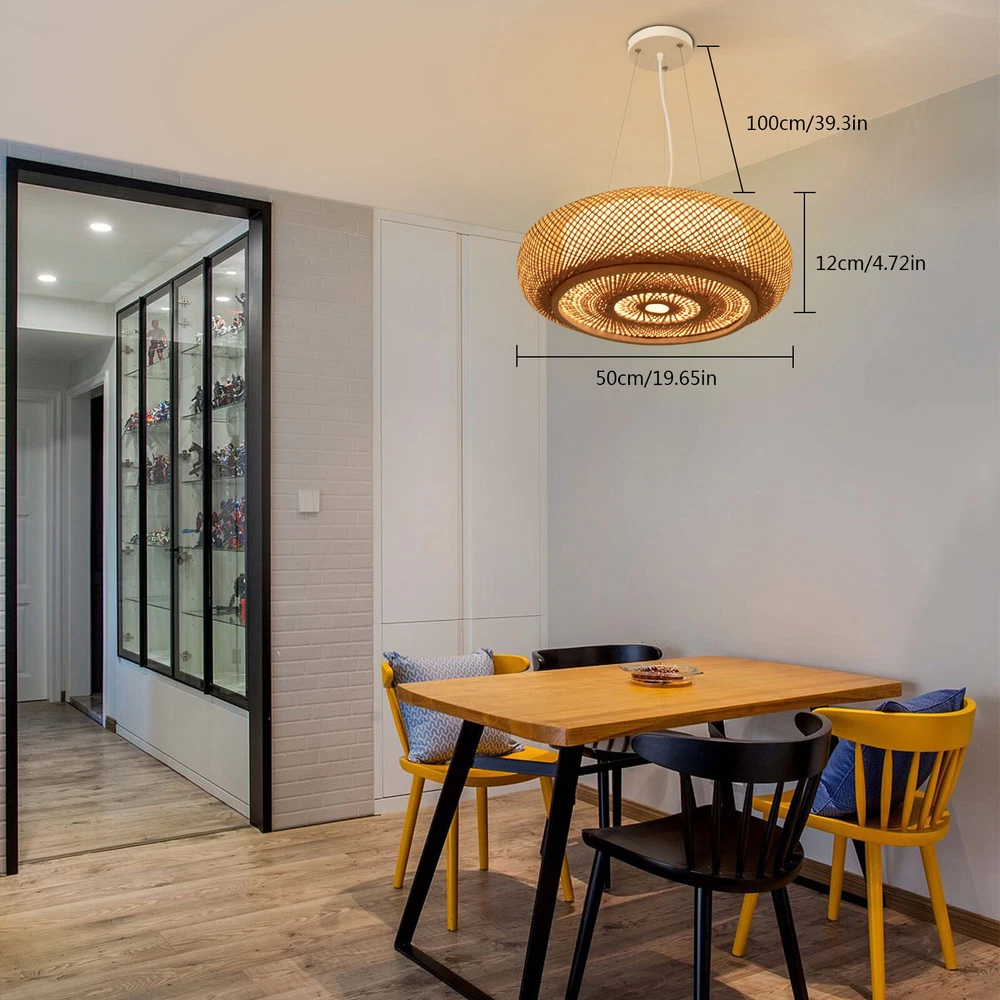 Specifications Color: Gold, Rattan Yellow Material: Bamboo, Iron, Steel Wire, Parchmyn Process: Hand-woven, Stoving Varnish Style: Vintage, Farmhouse Shape: Drum Chandelier Type: Bamboo Art Chandelier Mounting Type: Ceiling Mount Indoor/Outdoor Usage: Indoor Room Type: Bedroom, Living Room, etc. Light Direction: Down Lighting Bulb Type: LED/Incandescent/Fluorescent Light Source: 3* E26 Bulbs (Not Included) Voltage: 110V Max. Bulb Power(Each): About 60W Efficiency: E Applicable Height: Normally 3-4m/9.84-13.12ft Adjustable Height: About 1m/3.28ft Applicable Area: 10-25m²/107.6-269ft² Wire Rope Length: 1.2m/3.9ft Chassis Diameter: 10cm/3.93inch Lamp Shade Height: 12cm/4.72inch Ceiling Lamp Diameter: 50cm/19.65inch Package Included 1* Ceiling Lamp Other Access Vintage Ceiling Lamp Fixture Decor Bamboo Rattan Pendant Light Hanging Wicker US Vintage Ceiling Lighting Fixtures Drum Shape Ceiling Mount Ceiling Light Creative Decoration Art Bamboo Light Handmade Industrial Lighting for Living Room, Bedroom, Balcony 19.65inch Description This ceiling lamp mainly uses woven bamboo and iron material with exquisite processes, making it anti-rust and sturdy. Its woven bamboo shade in a drum shape with a large illuminated range(107.6-269ft² ) will be a beautiful addition to your farmhouse, living room, porch, patio, etc. You can adjust the height through the steel wire ropes to achieve the desired lighting effect. This product is compatible with LED, Edison, incandescent, and other bulb types less than 60W. Key Features Build to Last: This ceiling lamp consists of a bamboo shade and an iron chassis, together with hand-woven and stoving varnish processes, making it anti-rust, corrosion-resistant, and sturdy. Excellent Lighting Effect: Applying the white parchmyn inner lamp shade that helps to gather light well, this ceiling lamp casts soft light on the ceiling to make a beautiful lighting effect and create a warm&romantic atmosphere in your living room. Adjustable Height: With the wire rope slings design, you can adjust the overall height of the lamp within 1m/3.28ft according to the actual situation. Unique Decorative Effect: The drum-shaped woven bamboo shade with layered circle design gives the ceiling lamp a classical&retro appearance that fits industrial, vintage, rustic, and modern style homes. It plays a unique decorative role when not in use. Sturdy Structure: The sturdy round chassis of 3.93 inches in diameter, three support brackets on the shade, and strong steel wire ropes ensure stable support for the lamp body. Large Applicable Area: The item with three lamp holders can serve an area of 107.6-269ft². So you can feel the illumination over a considerable area. Easy to Install : You just need to connect the steel wire ropes on the ceiling lamp with the chassis, and then connect the wire reserved on the ceiling and the lamp chassis to install this product. Ideal Gift: Thanks to its exquisite design and classical appearance, you can choose this ceiling lamp as a gift for housewarming to your friends. Protective Package: To prevent the product from being damaged and bumped during transportation, we packed it with foam to protect your products to the maximum extent possible. Buy with Confidence: We have been working hard to provide better service and quality for our customers, which is our goal. If there is any problem with our products, please contact us in time. Details Standard E26 Bases: Equipped with three standard E26 lamp holders, you can choose different style bulbs less than 60W such as LED, Edison, and incandescent to create different lighting effects. Semi-enclosed Bottom Opening: The semi-enclosed bottom opening allows for convenient installation or change of the bulbs. Application It is ideal for small to medium-sized spaces with low ceilings, such as farmhouses, kitchens, hallways, living rooms, bedrooms, balconies, lofts, aisles, foyers, corridors, cafes, bars, restaurants, dining rooms, tearooms, and patios. And its applicable area is 107.6-269ft², and the normally applicable height is 9.84-13.12ft. Specifications Color: Gold, Rattan Yellow Material: Bamboo, Iron, Steel Wire, Parchmyn Process: Hand-woven, Stoving Varnish Style: Vintage, Farmhouse Shape: Drum Chandelier Type: Bamboo Art Chandelier Mounting Type: Ceiling Mount Indoor/Outdoor Usage: Indoor Room Type: Bedroom, Living Room, etc. Light Direction: Down Lighting Bulb Type: LED/Incandescent/Fluorescent Light Source: 3* E26 Bulbs (Not Included) Voltage: 110V Max. Bulb Power(Each): About 60W Efficiency: E Applicable Height: Normally 3-4m/9.84-13.12ft Adjustable Height: About 1m/3.28ft Applicable Area: 10-25m²/107.6-269ft² Wire Rope Length: 1.2m/3.9ft Chassis Diameter: 10cm/3.93inch Lamp Shade Height: 12cm/4.72inch Ceiling Lamp Diameter: 50cm/19.65inch Package Included 1* Ceiling Lamp Other Accessories for Installation Notes Please check the product size before ordering to make sure it fits your room. This package does not include bulbs. Be careful not to pull the wires when unpacking, it may cause a poor connection. Please do not connect wires until the lights are fully assembled. Before installing the lamp, please check if the structure is firm and if the whole bulb is coordinated. For a safe and secure installation, please ensure that the electrical base to which this fixture will be mounted is properly attached to a structural member of the building. And please do not touch the bulb when replacing the bulb. This product is compatible with most junction boxes but must be hardwired. Please make sure the power is cut off before installation and when you clean the light. To ensure your safety, we recommend that two people install this ceiling lamp together. The surface of the product and the electric wire should avoid scratching when mounting, and electric insulation gloves(not included) must be worn when installing. Please install it by someone with an electrical license if necessary. During the cleaning and maintenanc