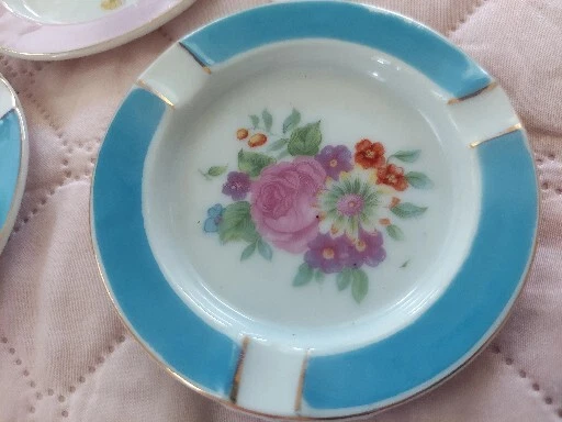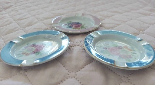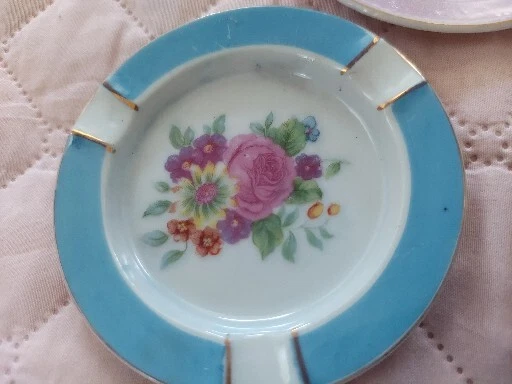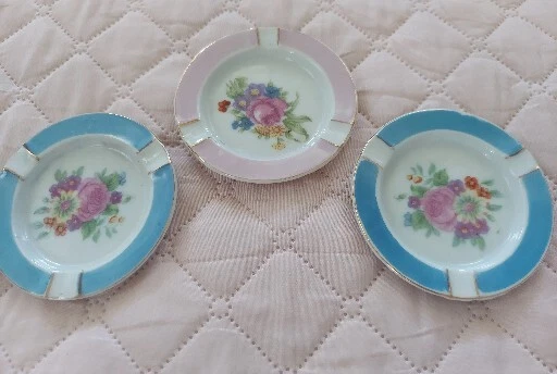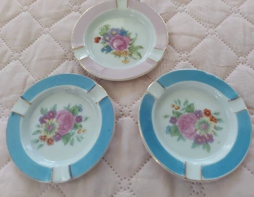 Vintage Ceramic Floral Painted & Transfer Ware Ash Trays Japan Lot 3 Shabby. These are lovely porcelain/ceramic shabby cottage ash trays that you can use for many other things; tea bag rest, spoon rest, small Hors d'oeuvres plate, trinket dish Marked Japan and painted in either blue or pink, then gorgeous transferware floral bouquets in the center, glazed Just over 3.5 inches each There are no chips or cracks. However, it is vintage, and at least a portion was handmade, so they are not perfection as a modern manufactured item would be. Happy to combine shipping. Thanks so much, and happy treasure hunting!