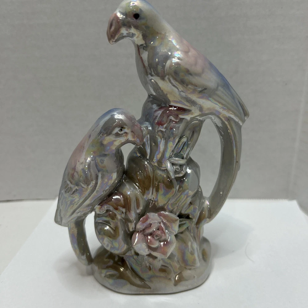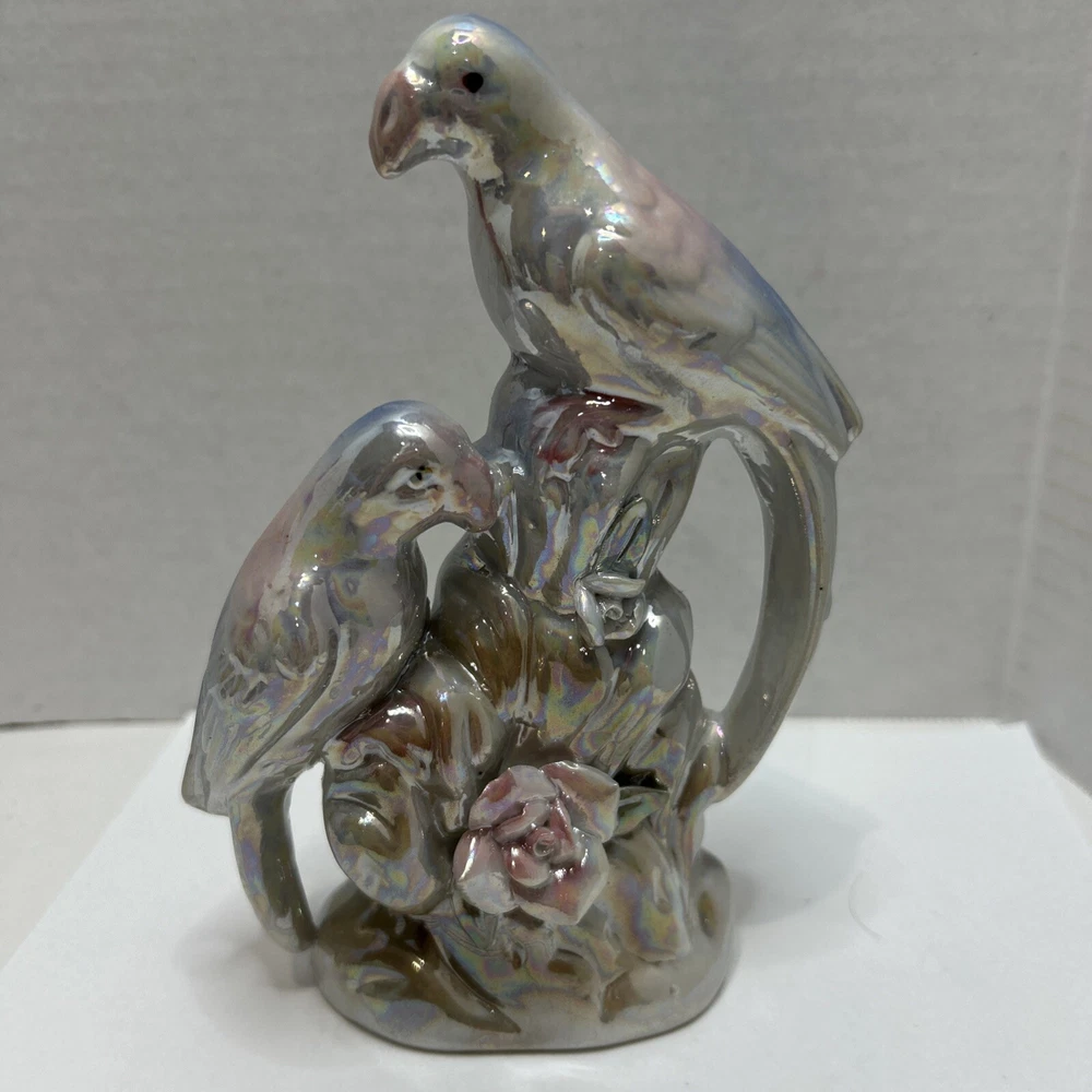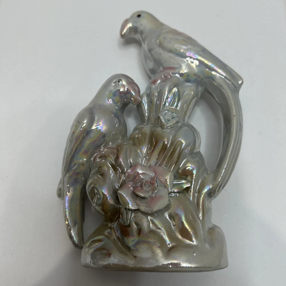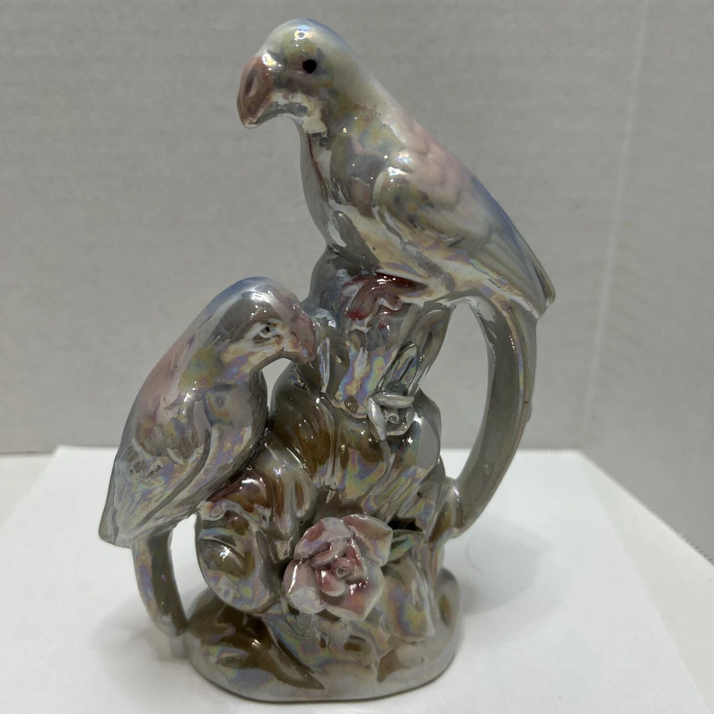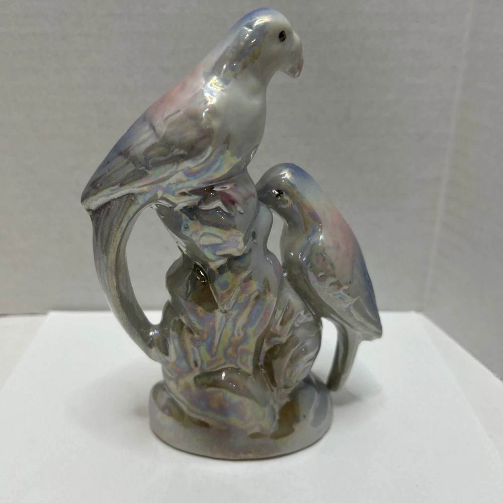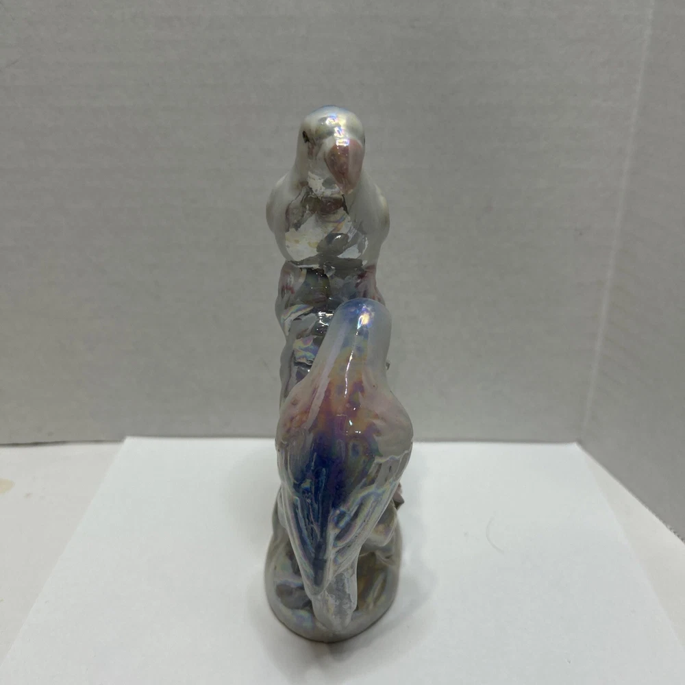 Crafted with meticulous attention to detail, this vintage ceramic figurine showcases a charming pair of love birds, opalescent in a soothing white with delicate blue and pink accents. The glazed finish enhances the exquisite multicolor design, bringing a touch of nature's grace to any setting. Measuring 7 inches in height and 4.5 inches in width, this mid-century piece from the 1950s is a testament to the timeless elegance of bird-themed collectibles. Weighing in at a sturdy 9.8 ounces, it's the perfect size to adorn a mantel, shelf, or to add a romantic flair to your home décor.