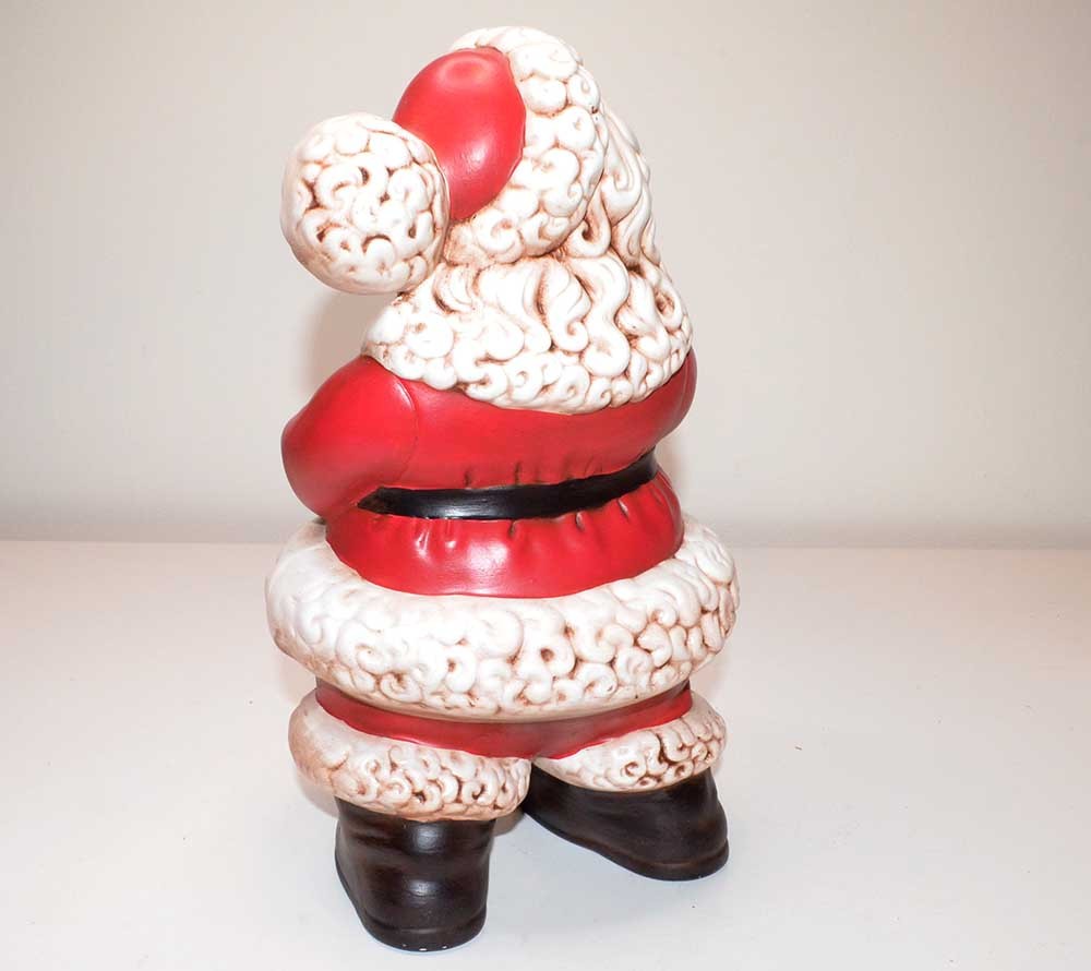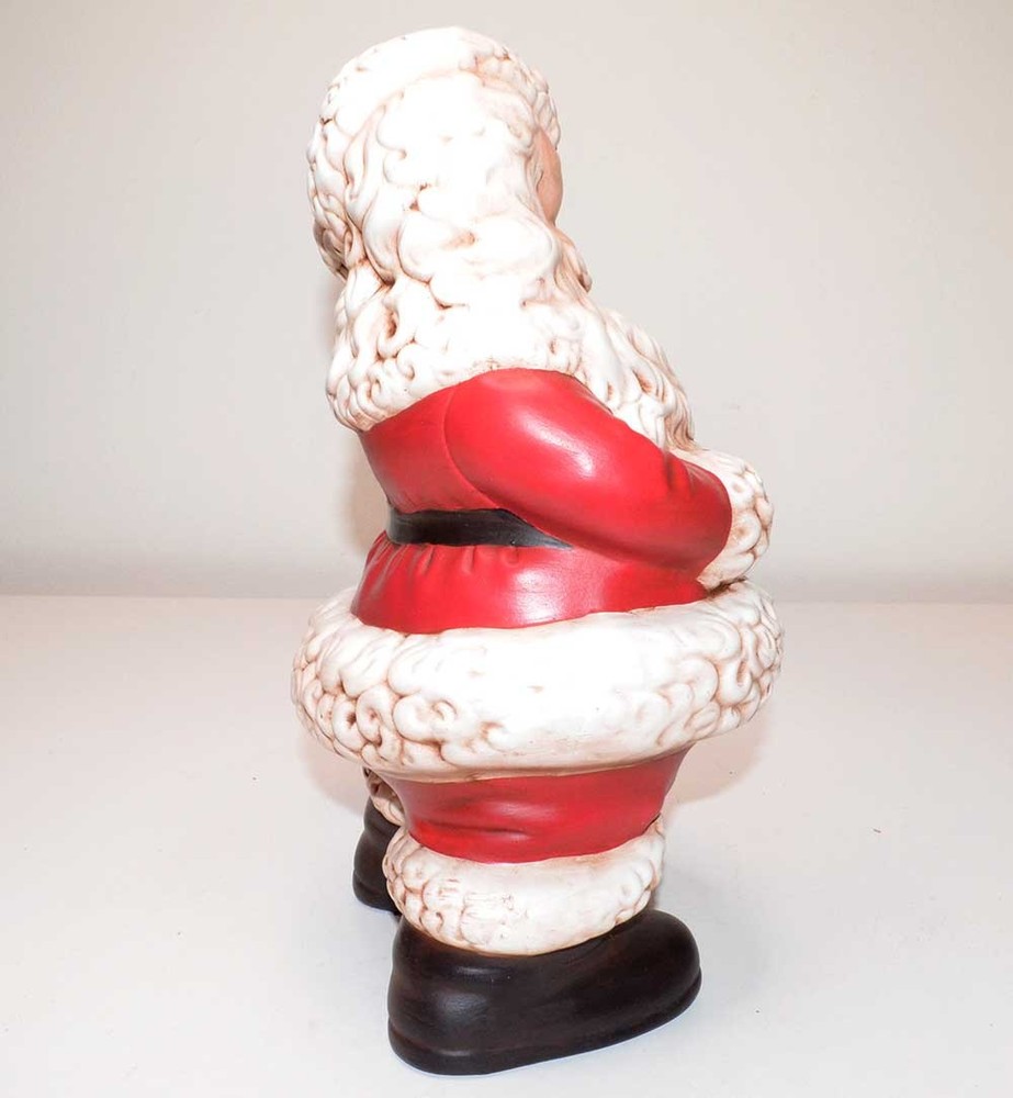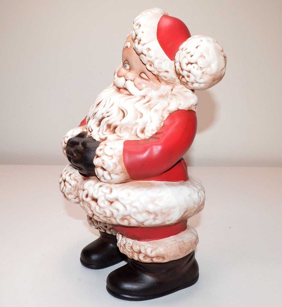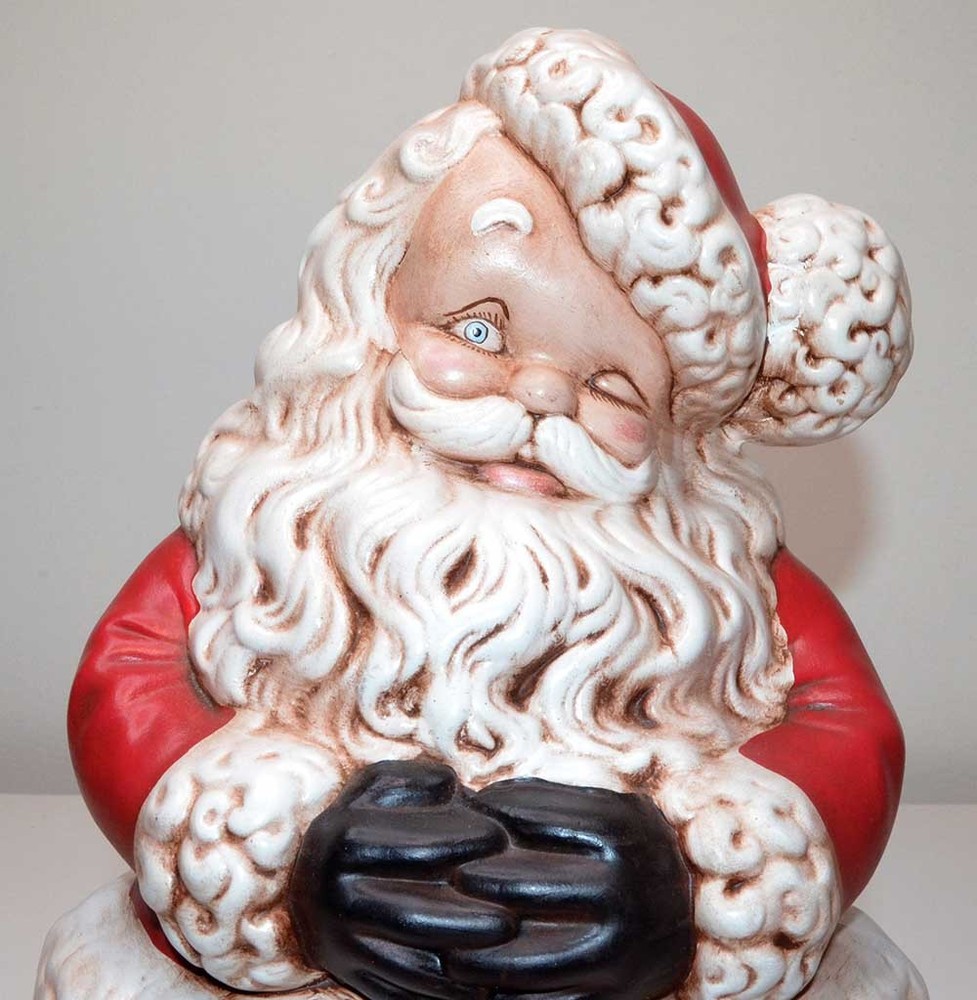 Vintage Ceramic Winking Santa Claus Atlantic Mold 14 in. Hand Painted Christmas Excellent 46 year old condition. No chip, cracks or repairs. The Vintage Ceramic Winking Santa Claus statue by Atlantic Mold is a charming addition to any Christmas decor. Standing at 14 inches tall, this hand-painted ceramic Santa Claus features a unique winking expression that adds a playful touch to the holiday season. Made in the United States, this medium-sized statue is perfect for any room in your home, bringing a nostalgic and festive feel to your seasonal display. Capture the magic of Christmas with this handmade, painted ceramic Santa Claus figure that is sure to become a cherished part of your holiday traditions.