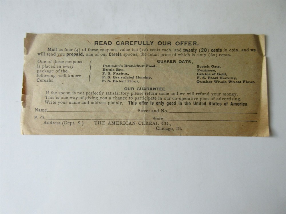 Vintage Cereta Silverware Coupon for a cereal spoon < > measures 7" x 3" RAC328 has been listing on eBay since 1999 with over 30,000 successful transactions. Please look at my store. You may be interested in our other eBay listings . Powered by SixBit's eCommerce Solution