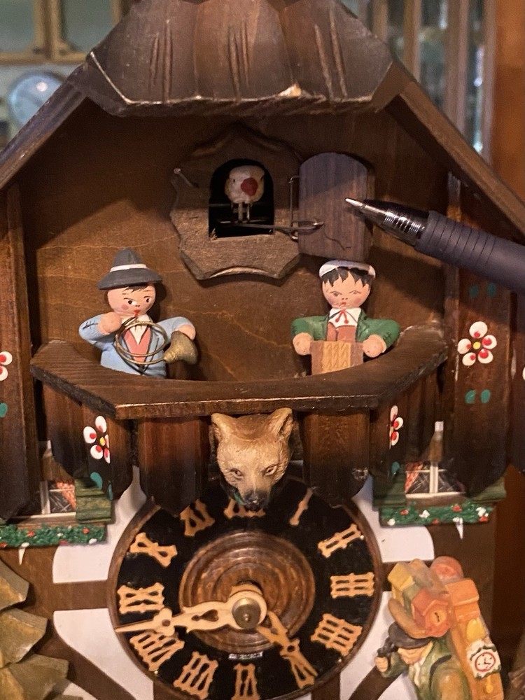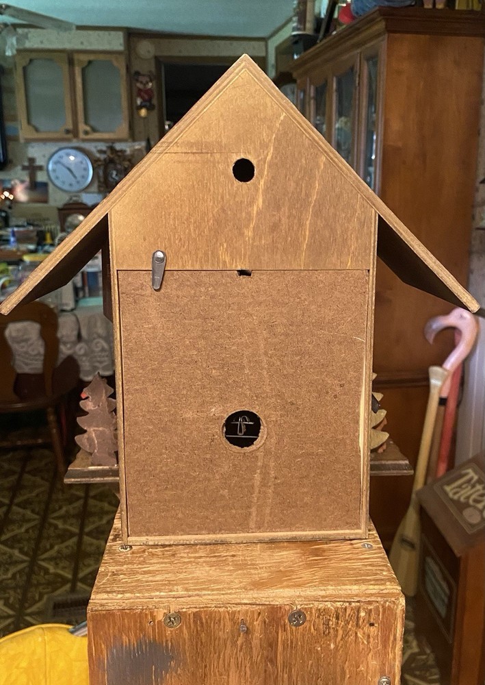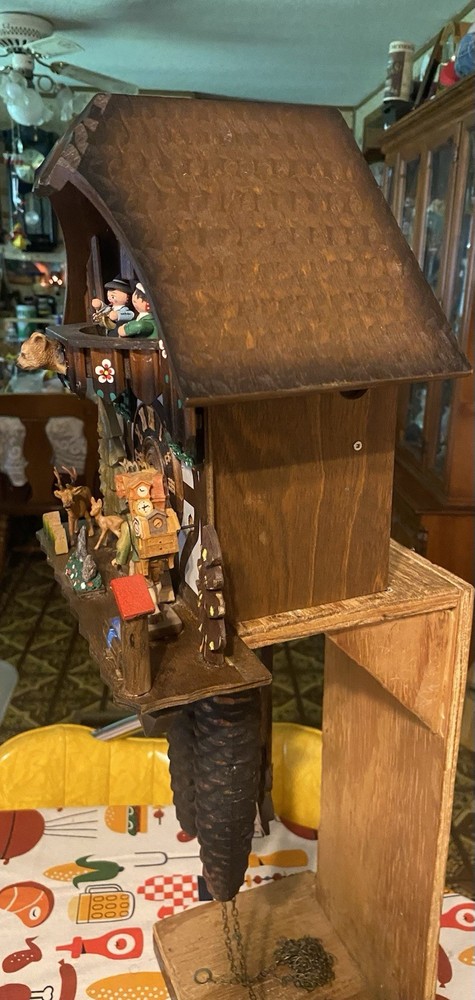 Vintage Rare Chalet 8-Day Band Members / Clock Peddler Cuckoo Clock 9 1/2 x 11 1/2 x 7. ……One day weight driven clock. …..Germany. ……. sculpted chalet roof. Hand painted flowers. ….Easy to read 3 inch wood, dial with raised brown Roman numerals and brown hands. ……….Windows, shutters, and flower boxes. Balcony has two band members, a Horn and accordion player. ………a Trophy bear head on the balcony, trees, water trough, wood piles, rocks, Buck and doe deer, and a cuckoo clock peddler, whose arm with umbrella goes up and down as the clock cuckoo’s. …….On off switch for night time if desired. ……Cuckoo‘s the counted hour, half hour, strikes the gong, and keeps correct time too. ……. See pictures………. 2 weights and pendulum are included with unpacking and set up instructions……. . See pictures……….