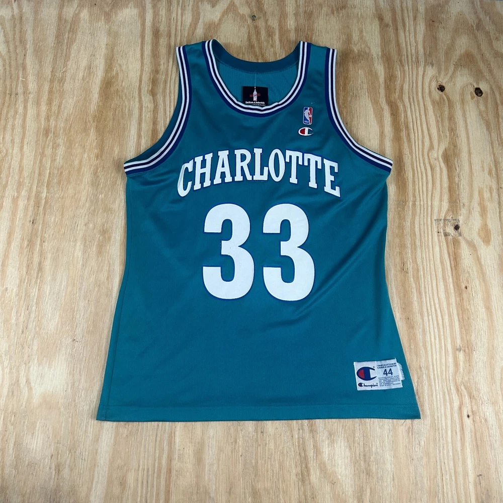 Own a piece of basketball history with this vintage Champion Charlotte Hornets Alonzo Mourning #33 jersey. This blue jersey is a size 44 and features Mourning's name and number, making it a great addition to any fan's collection. The jersey is from the 90's and is in great condition, perfect for wearing to games or displaying in a fan cave. This jersey is an official piece of NBA memorabilia and is a must-have for any basketball fan.