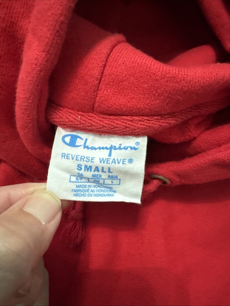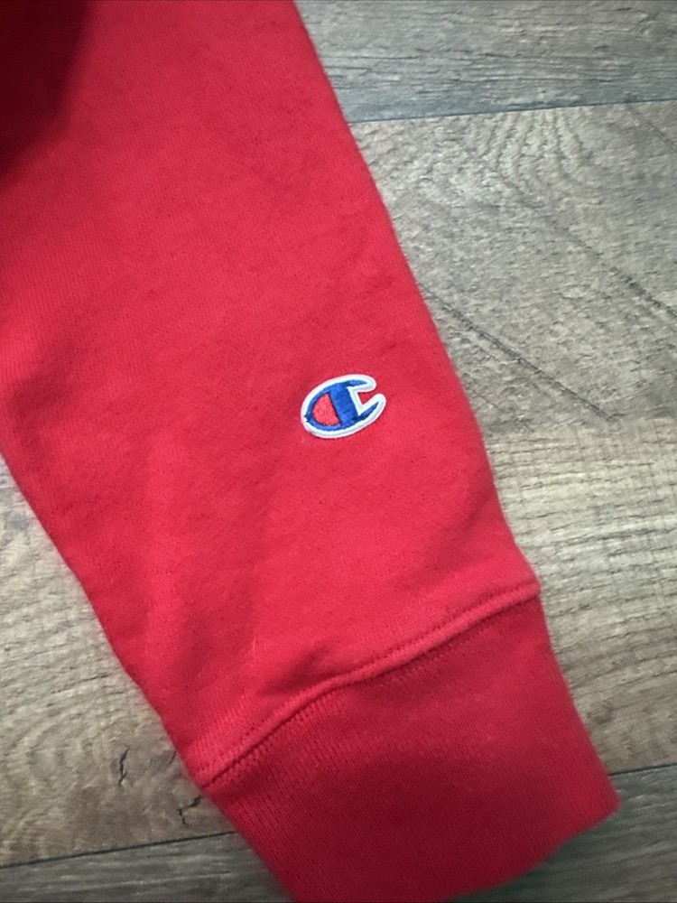The Vintage Champion Red Hoodie Sweatshirt in Men's size Small is a classic piece made of a comfortable cotton blend material. This pullover hoodie features a solid red color with a retro logo accents, perfect for adding a touch of nostalgia to your wardrobe. With a regular fit and long sleeves, this hoodie is ideal for the cooler seasons of winter, fall, and spring, making it a versatile garment for gym training and casual everyday wear. Machine washable for easy care, this Champion Reverse Weave hoodie is a timeless wardrobe staple for any fan of vintage fashion.