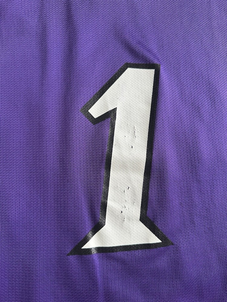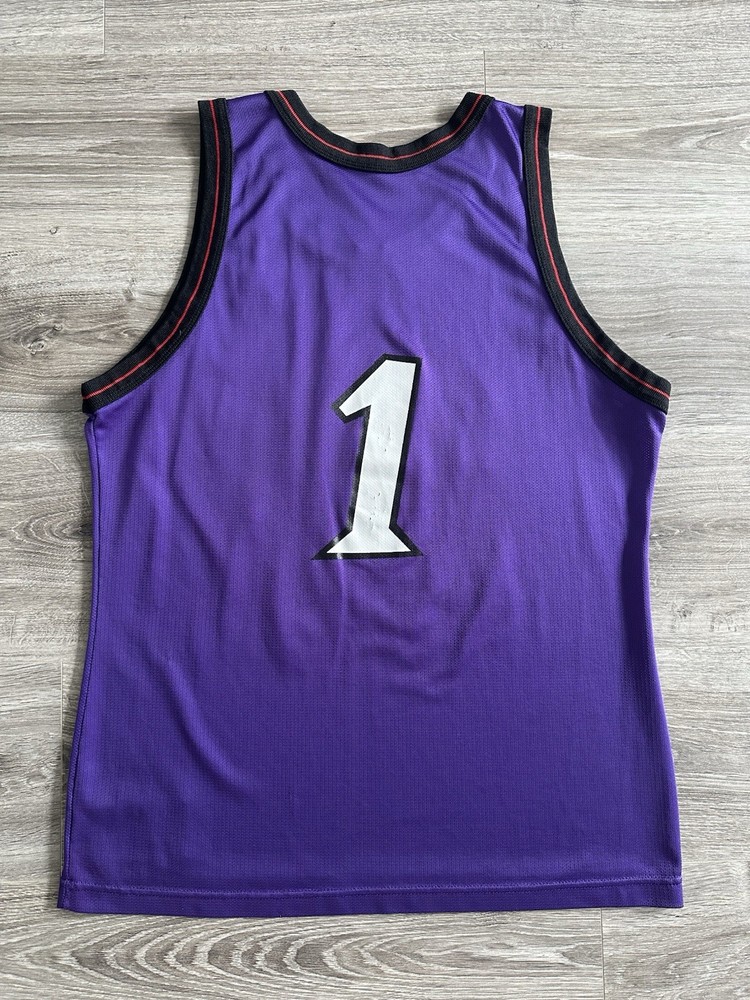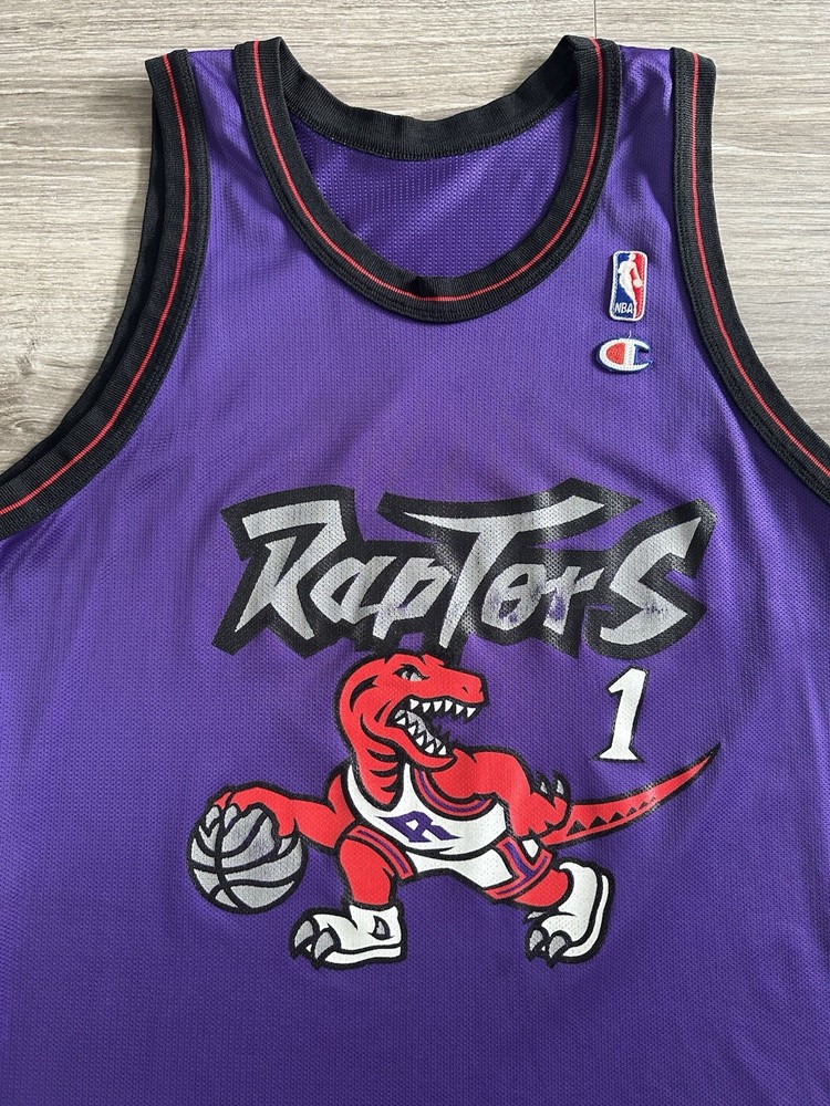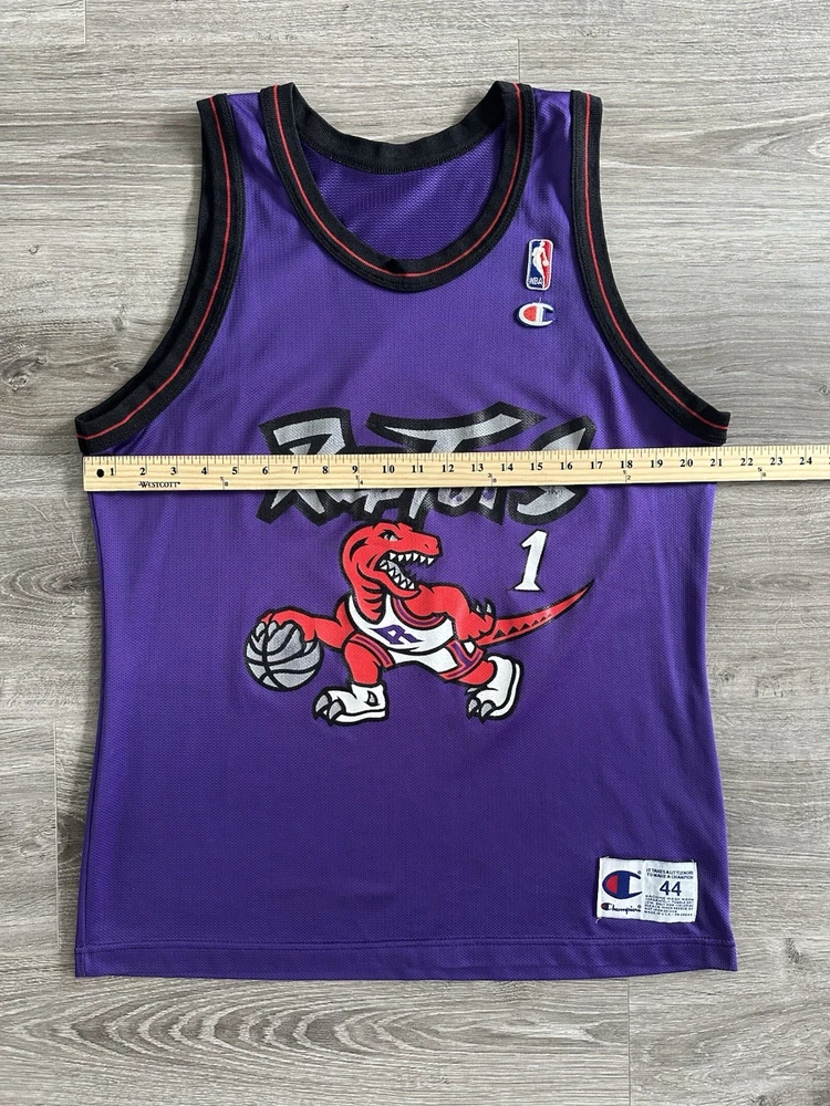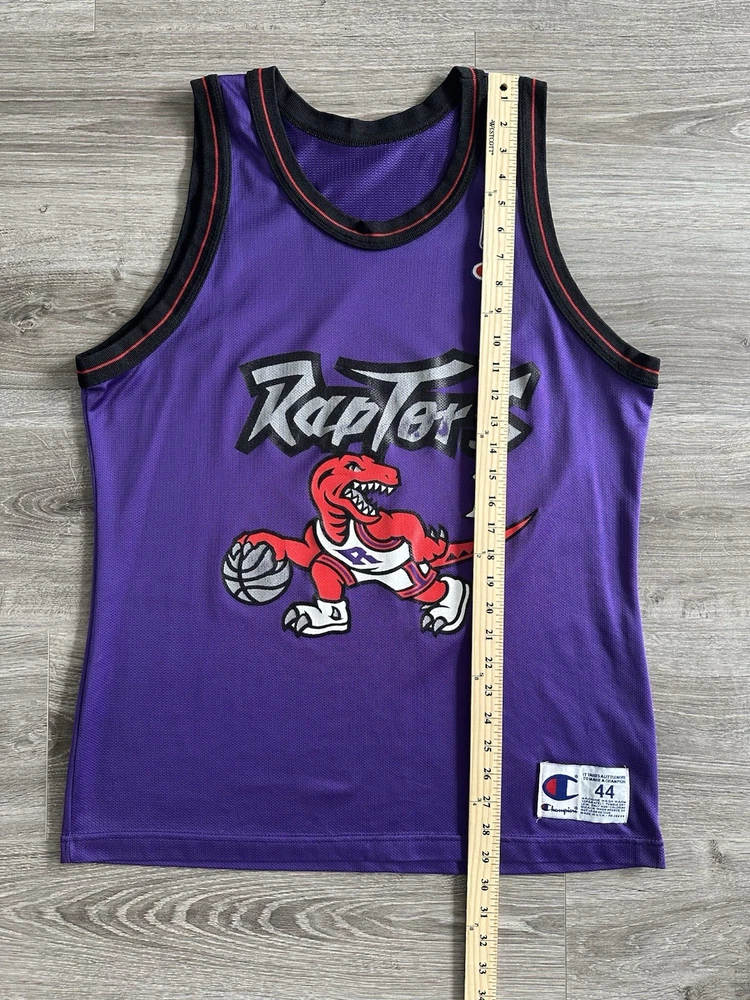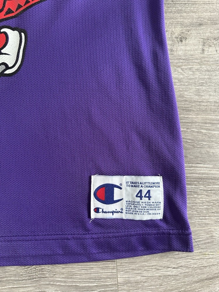 Step back in time with this rare vintage Champion Toronto Raptors jersey, a must-have for any true basketball aficionado or collector of NBA memorabilia. This size 44 (Large) jersey, once worn by the legendary Tracy McGrady, boasts the iconic purple of the Raptors and is a proud testament to the team's legacy in the regular season. Crafted in the United States, the jersey stands out with its classic design, ideal for displaying your Raptors pride or adding to your collection of sports treasures. The piece captures the essence of the sport and the era it represents, making it a timeless addition to any fan's wardrobe or archives. Measurements shown in photos