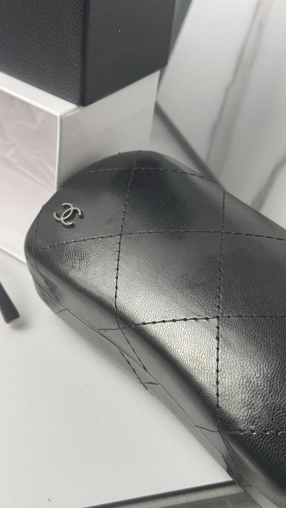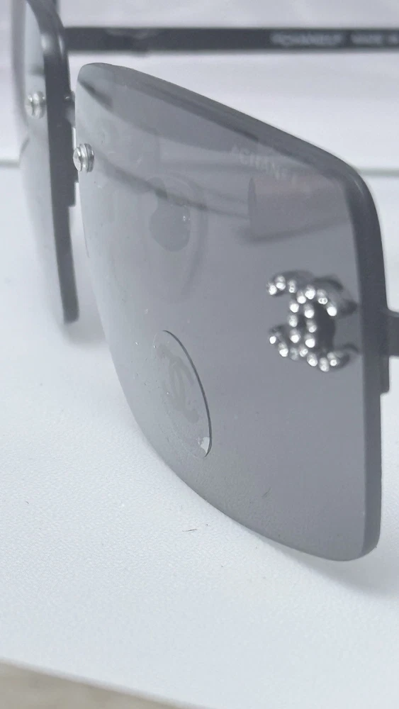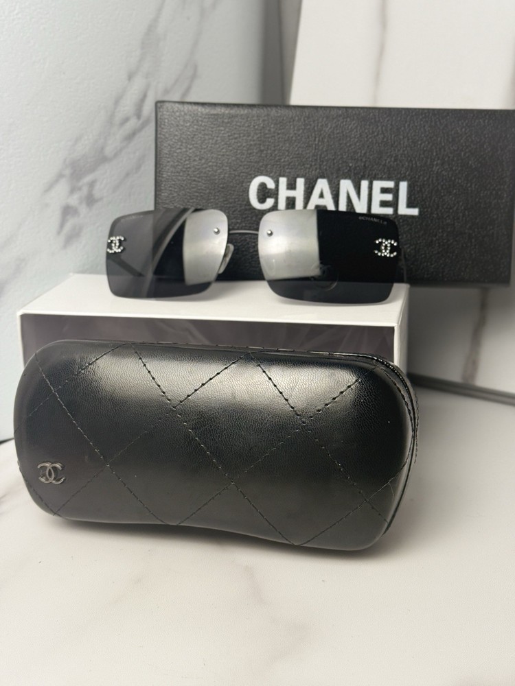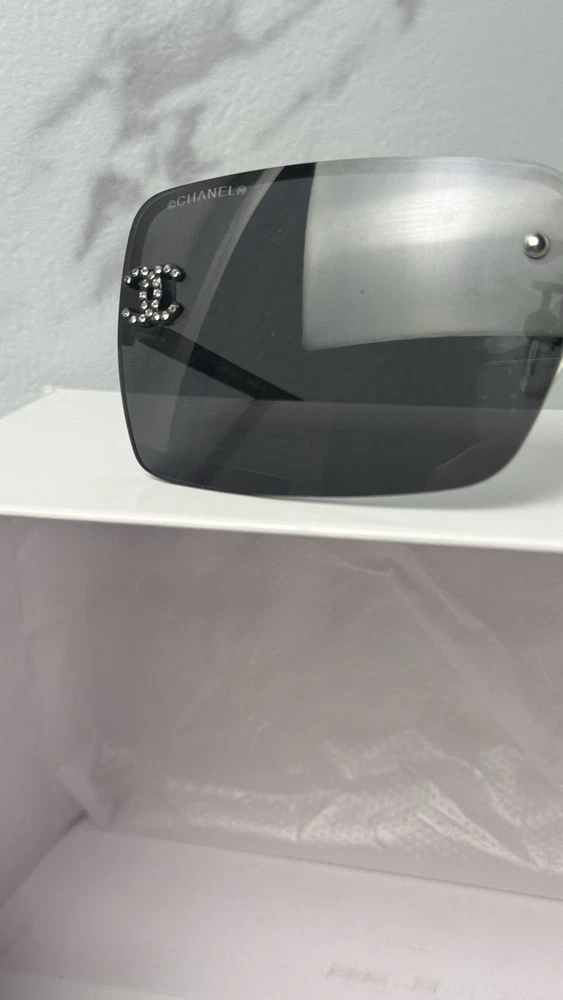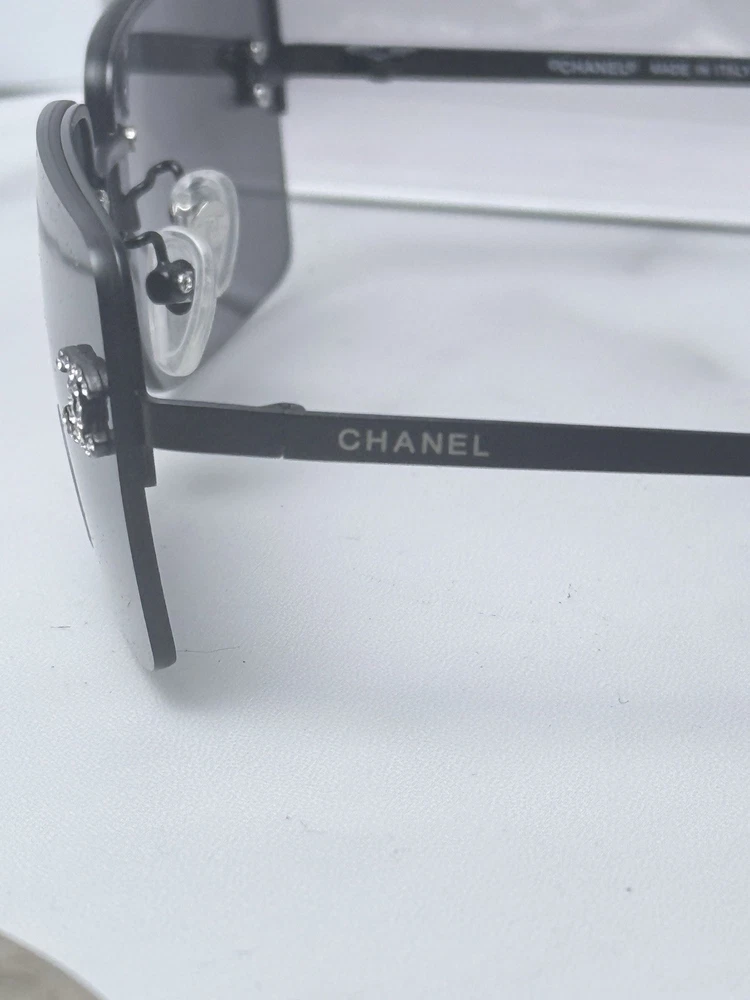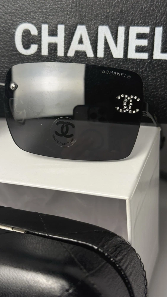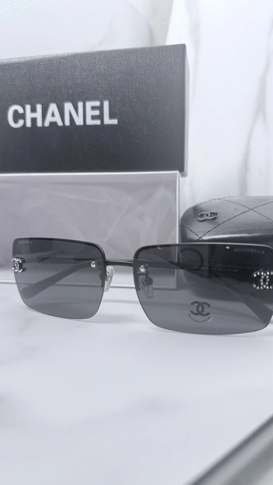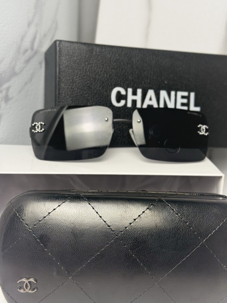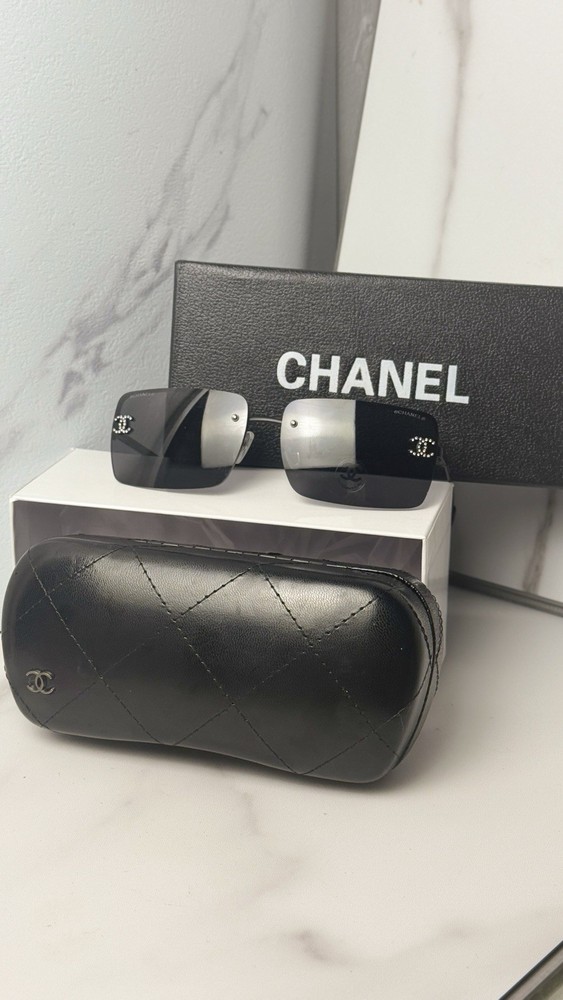 The vintage Chanel Black Rimless Sunglasses are a stylish and iconic accessory for women. Featuring a square design with a black frame and polarized black lenses, these sunglasses are a classic piece from Chanel's collection. The rhinestone CC logo adds a touch of luxury to the metal frame, making them a timeless and elegant choice for any outfit. Made in Italy, these sunglasses come in a chic case with a cloth for easy storage and maintenance. Perfect for adding a touch of sophistication to any ensemble, these Chanel sunglasses are a must-have piece for any fashion-forward wardrobe.