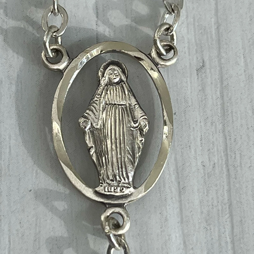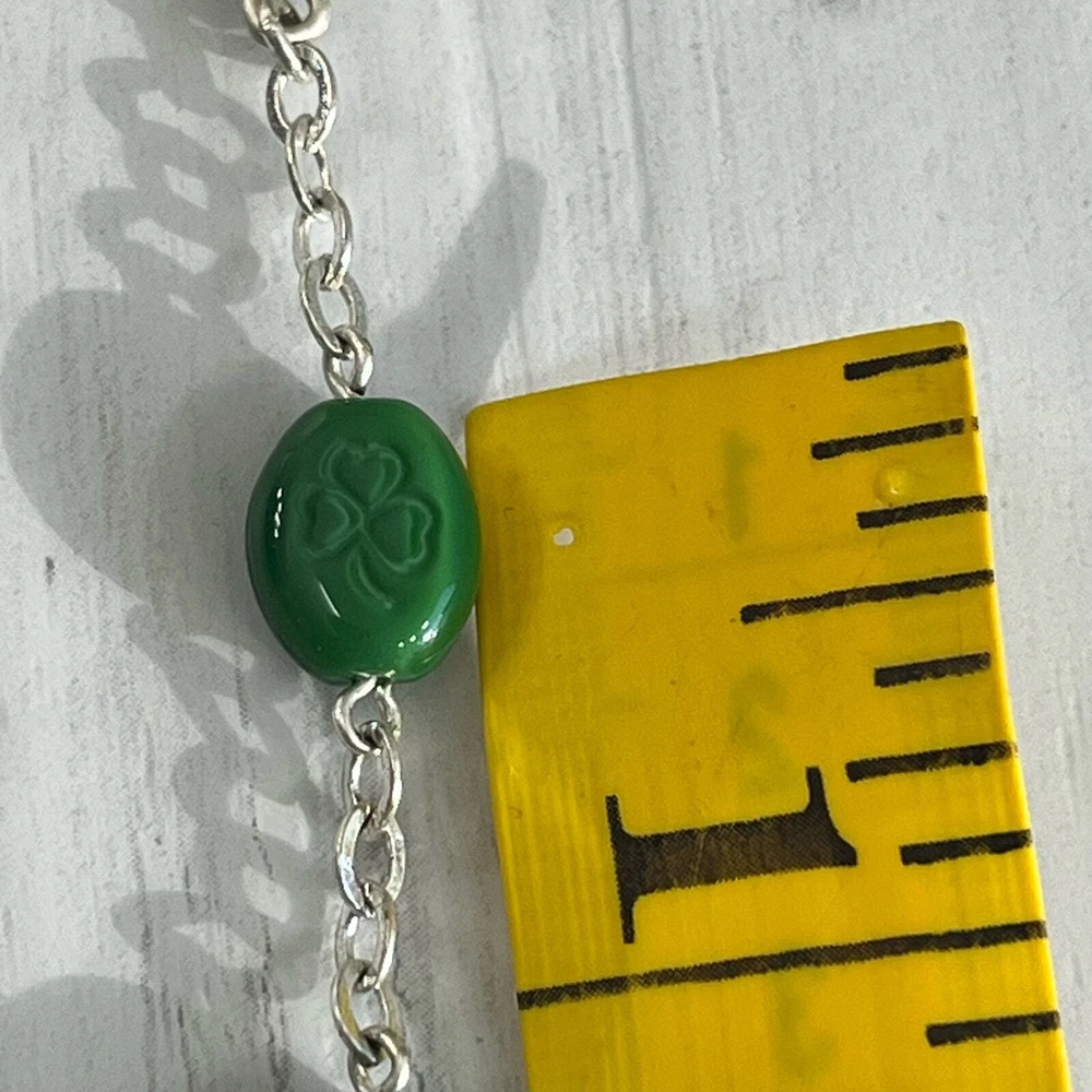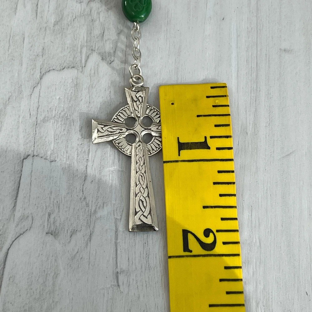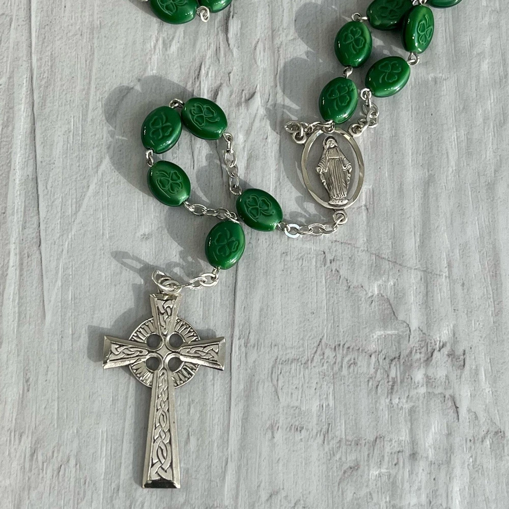 Vintage Chapel Sterling Green Shamrock Glass Bead Celtic Cross Mary Rosary Beads Length- 26" Cross length- 1.75" Additional measurements available upon request All measurements are approximate All measurements are taken with item laying flat Double bust, waist, & hip for measurement all the way around Colors may differ based on others computer/phone/etc settings All pre owned items have been washed and steamed All pre owned items have been looked over for flaws and will be noted in listing