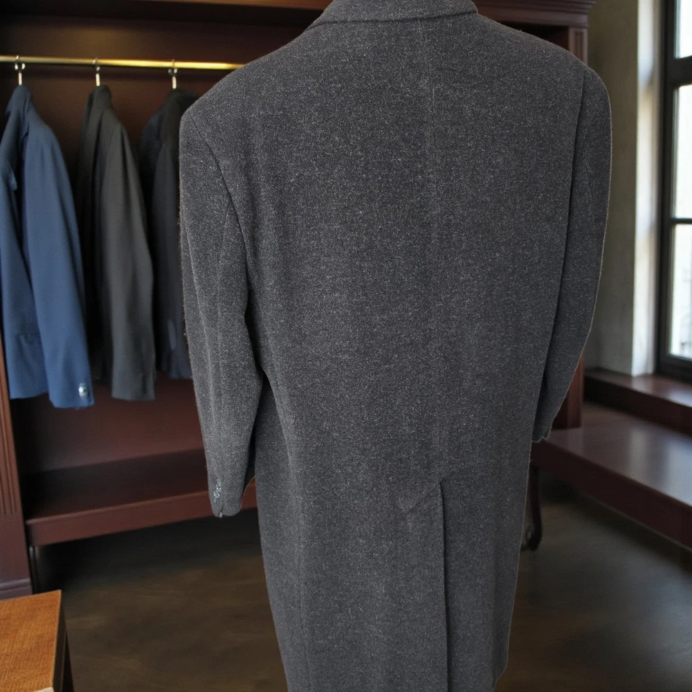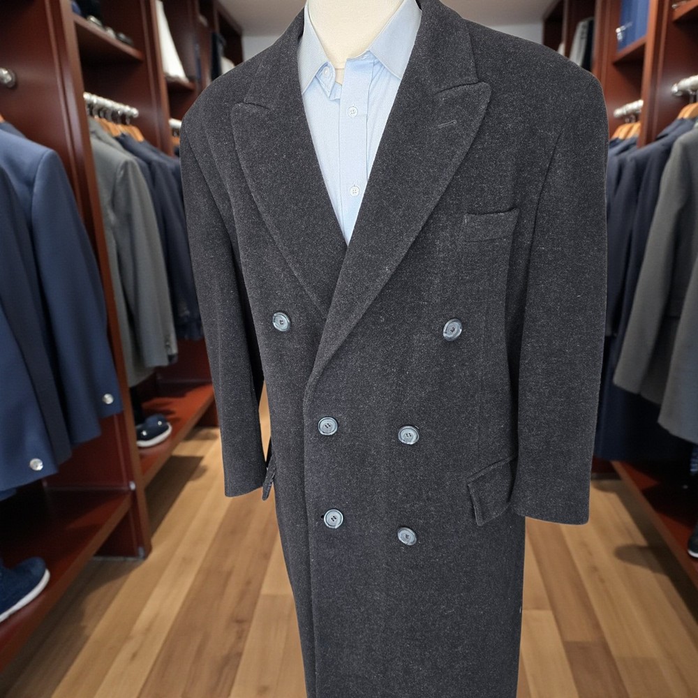 Size: 44S USA with ***24-inch arm length*** and a jacket length of 45 inches. For complete measurements, see photo #2 To see exactly how we measured, see the last series of photos. Condition: excellent vintage condition. No holes , no snags, no smells, no stains Woven in Italy, lambswool flannel, light shoulder pads, medium weight Return policy: We offer free shipping and no returns. We can not afford to offer both in the highest return category on eBay. It becomes very expensive to mail out items for free for people to try on if they are not confident in checking the measurements in picture #2. If you prefer to have the ability to return the item and pay $17.95 shipping, please send us a message, and we can change the listing format to offer returns. The $17.95 shipping cost would break us out even in the case you needed to return the item. You must contact us upfront to make sure the owner of this consigned item is OK with an option to return. We ship the next business day after the payment is made.