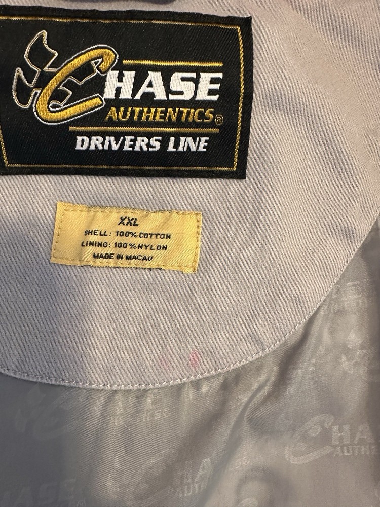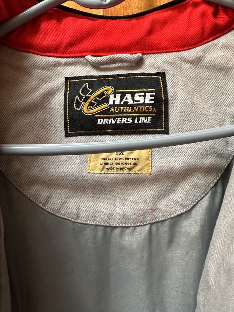 The Vintage Chase Authentic Sterling Marlin Jacket is a officially licensed NASCAR jacket featuring the driver Sterling Marlin. This 2XL men's jacket is from the brand Chase and was made in Hong Kong. It is perfect for fans of auto racing and will show your support for Sterling Marlin as a legendary driver in the sport. Made with high-quality materials, this jacket is a must-have for any NASCAR enthusiast looking to add a piece of memorabilia to their collection. Small amount of red color transfer under size label inside jacket and on mountain on back lower left of jacket.