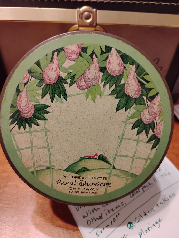 The antique Cheramy tin features the brand name "Cheramy - April Showers" and is specifically a Poudre de Toilette tin for talcum powder. The tin is multi-colored and original, showcasing a vintage design that reflects the theme of talcum and bath powder. This collectible advertising piece would be a unique addition to any collection focused on health and beauty products or vintage advertising memorabilia.