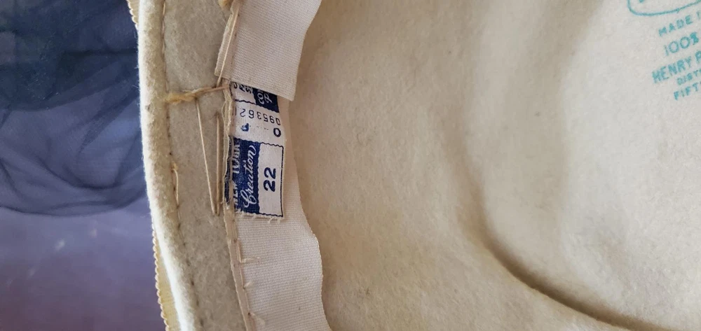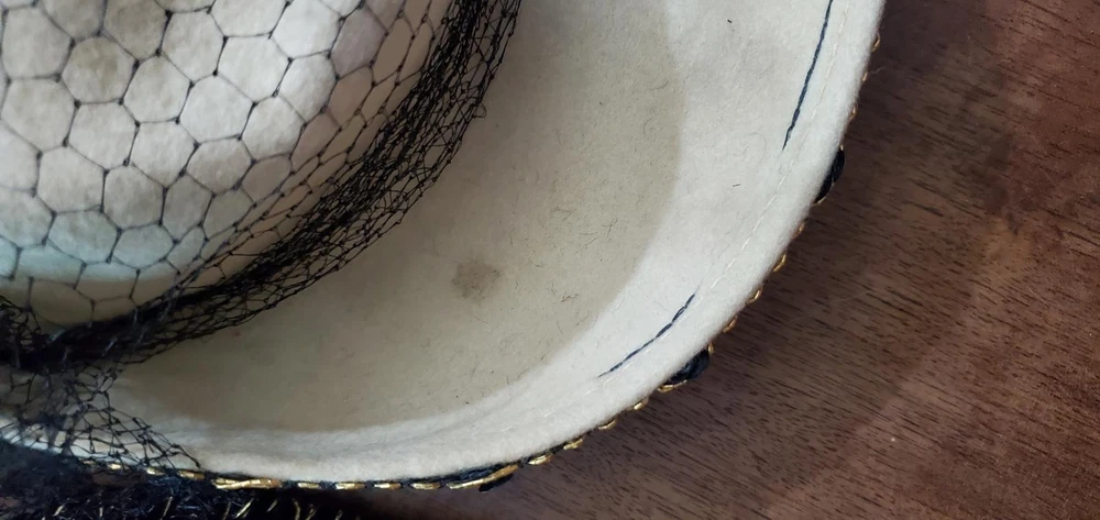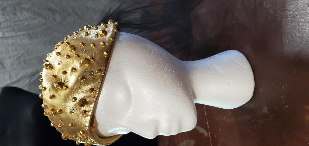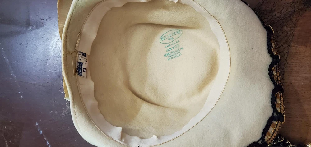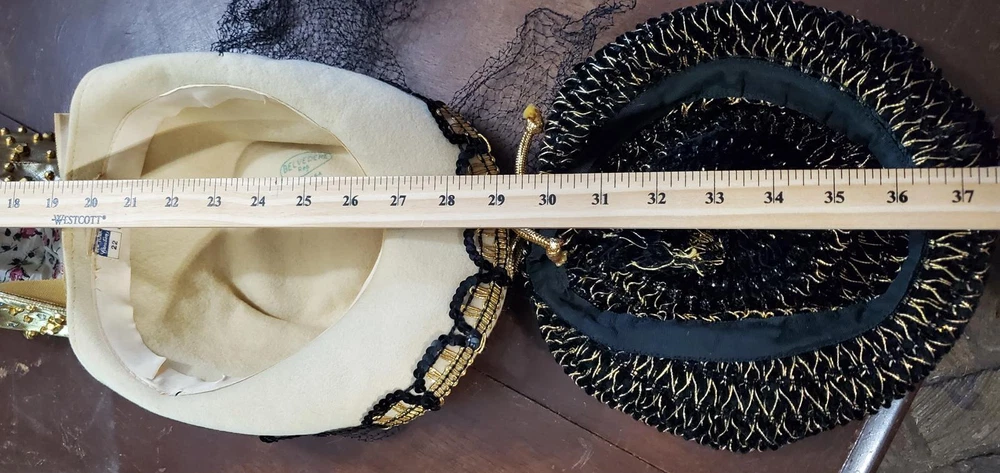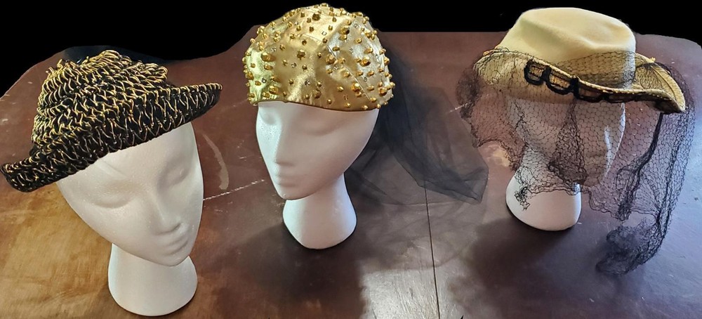 Elevate your accessory game with this stunning vintage hat collection featuring three unique pieces. Each hat offers a distinct style perfect for any occasion. - Gold studded hat with elegant black tulle: A statement piece designed by Patrice, featuring charming floral lining. - Classic hat with black netting: Perfect for sunny days or a stylish brunch. - Trendy woven straw hat: A fashionable addition to any outfit, wool, Brand is Belvedere Whether you're dressing up for a special event or adding flair to your everyday look, these hats are sure to turn heads. Available for pick-up in Lakeland, FL Shipping available See images for measurements