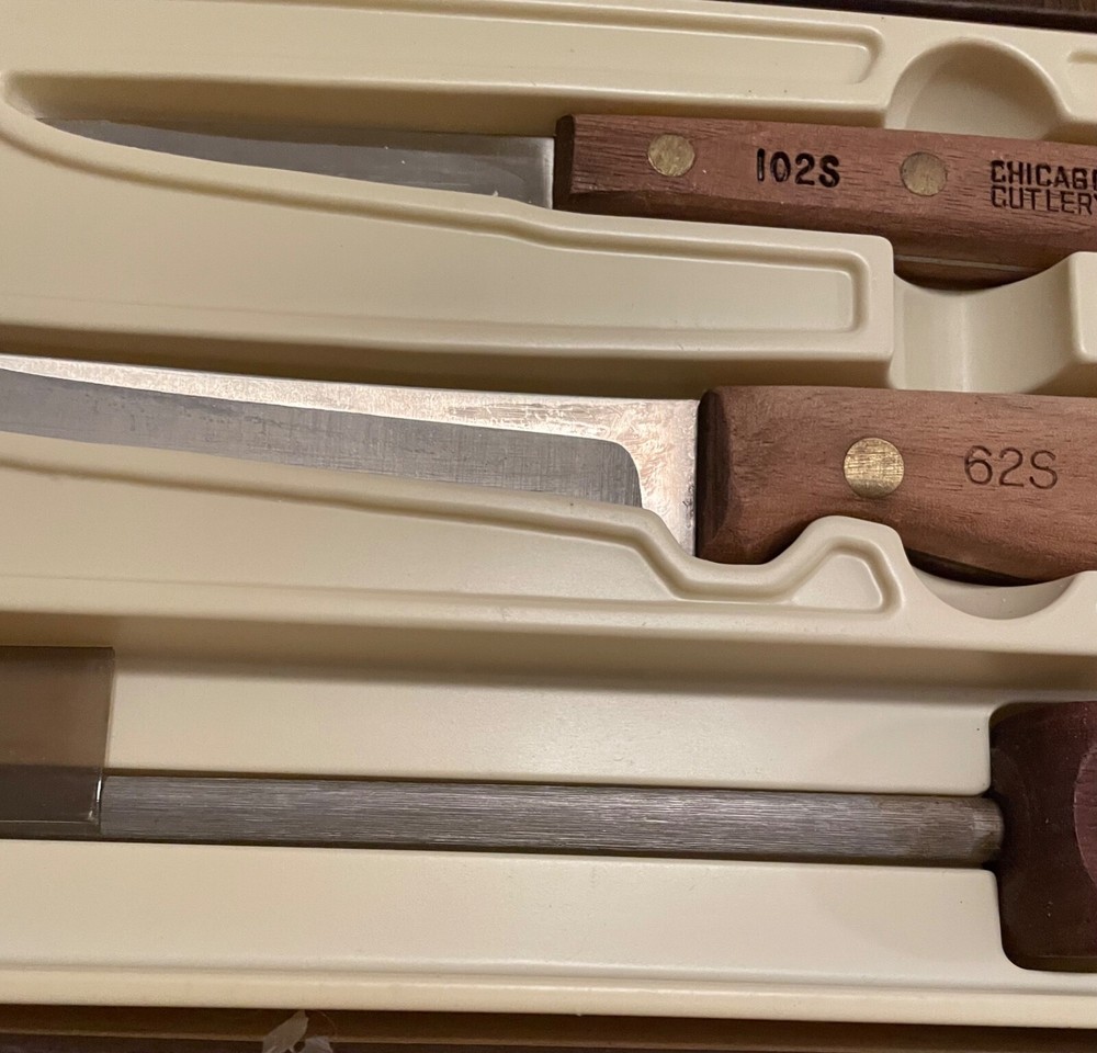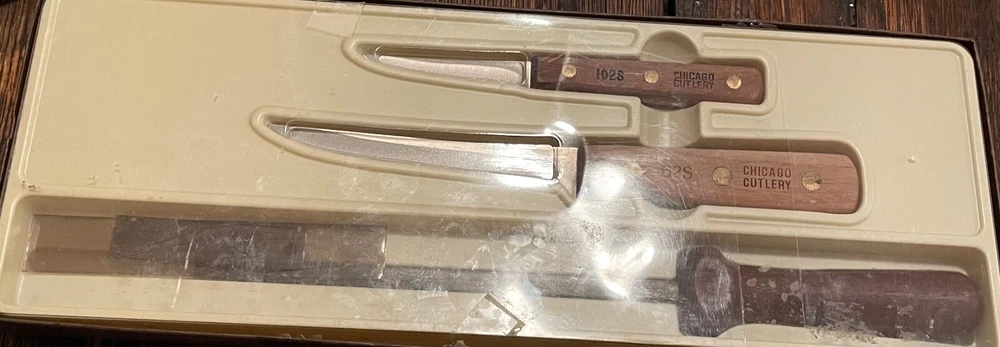 HomeVintage Chicago Cutlery 3 Pc. Knife Set 62S & 102S, Sharpener Walnut Wood