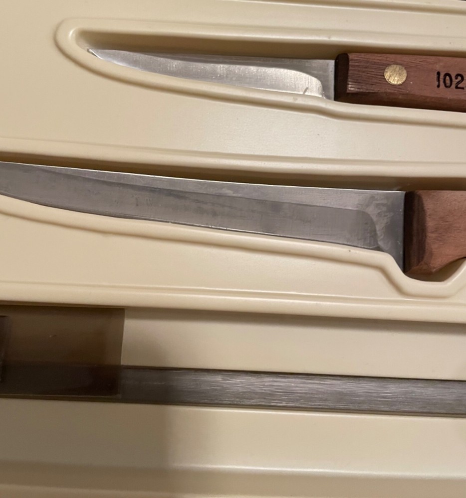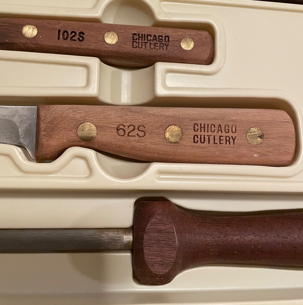Vintage Chicago Cutlery 3 Pc. Knife Set 62S & 102S, Sharpener Walnut Wood